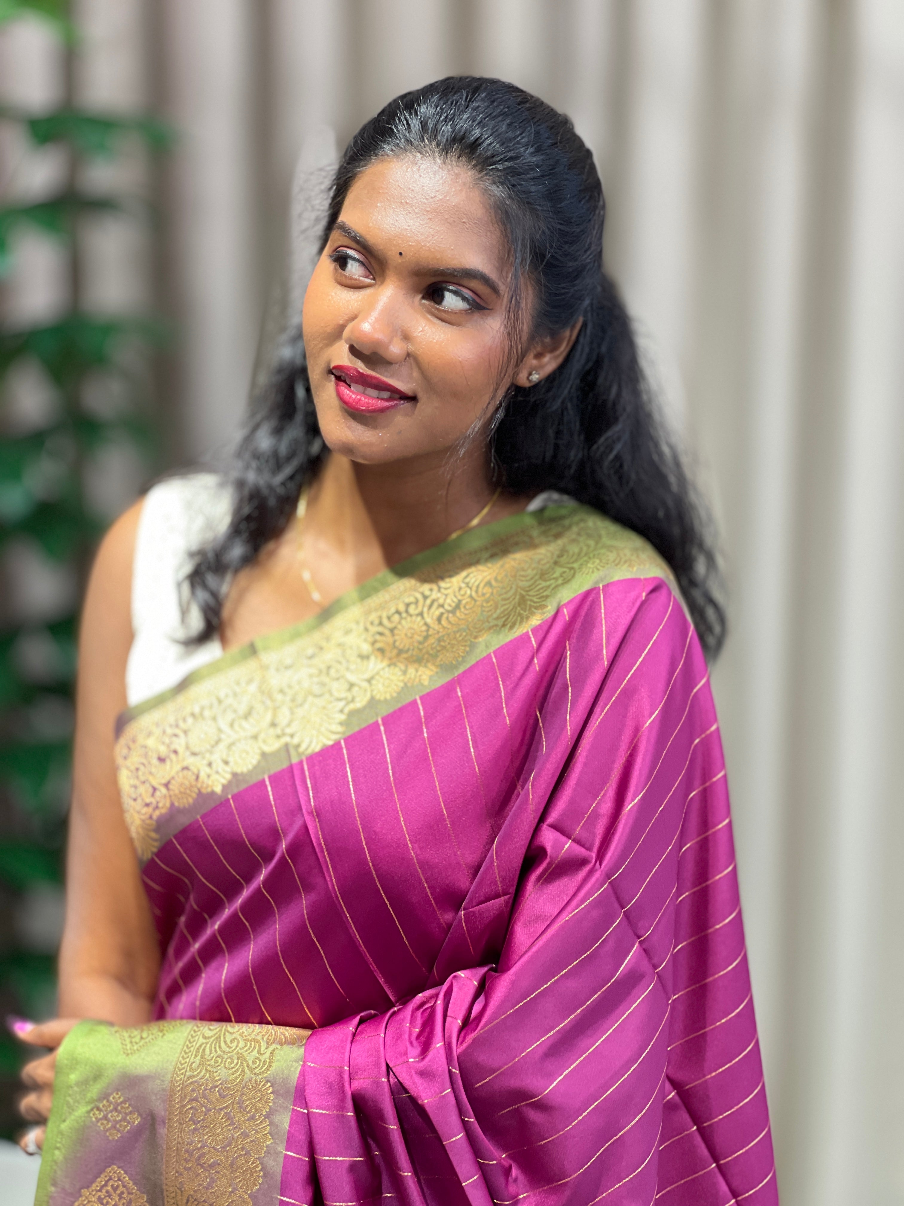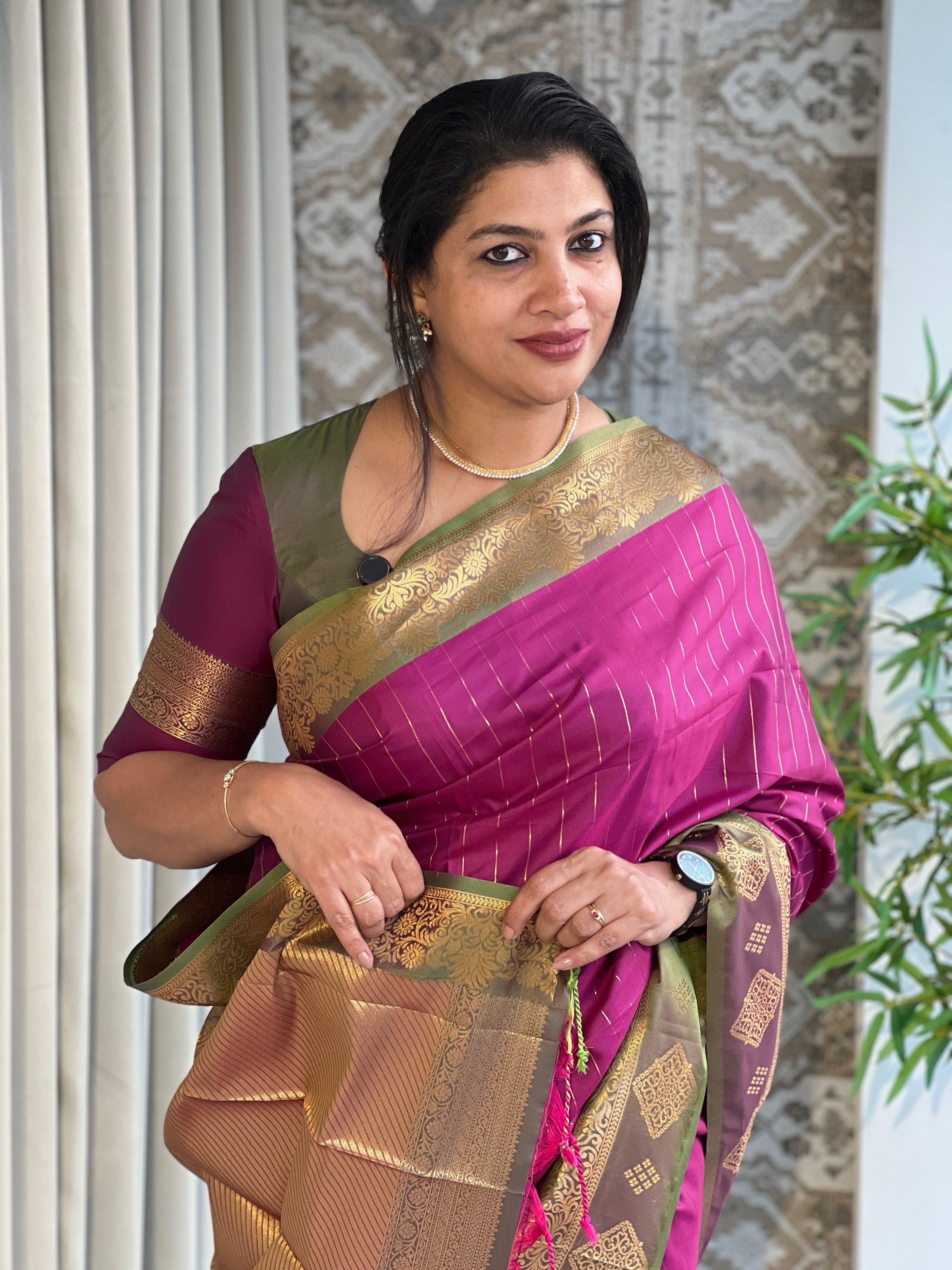 • Style: Zari Woven Stripe Pattern, Traditional Zari Woven Borders, Diagonal Patterned Pallu, Contrast Borders