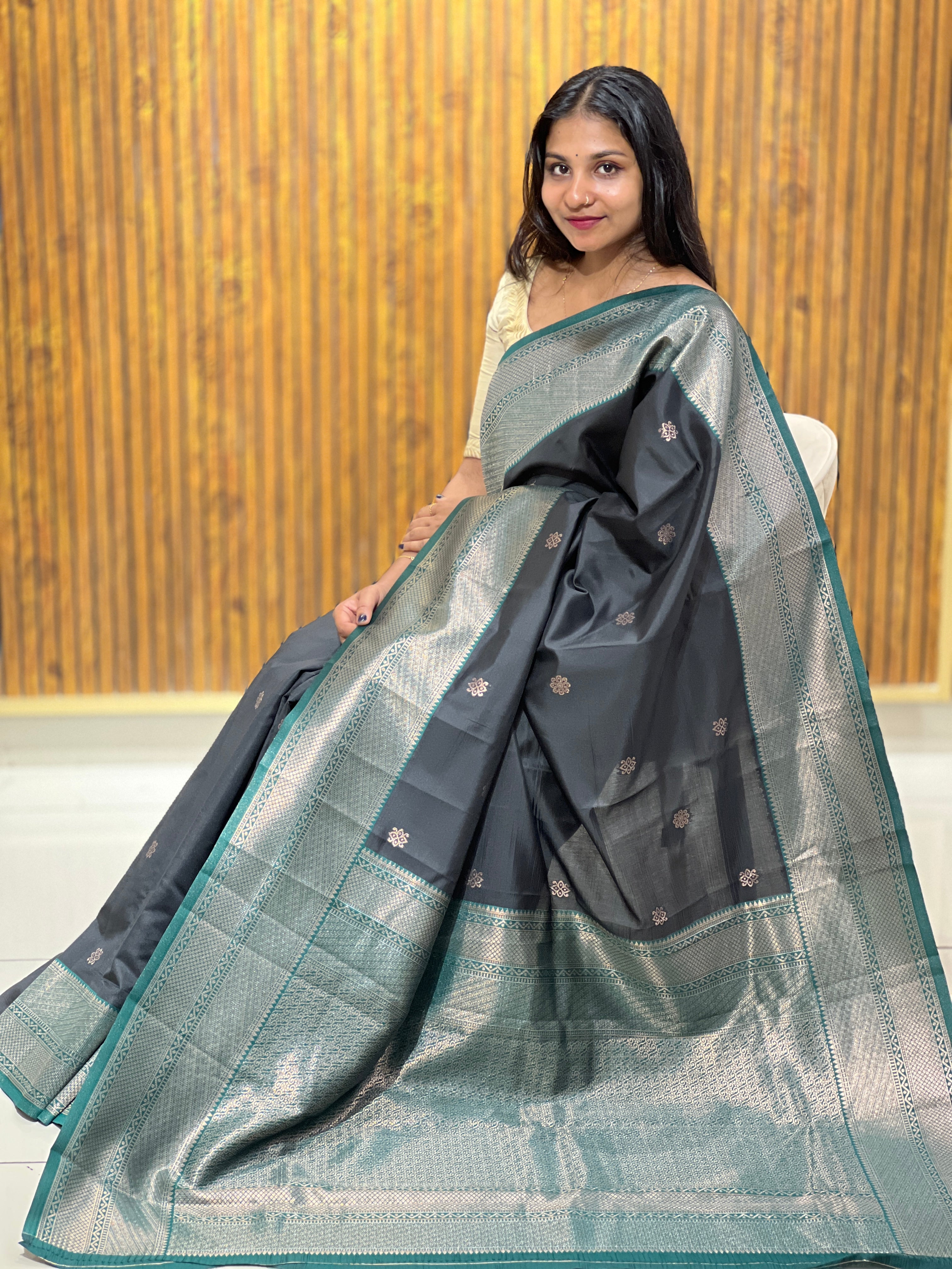 - Style: Zari Woven Scattered Buta, Diamond & Diagonal Patterned Borders, Contrast Borders & Pallu, Brocade Patterned Pallu