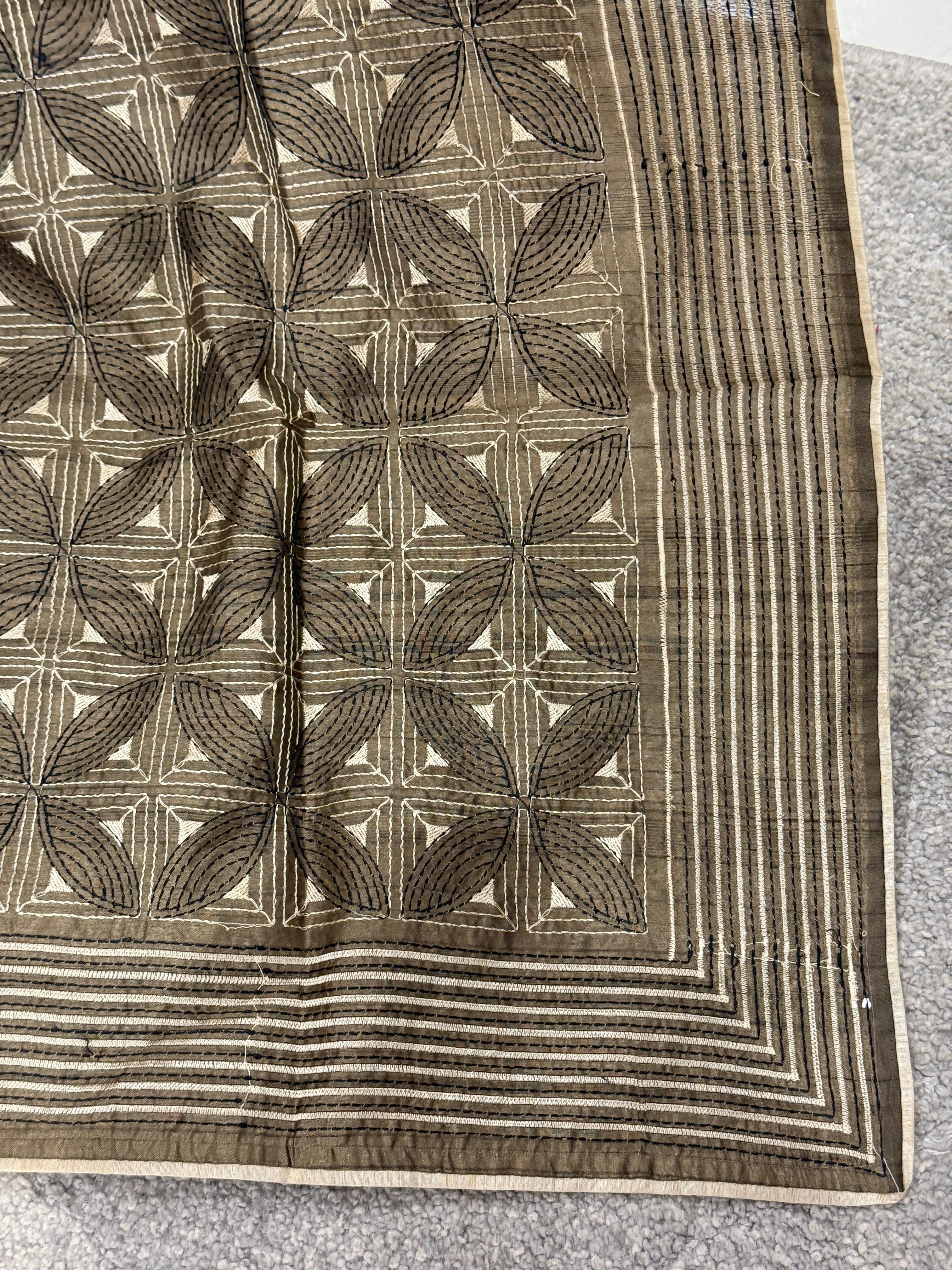 • Style: Embroidered Square Pattern On Upper Portion, Scattered Embroidery Square Pattern On Lower Portion, Embroidered Line Patterned Borders, Flat Facing Edges