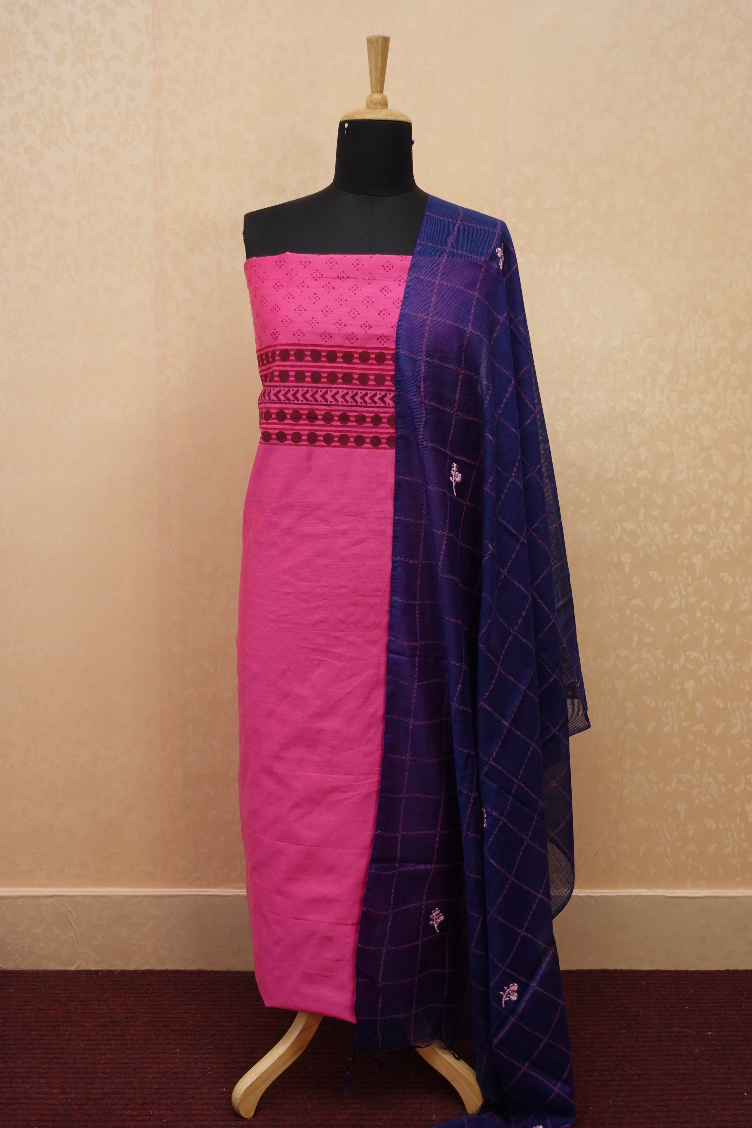 Contrast combination of exquisite top and dupatta sets with semi silk top material holding block printed designs on the yoke portion. The top is paired with a Kota dupatta of scattered computerised machine embroidery work done in floral arrangements.