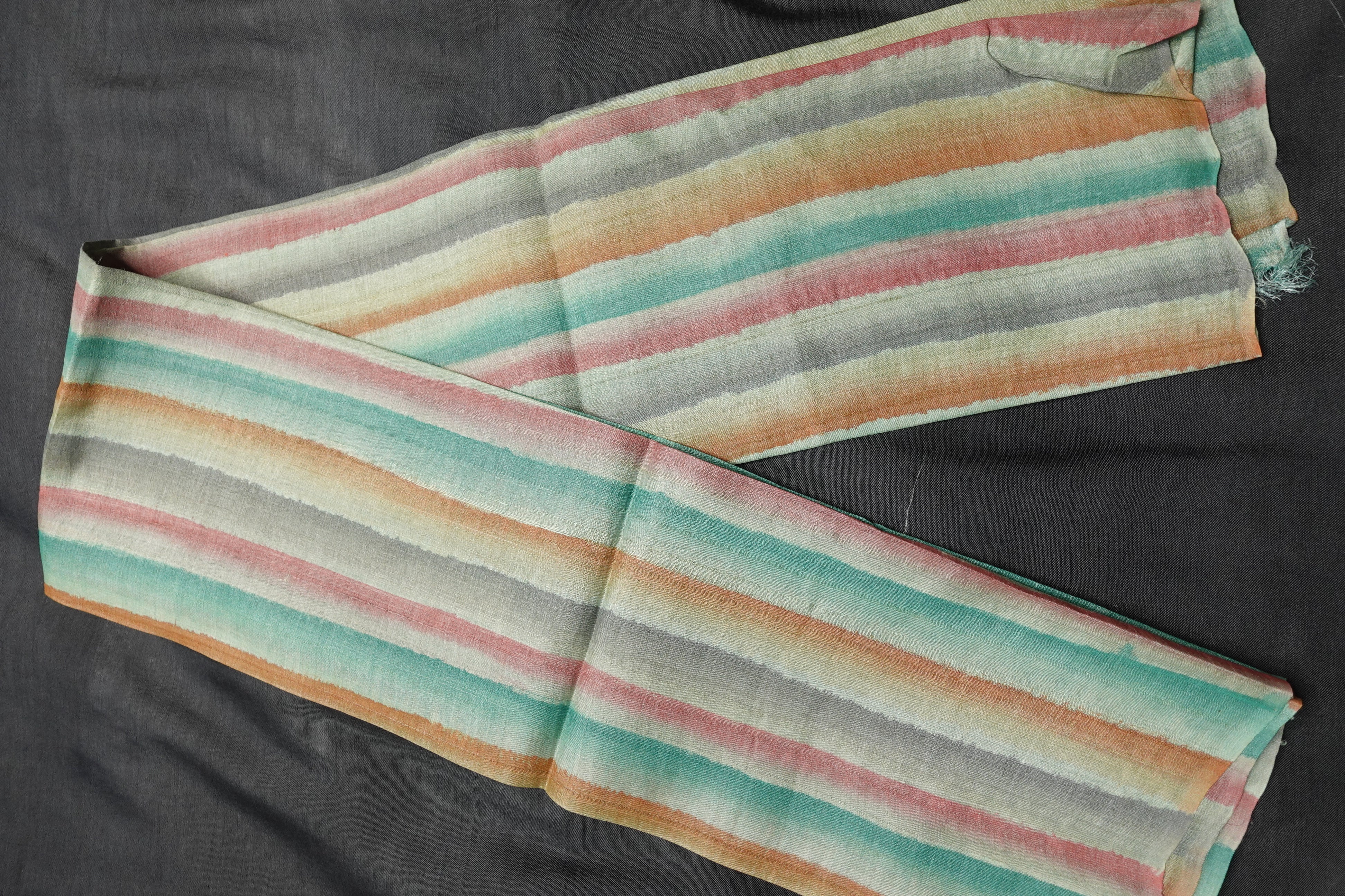 Vibrant Multicolored Desi Tussar blouse materials are devised in geometric and vertical lined patterns. These fine quality blouse materials are of unique color combinations and can be best paired with plain sarees to attain a fashionable and ethnic look. You can get these stitched in your preferred pattern.