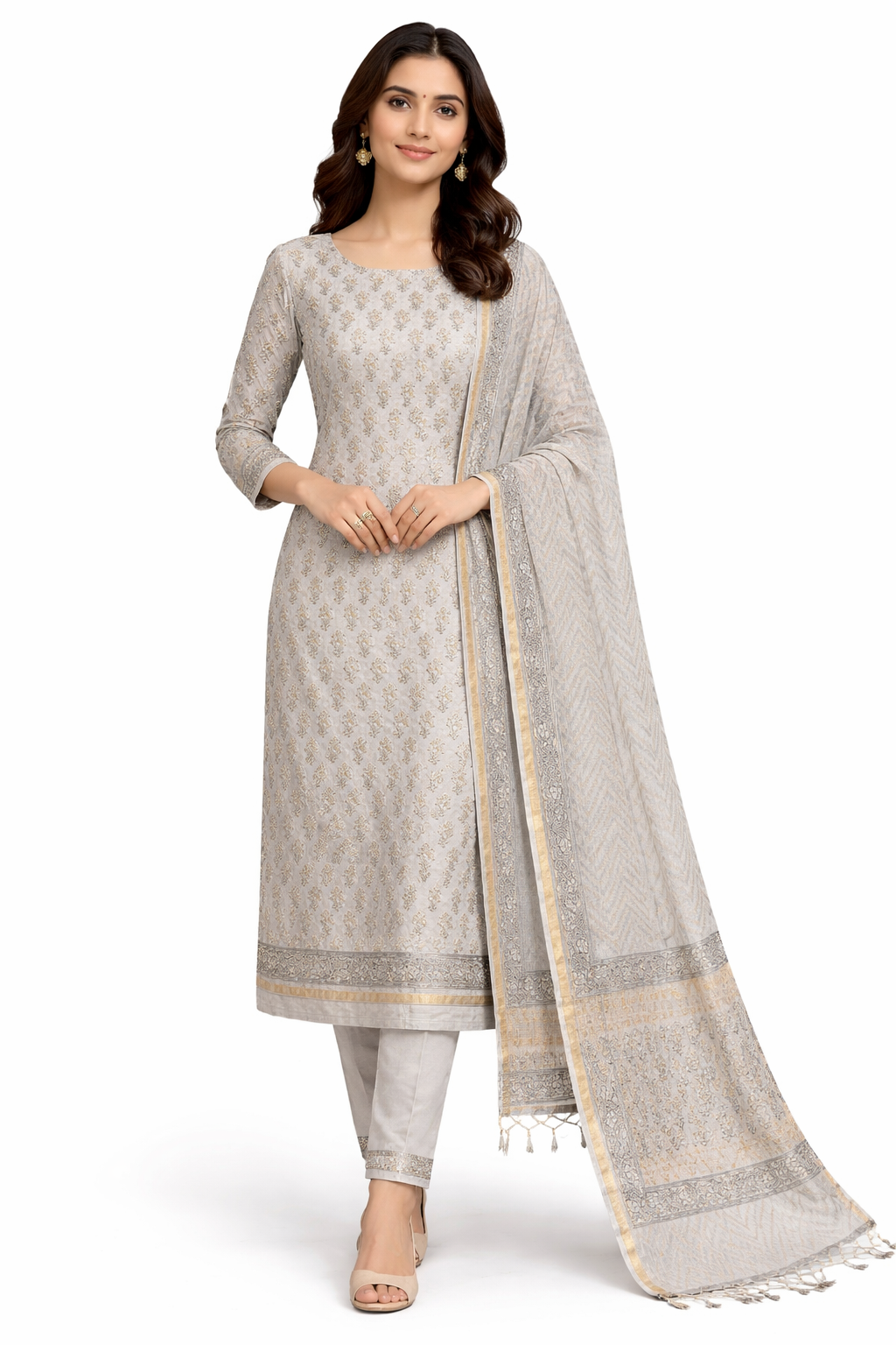 - Style: Printed, Zari Weaved Border, Tassels Attached