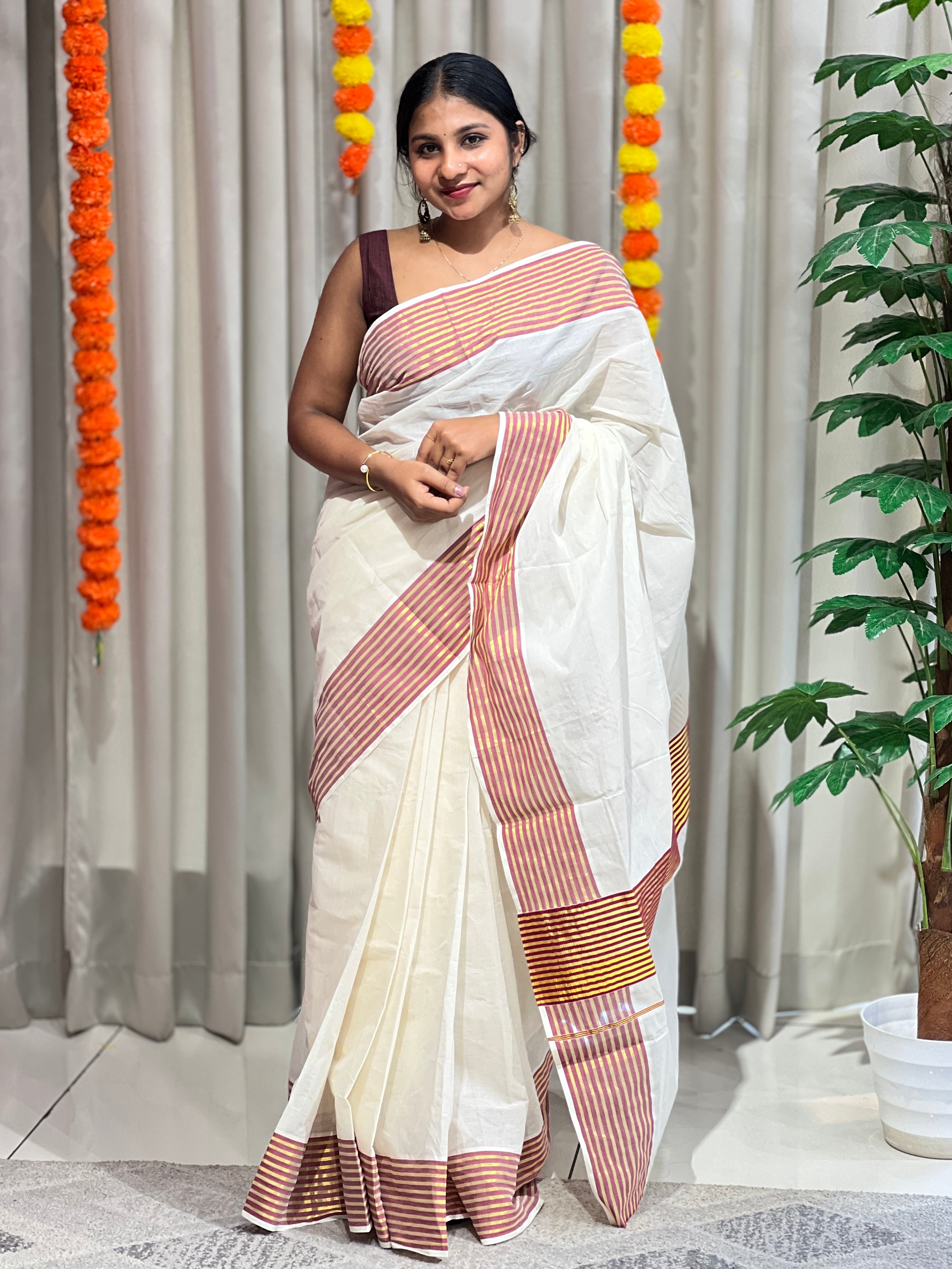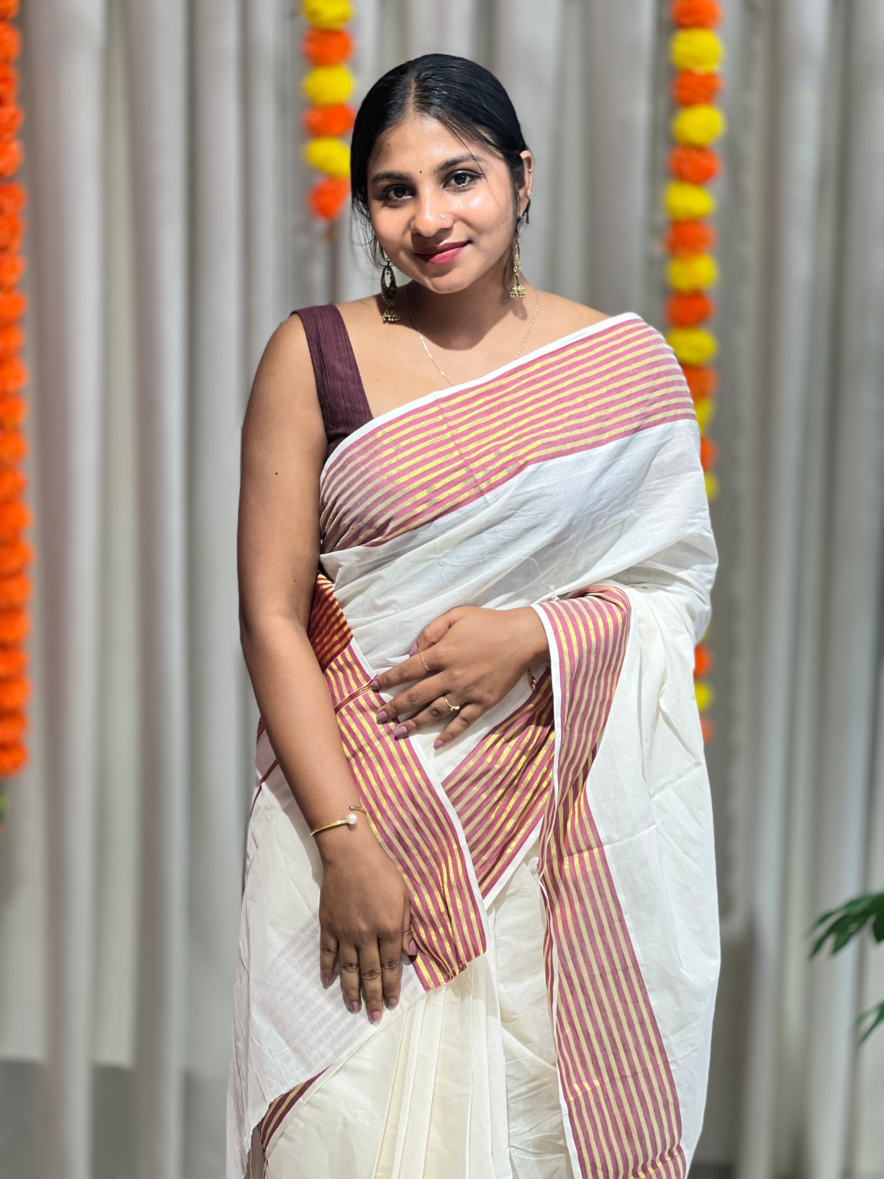• Zari and Thread Stripes Weaved Kerala Cotton Saree | KL417