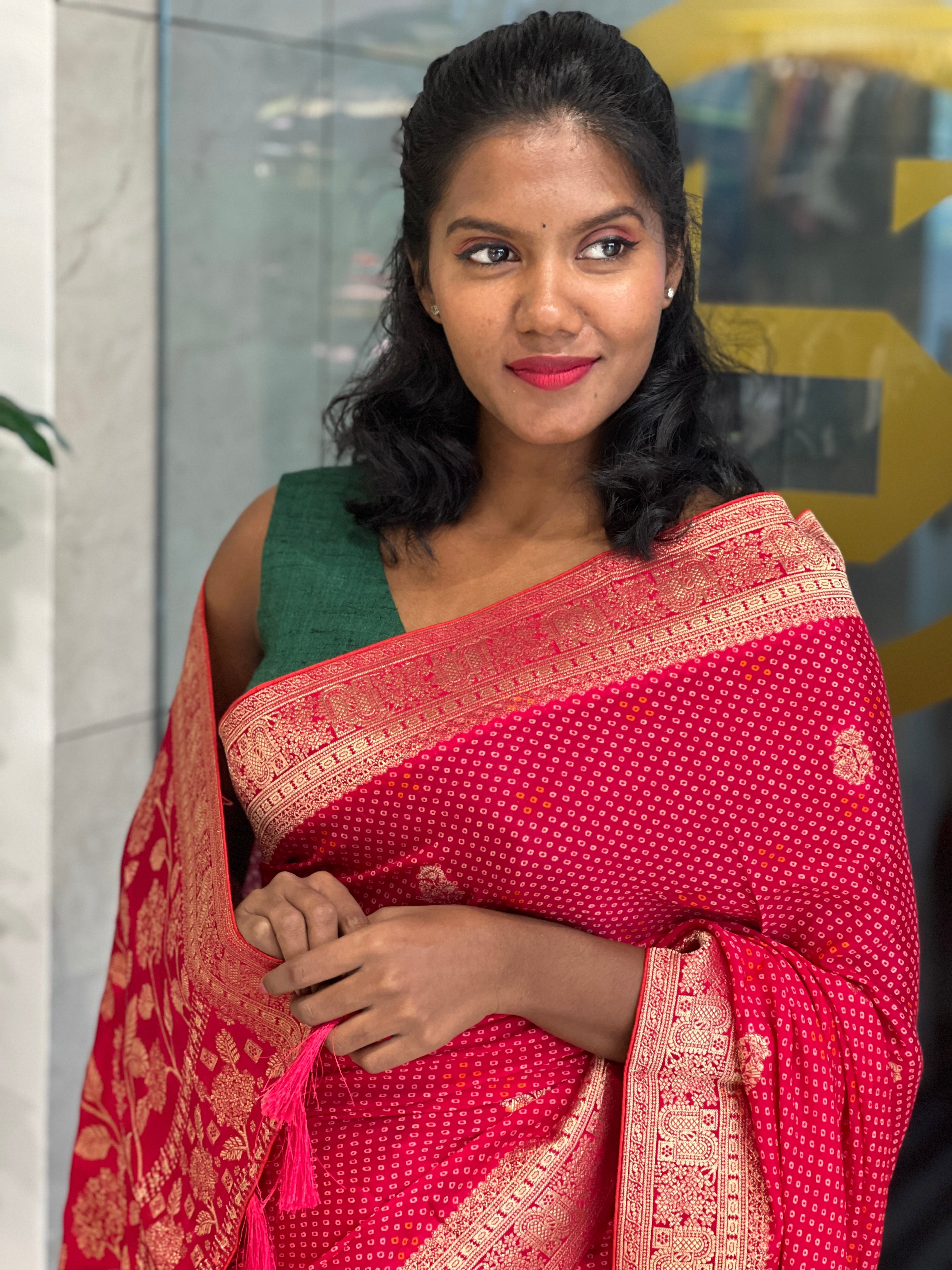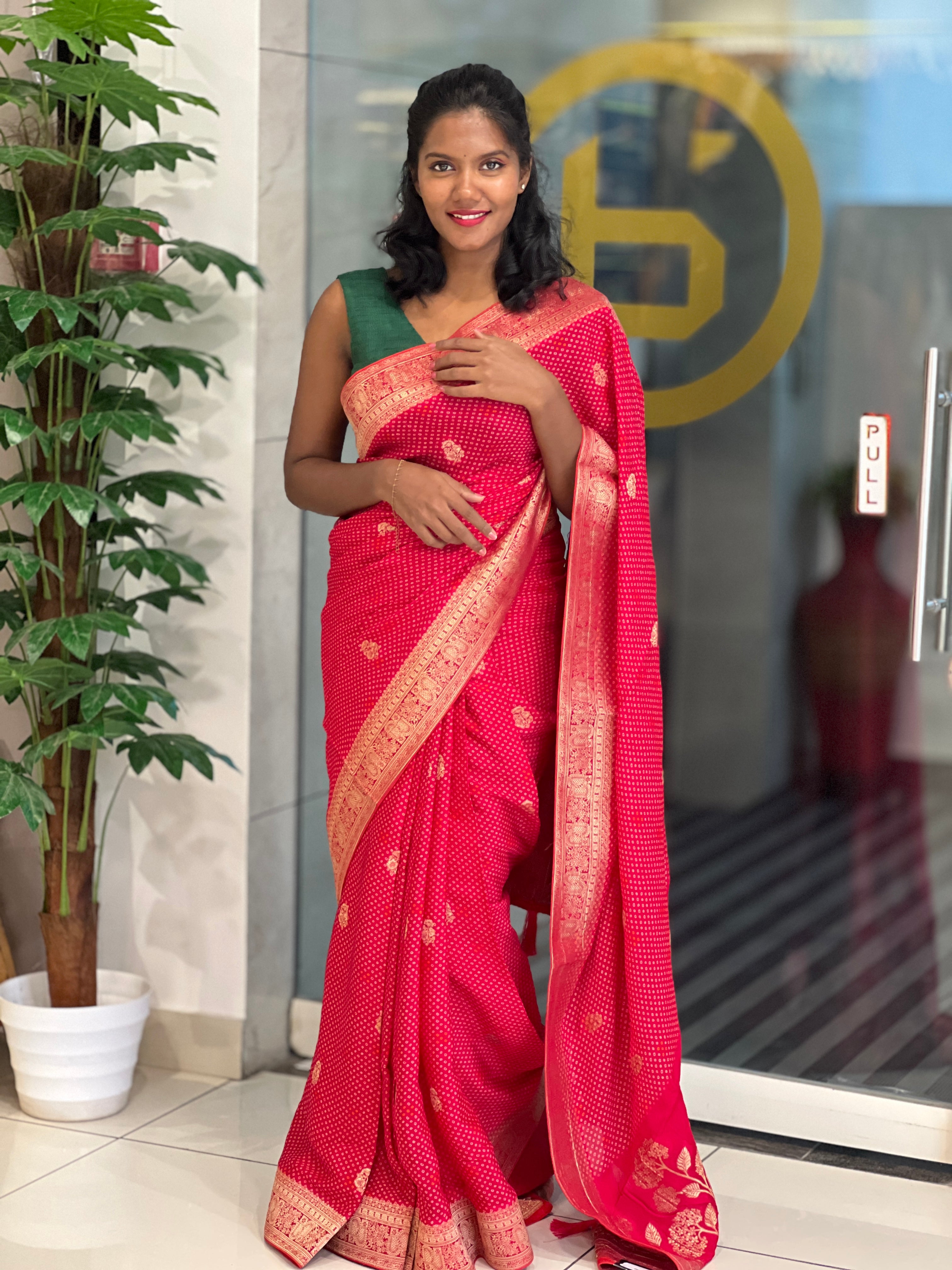 - Style : Jacquard Weaved Border, Short Pallu Weaving, Scattered Zari Printed Detailing