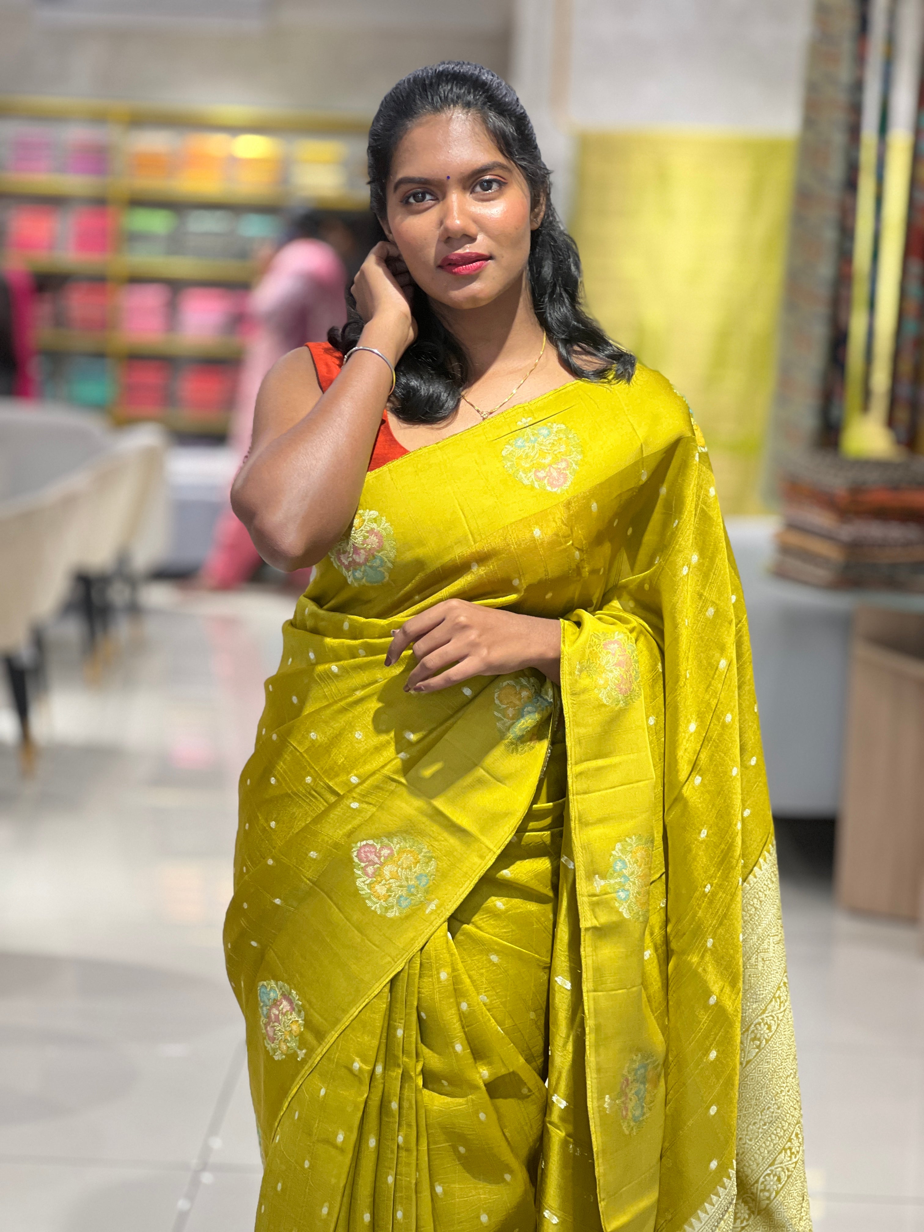 - Style: Zari Butta Weaving, Brocade Pallu with Floral & Geometric Pattern, Scattered Threads and Zari Weaving Motif Border Detailing