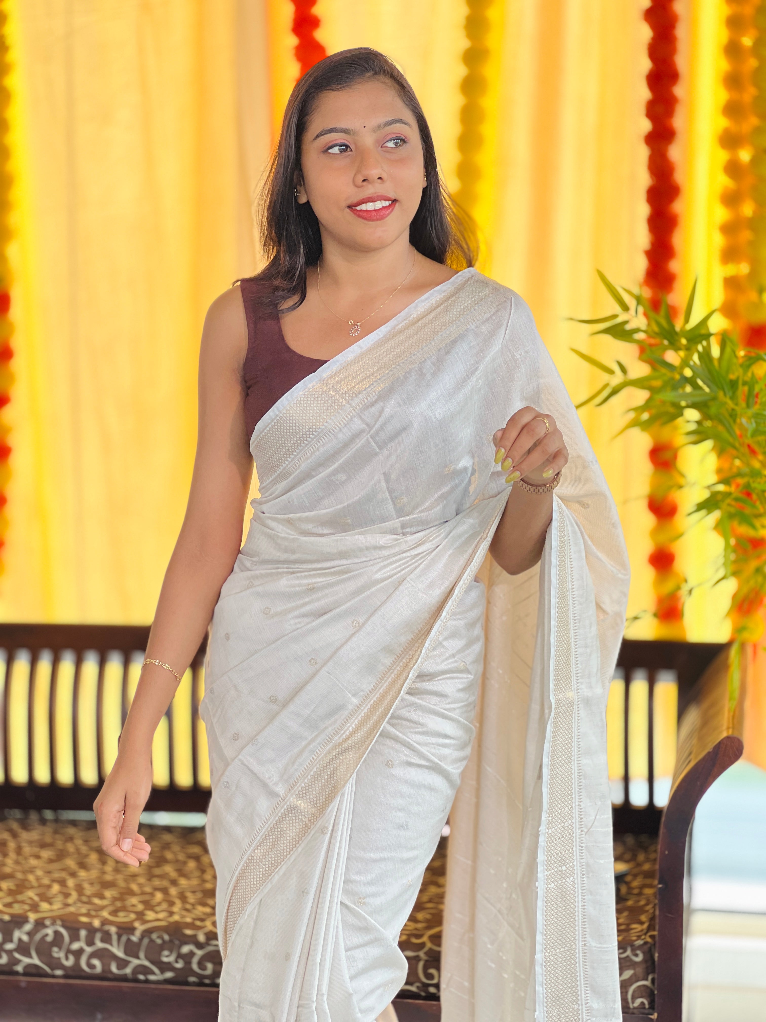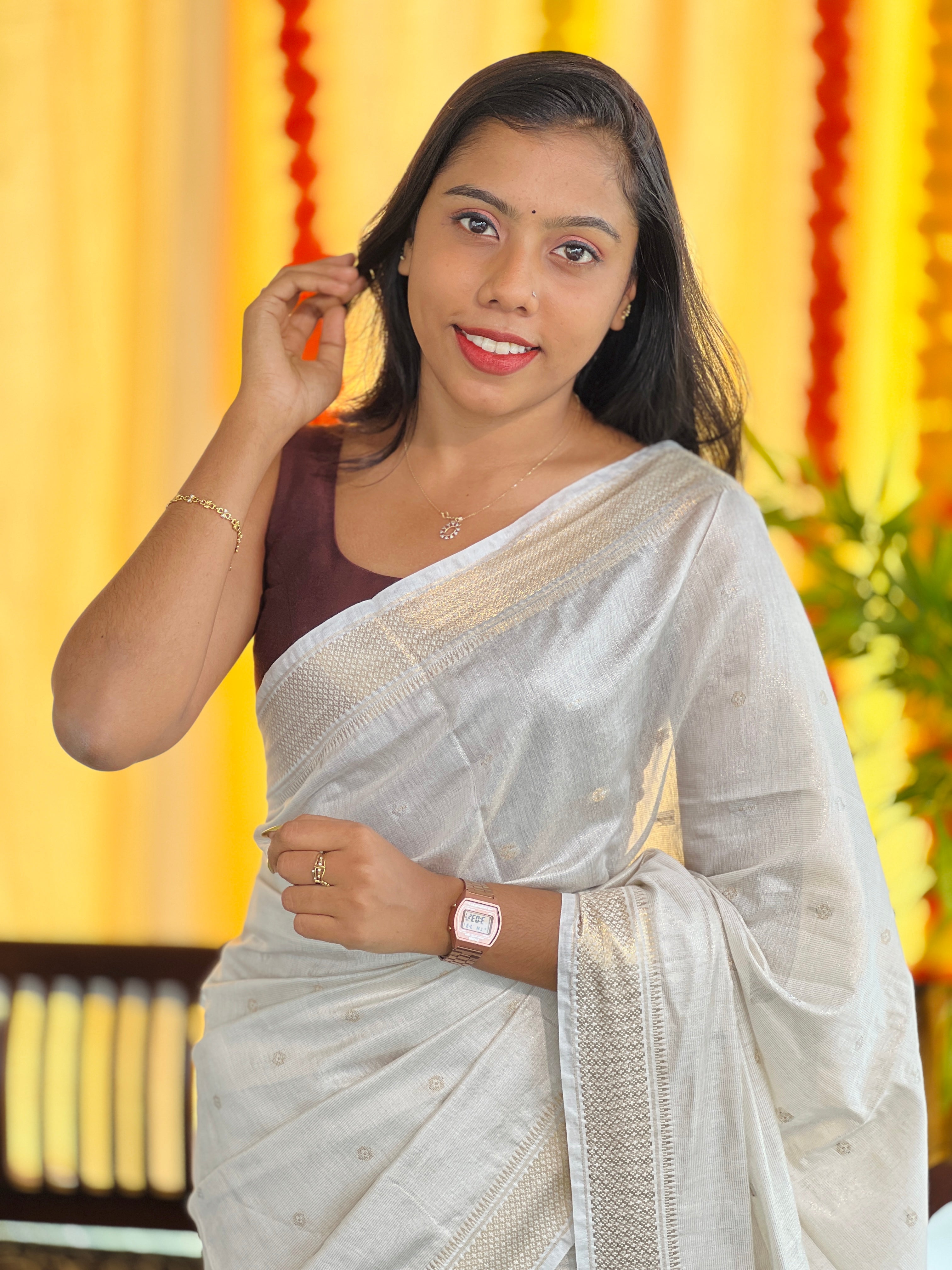 - Style: Silver & Golden Zari Weaved Butta Detailing, Zari Borders, Kesia Weaved Pallu, Tassels Detailing
