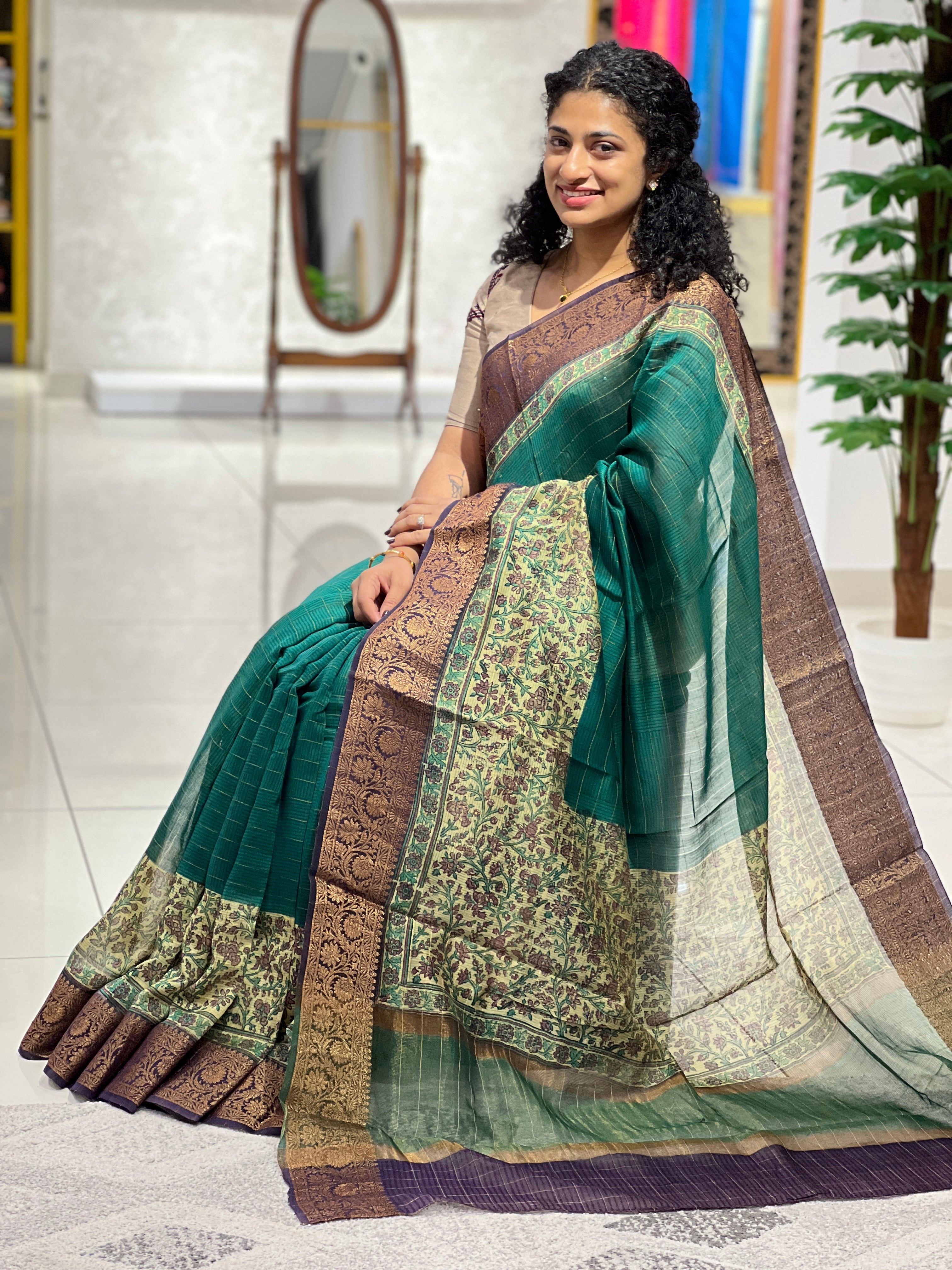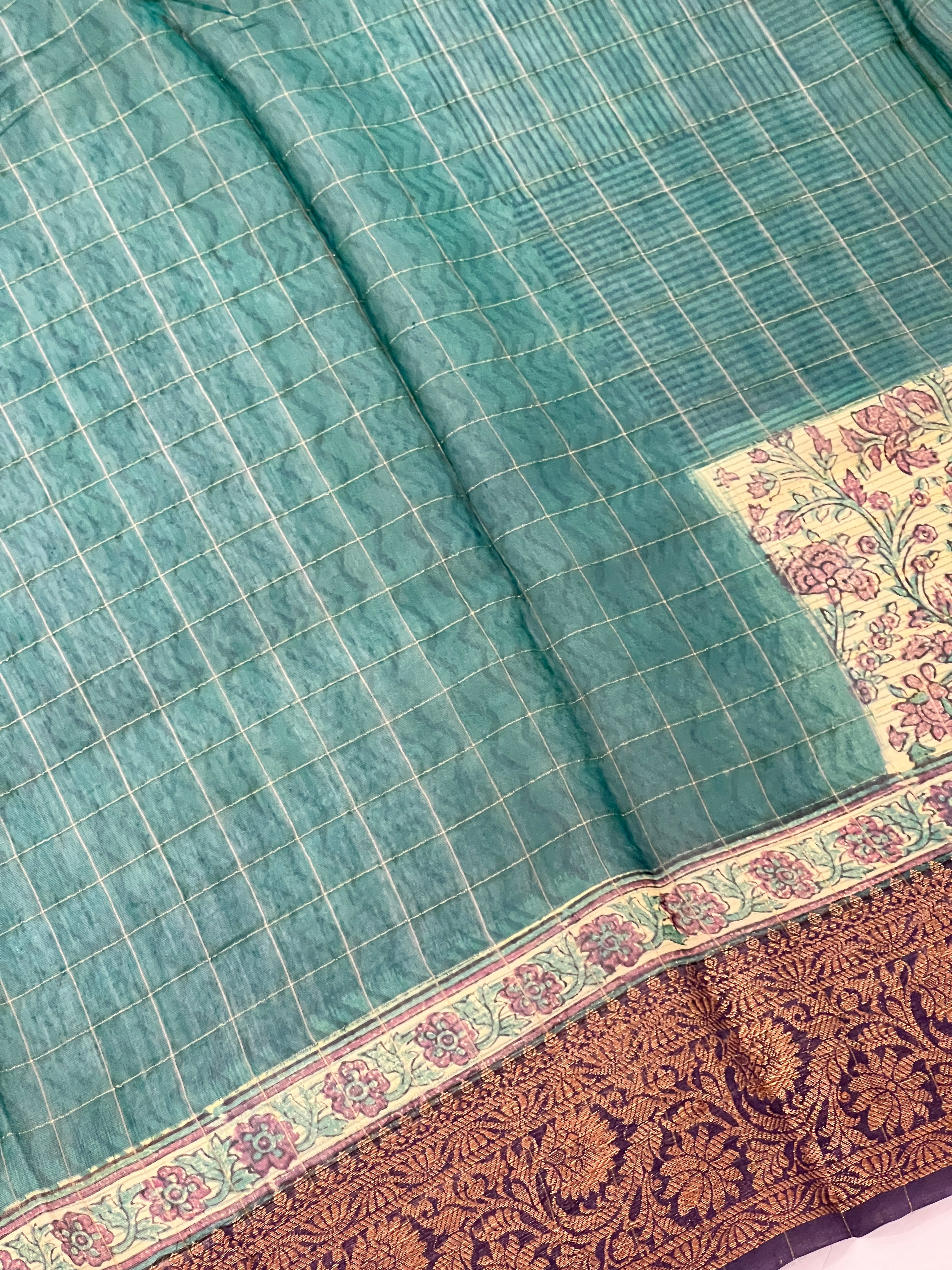 - Style: Block Printed, Zari Check Pattern, Antique Golden Zari Banarasi Borders, Floral Pattern