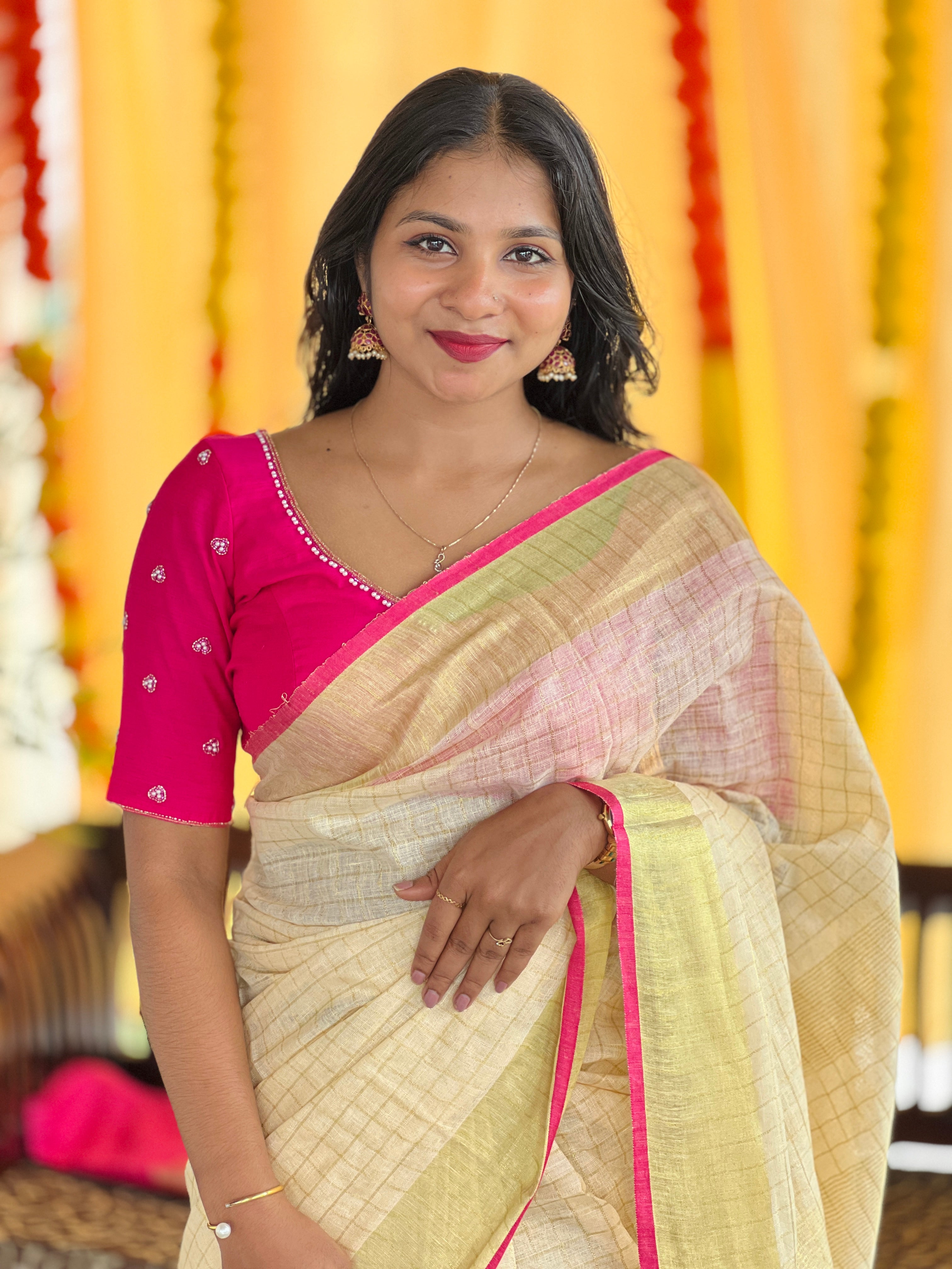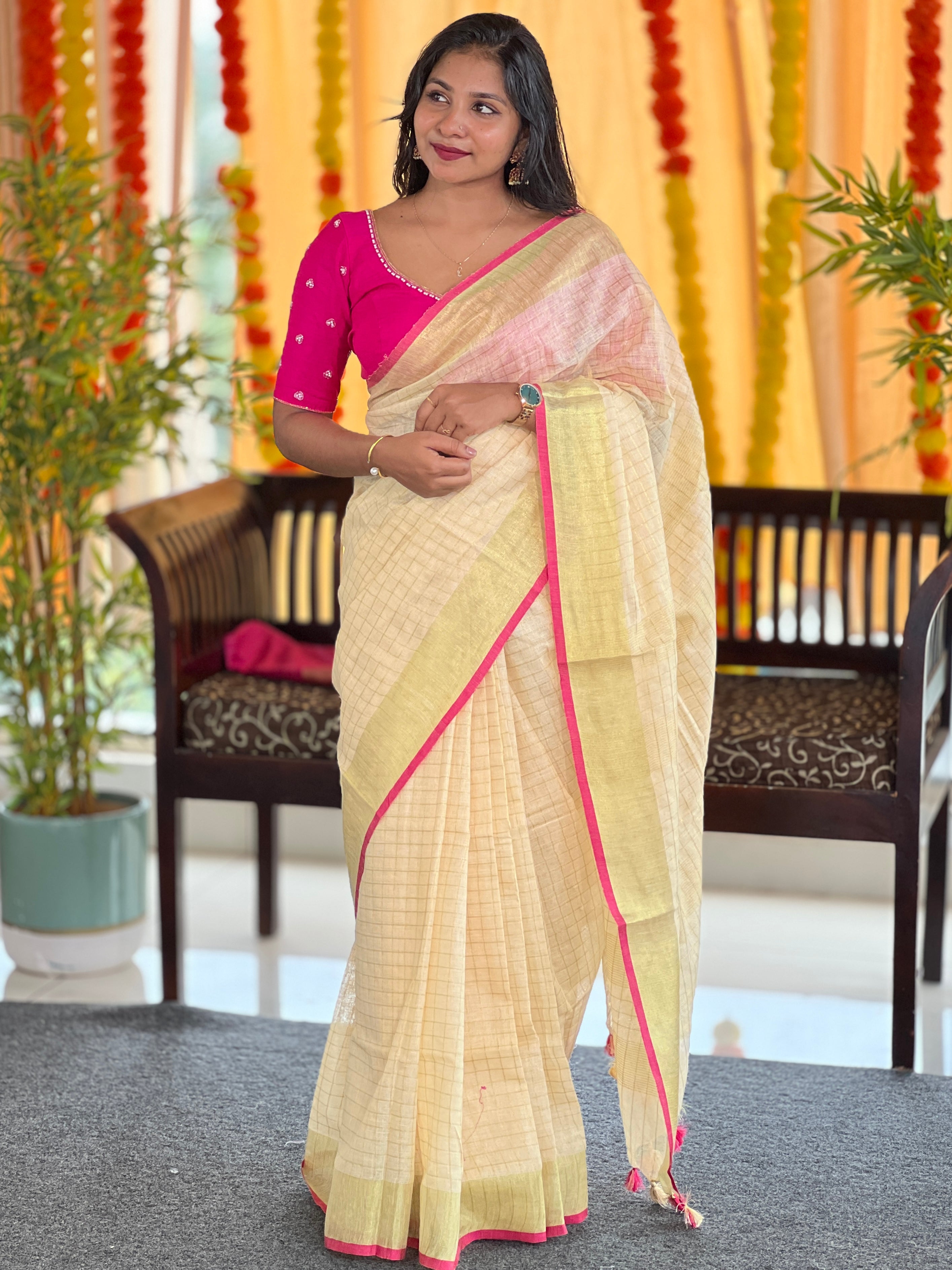 - Style: Zari Check Pattern, Stripes Patterned Pallu with Tassels attached, Zari and Kara Border Detailing