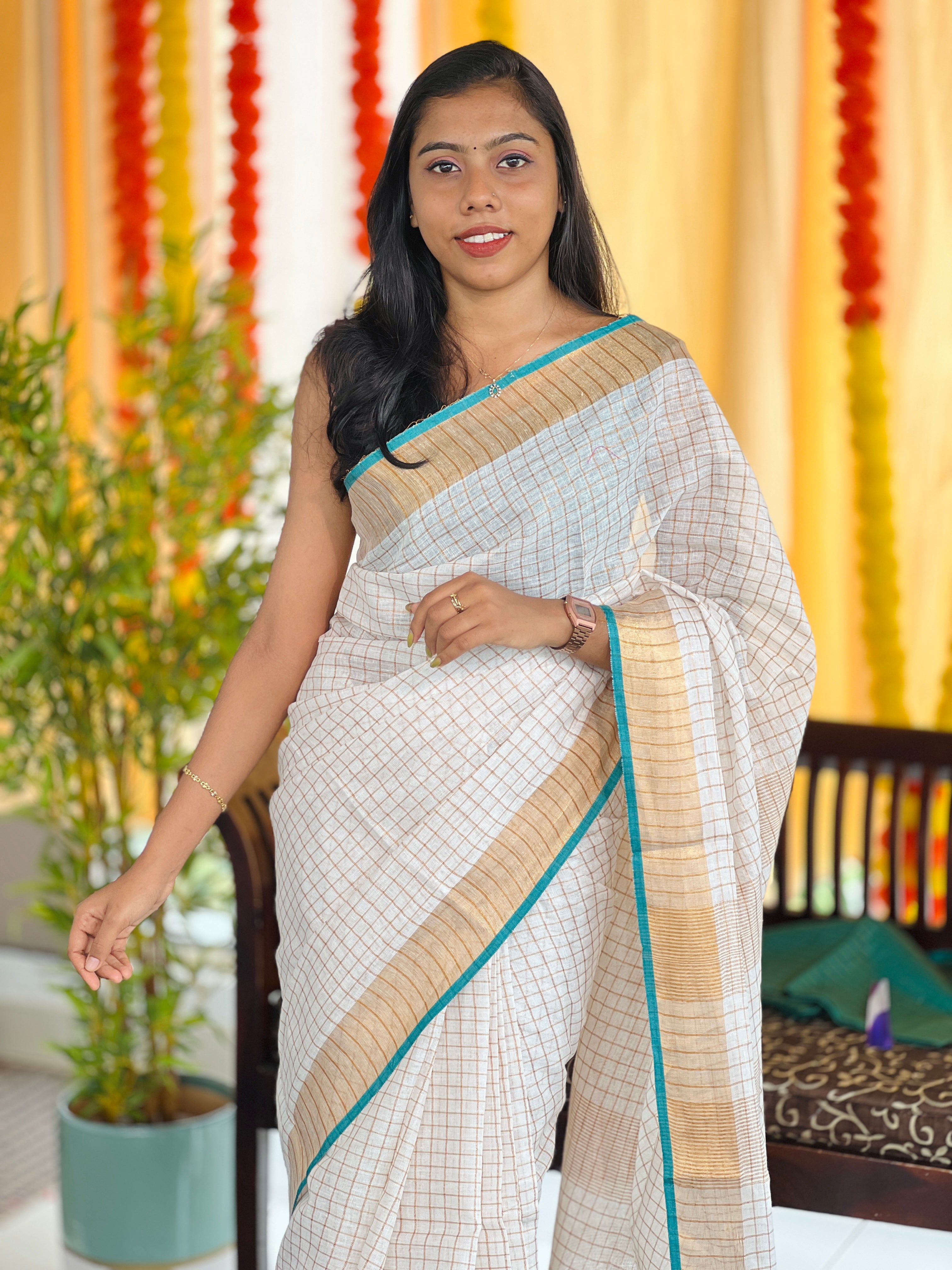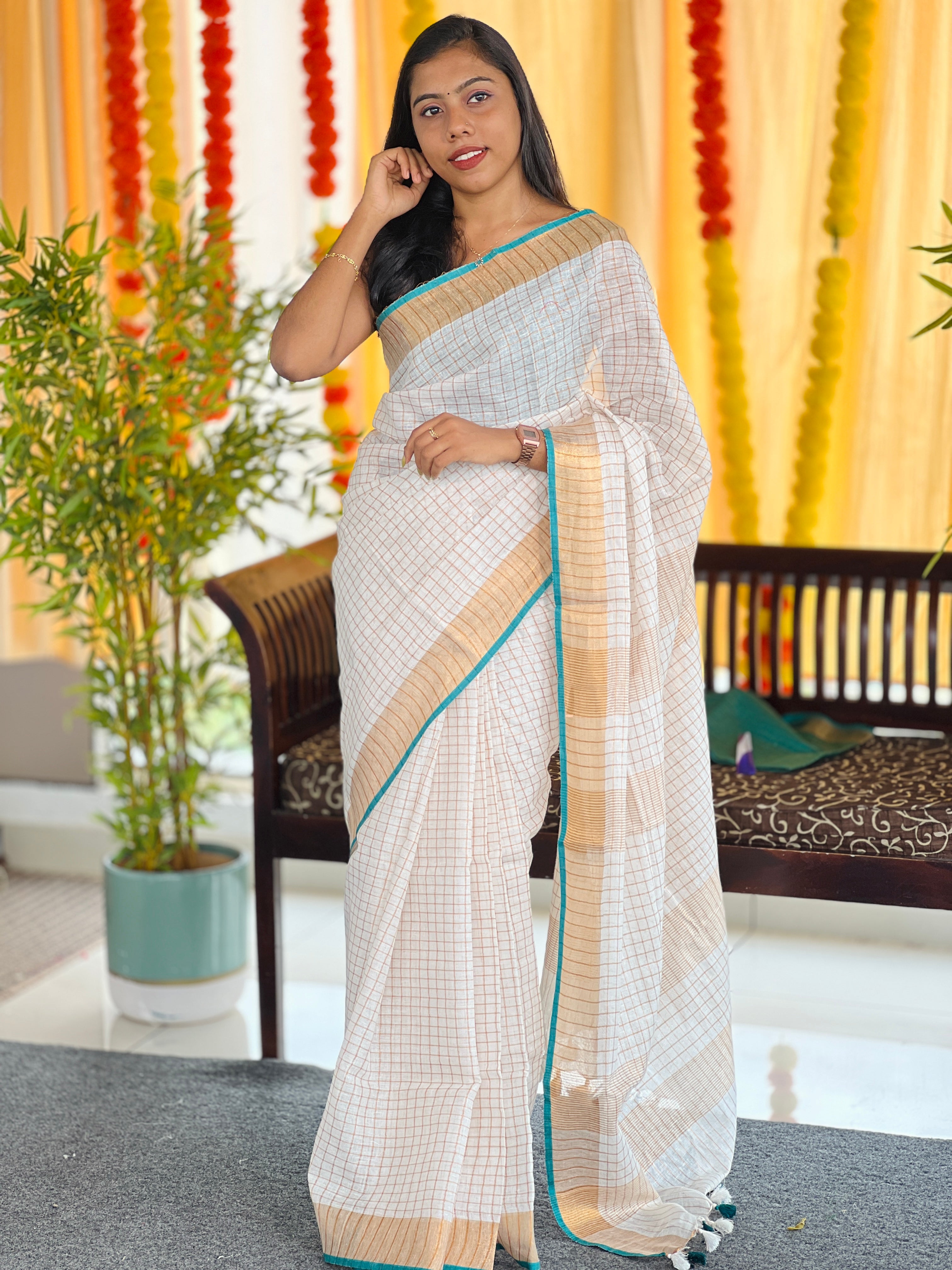 - Style: Zari Check Pattern, Stripes Pattern Pallu with Tassels attached, Zari and Kara Border Detailing