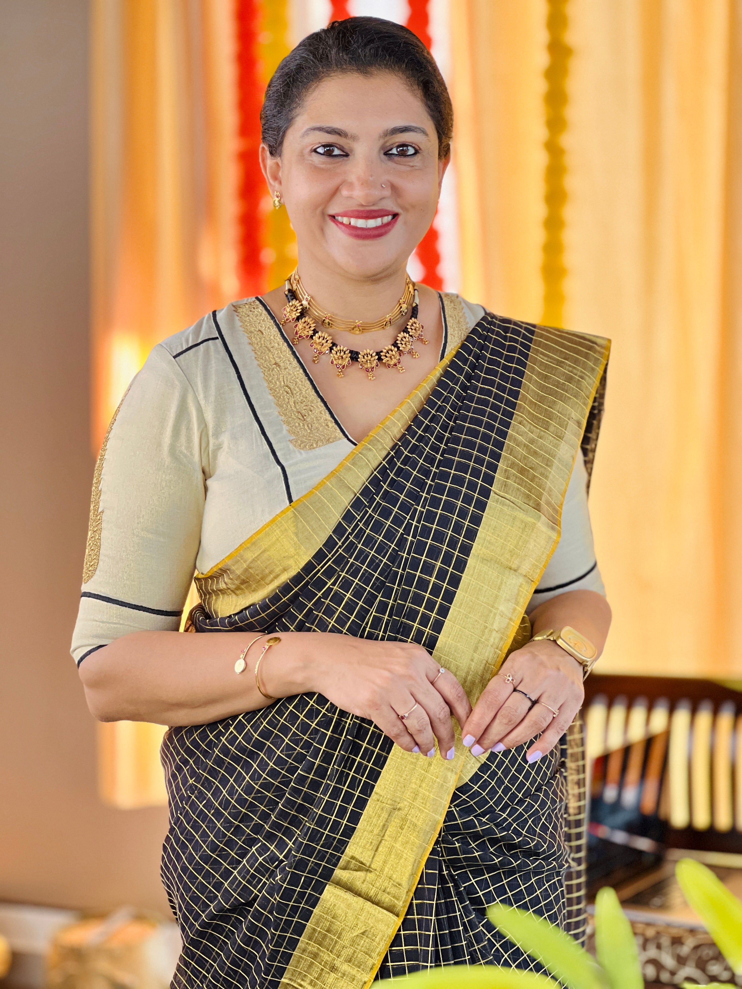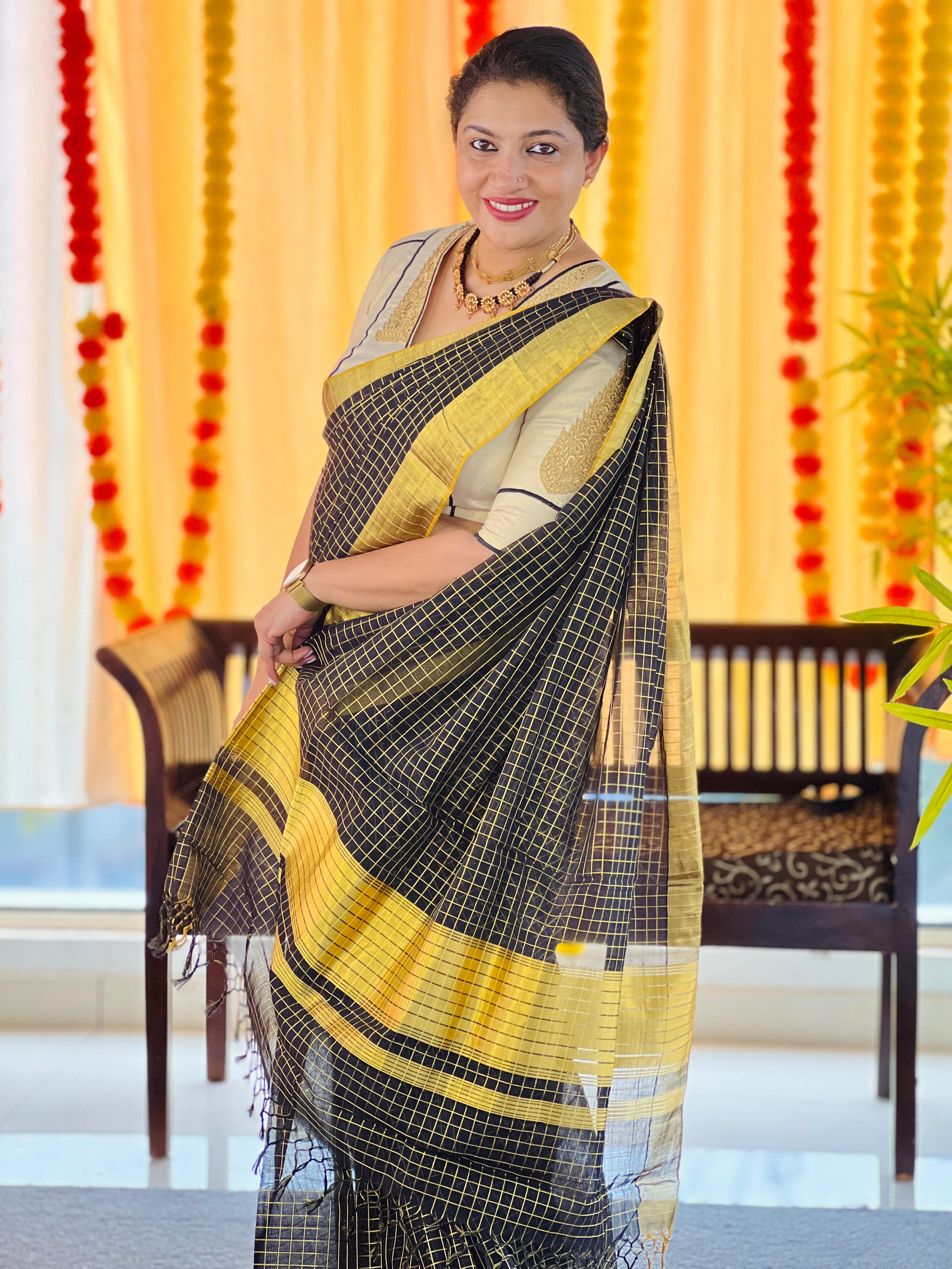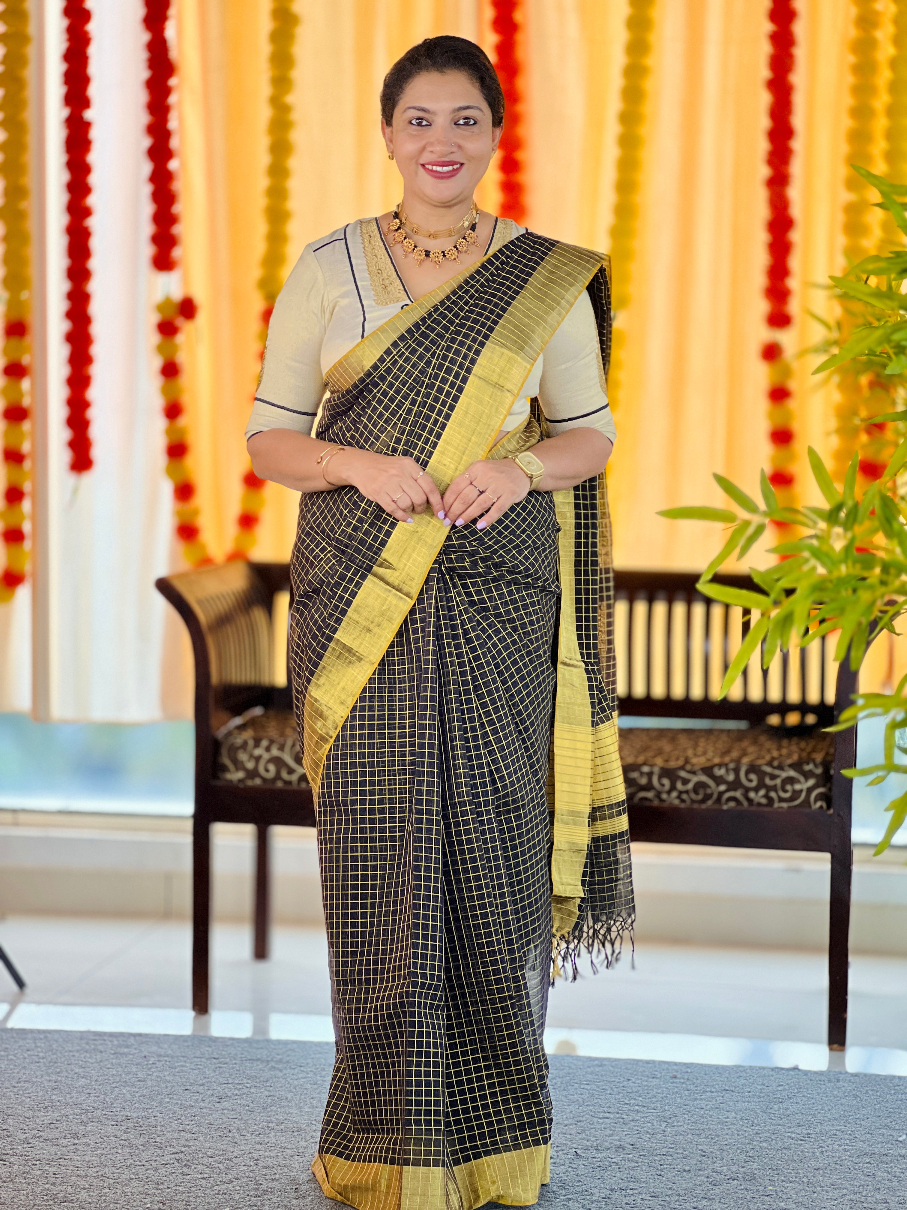 - Style: Handloom, Zari Check Weaving Pattern, Kasavu With Kara Detailed Borders & Pallu, Tassels Detailing