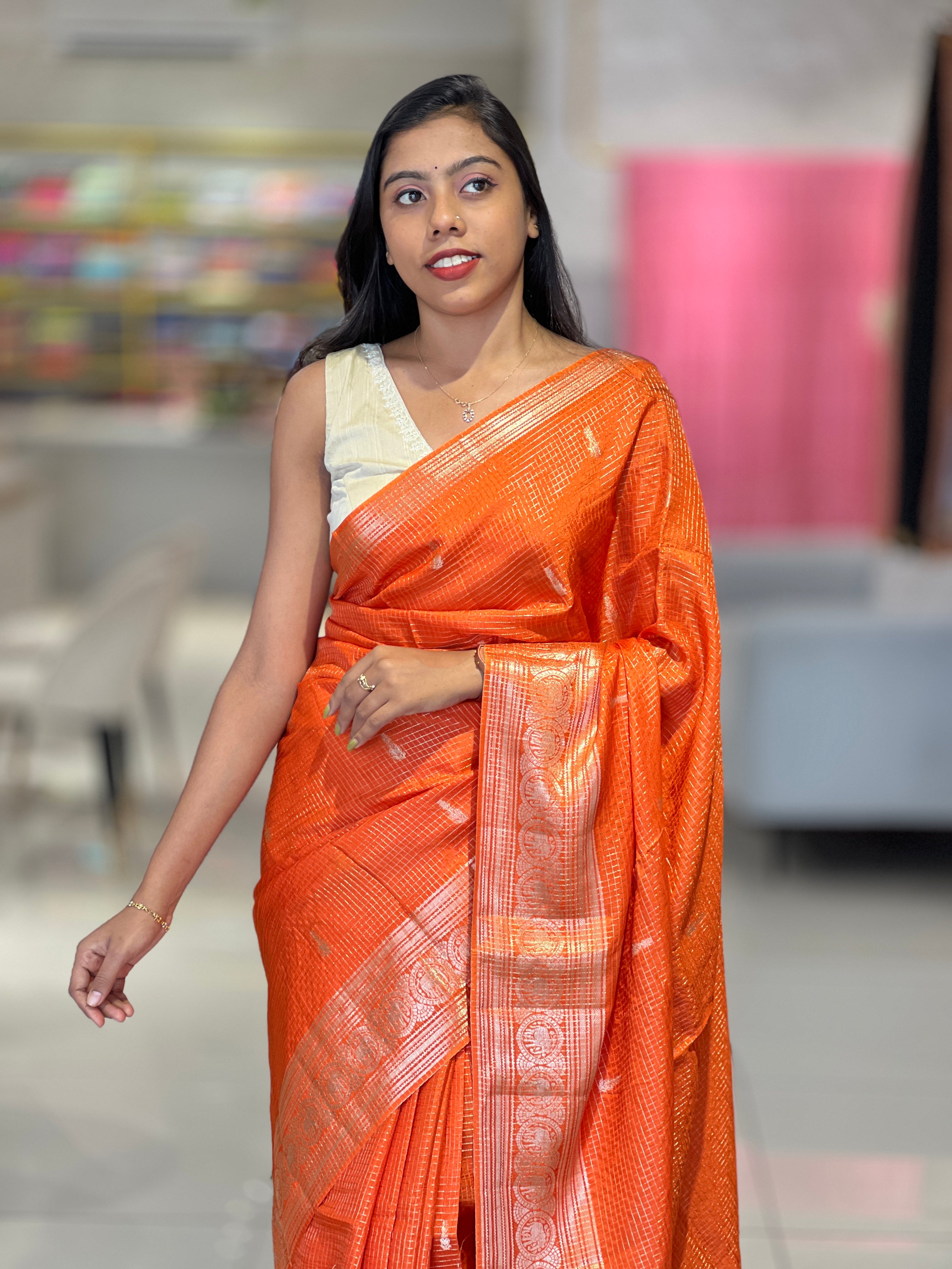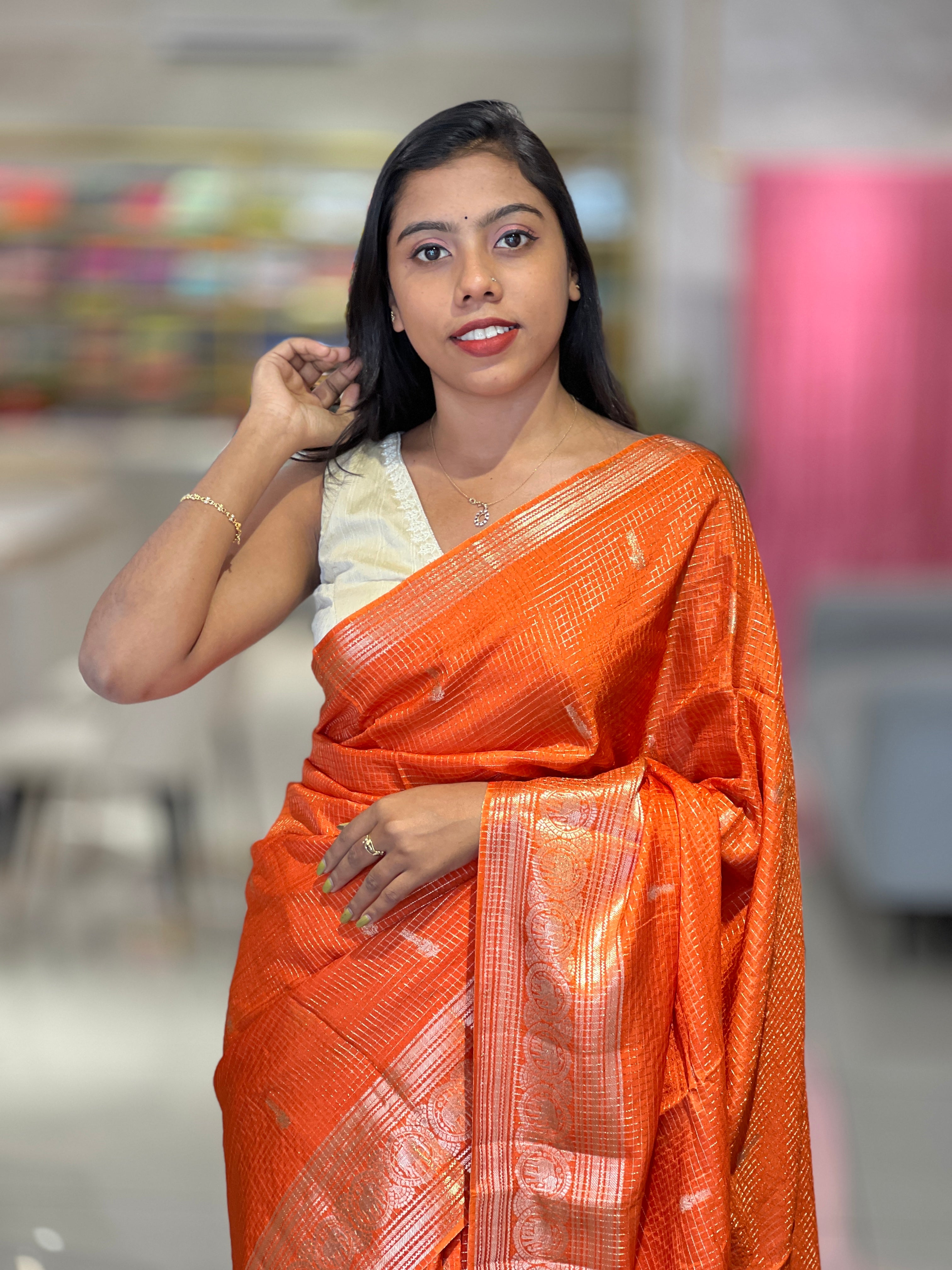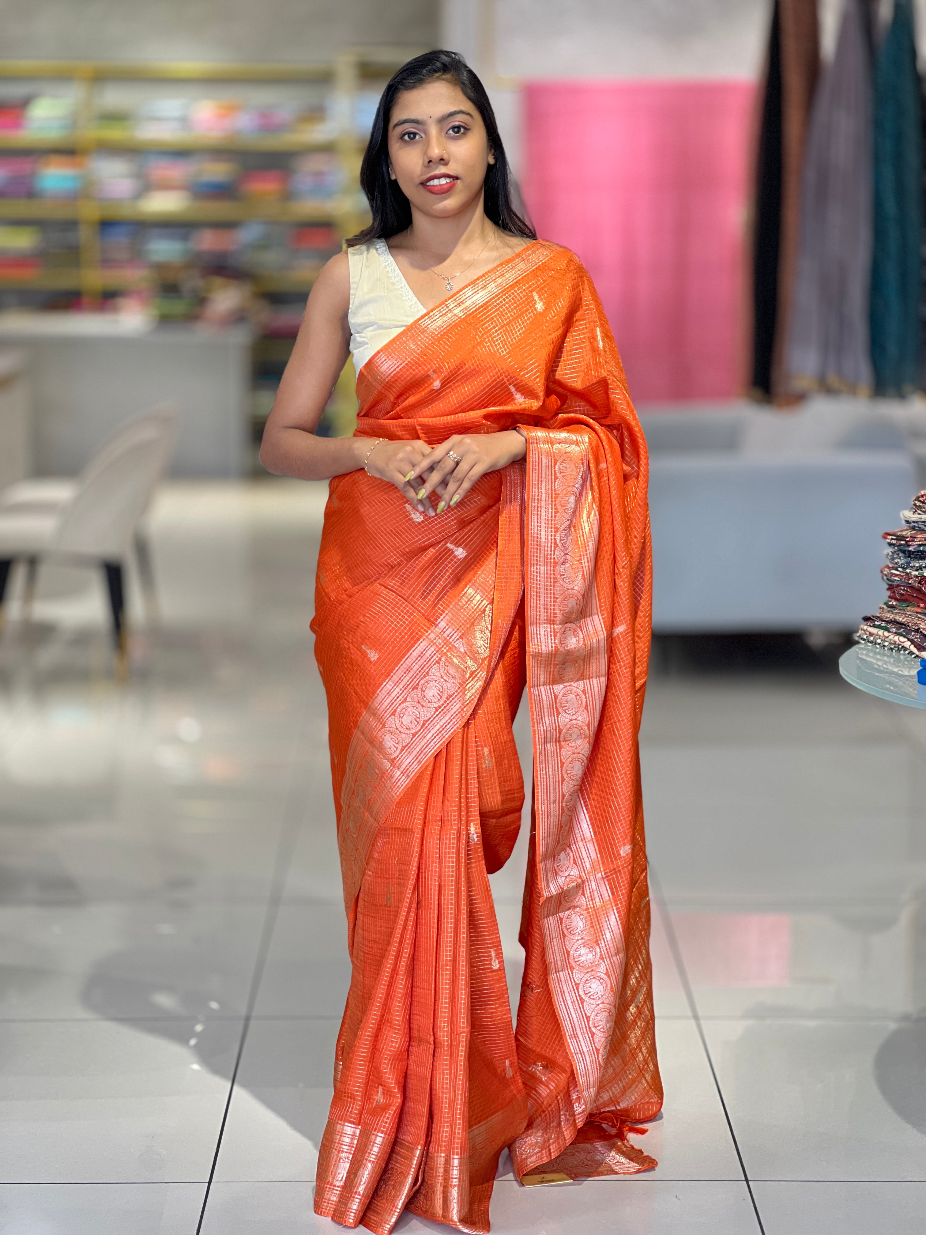 - Style: Zari Woven, Check Pattern With Scattered Buta Detailing, Traditional Patterned Borders, Stripe Patterned Pallu, Tassels Attached