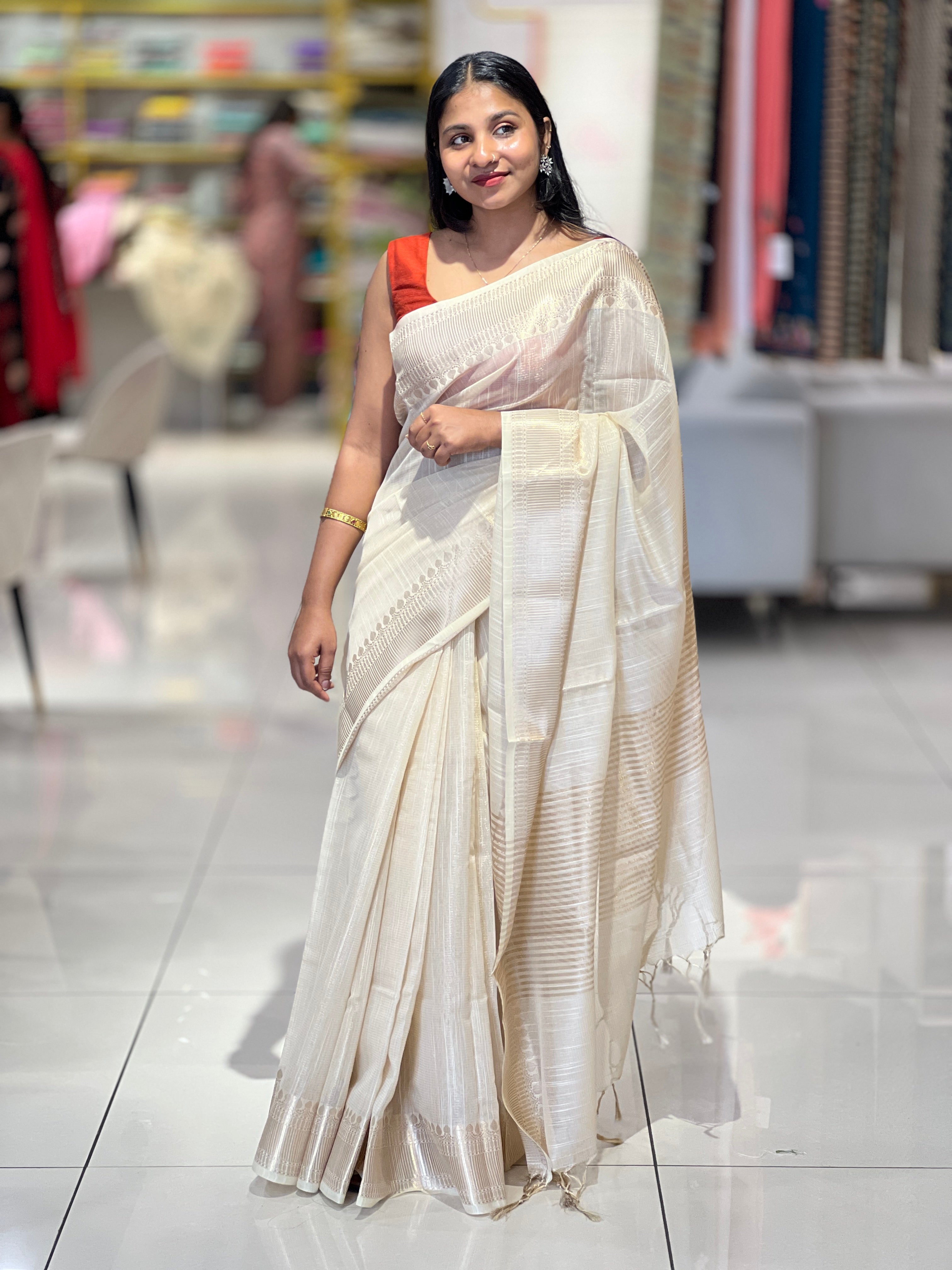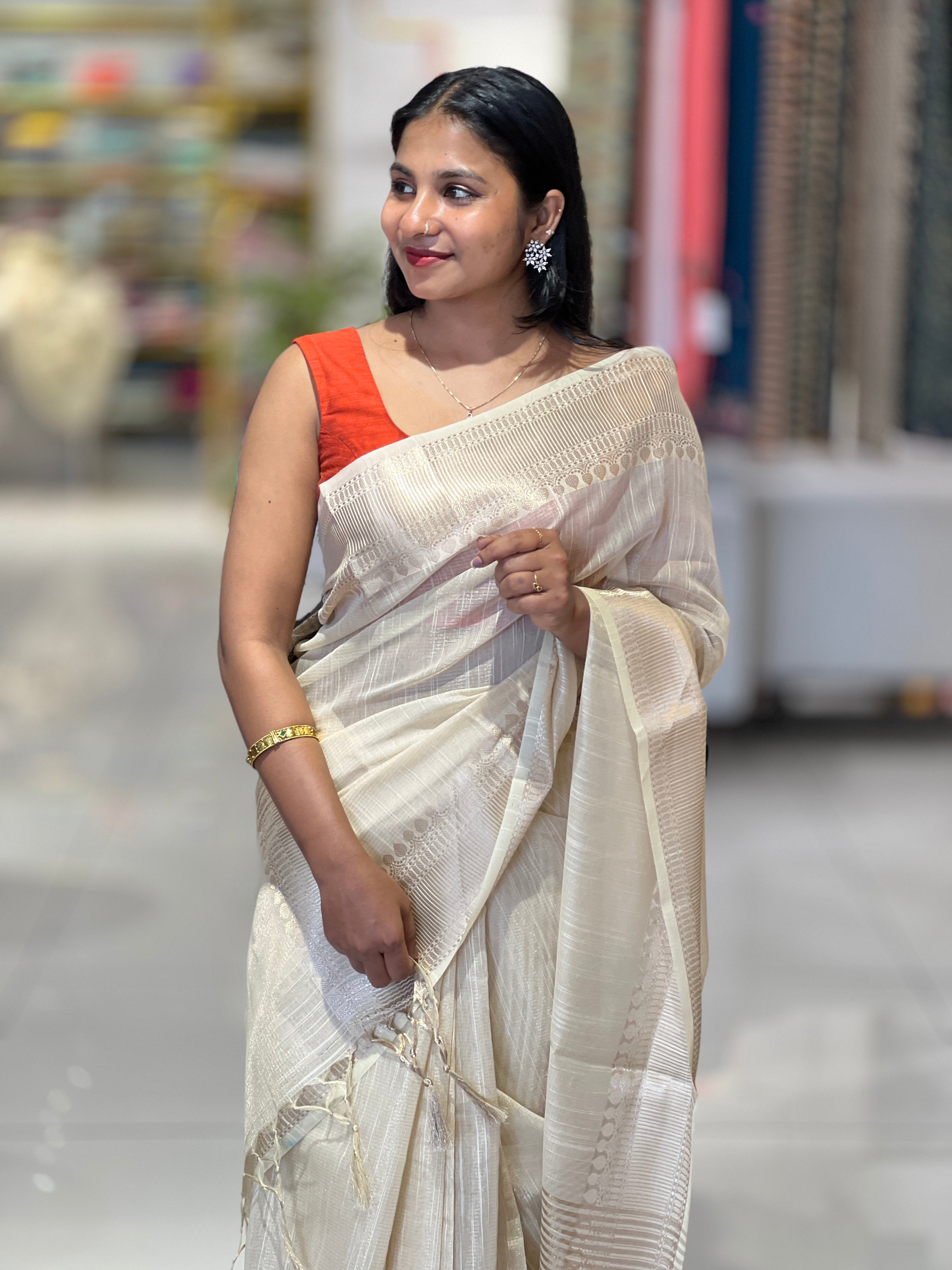 - Style: Banarasi Border Detailing, Linen Weaving Style, Stripes Patterned Pallu, Tassels Attached