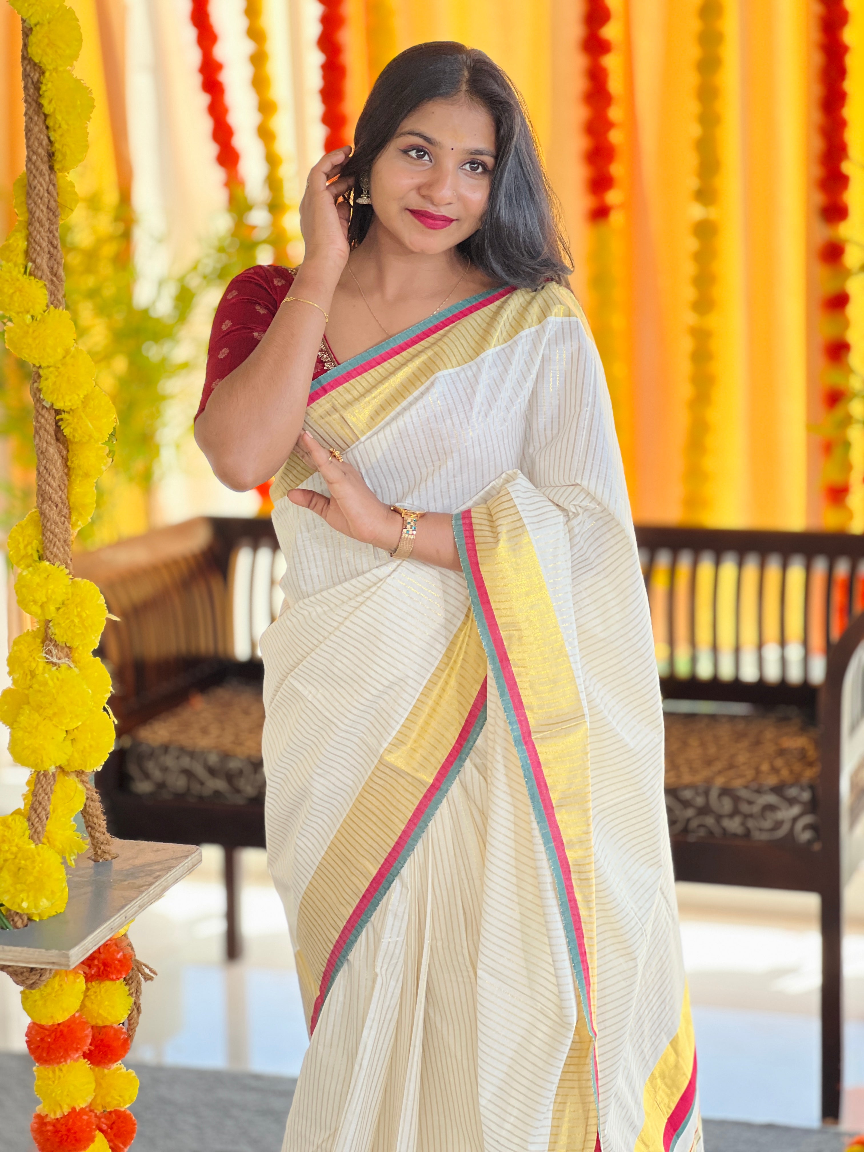 • Zari Stripe Weaving Patterned Kerala Cotton Saree | RAV105