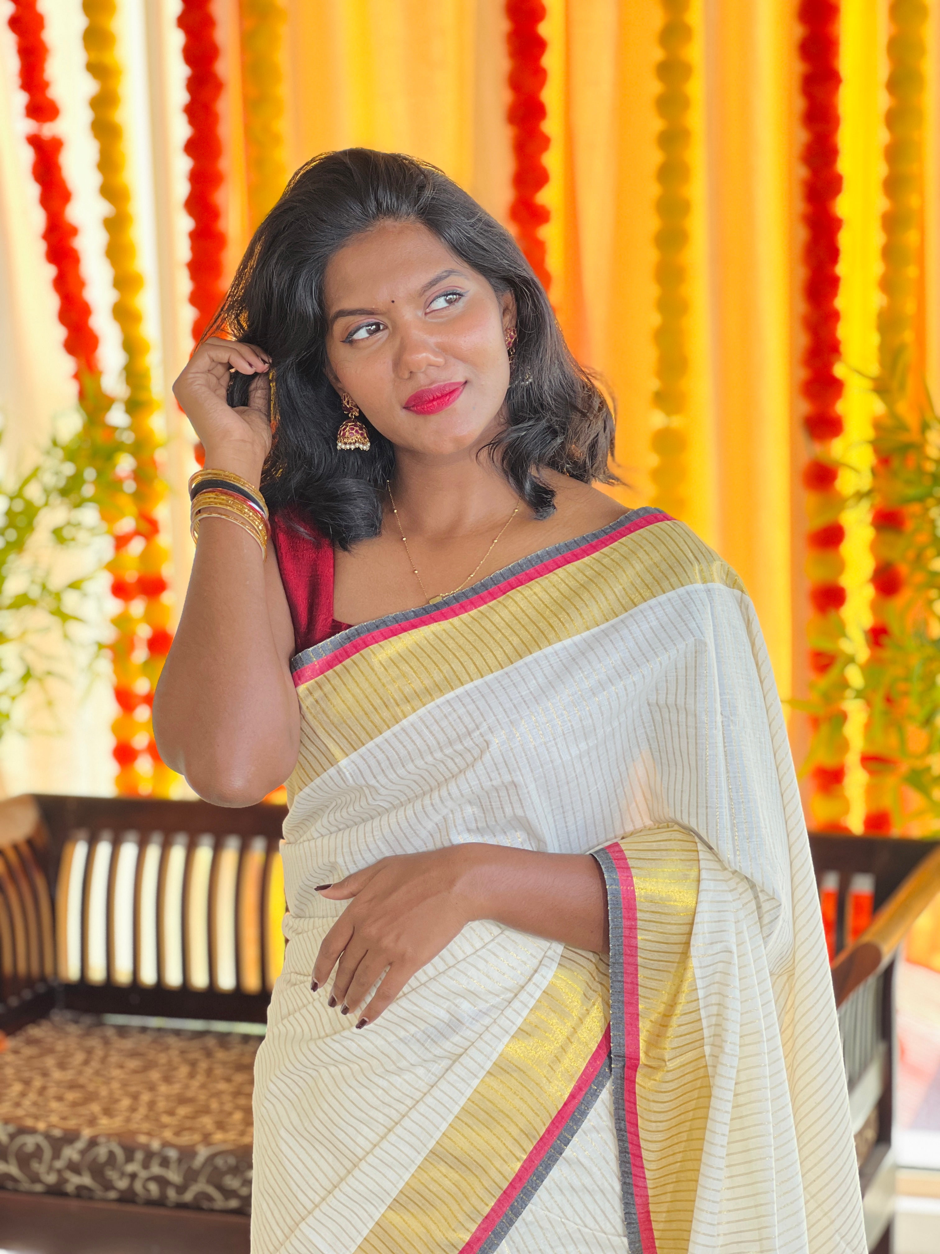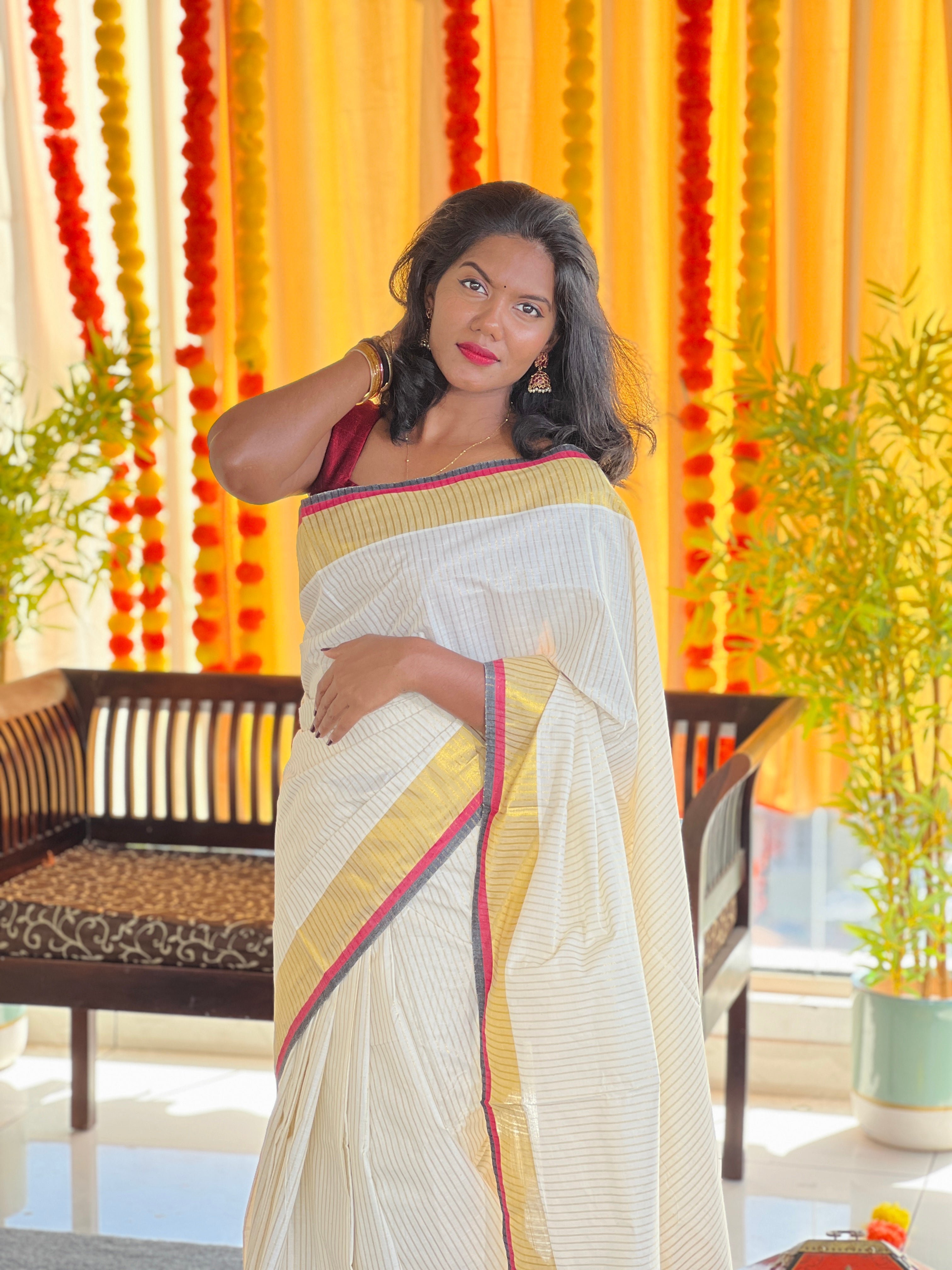 - Style: Zari Stripe Weaving Pattern, Kasavu With Kara Border Detailing
