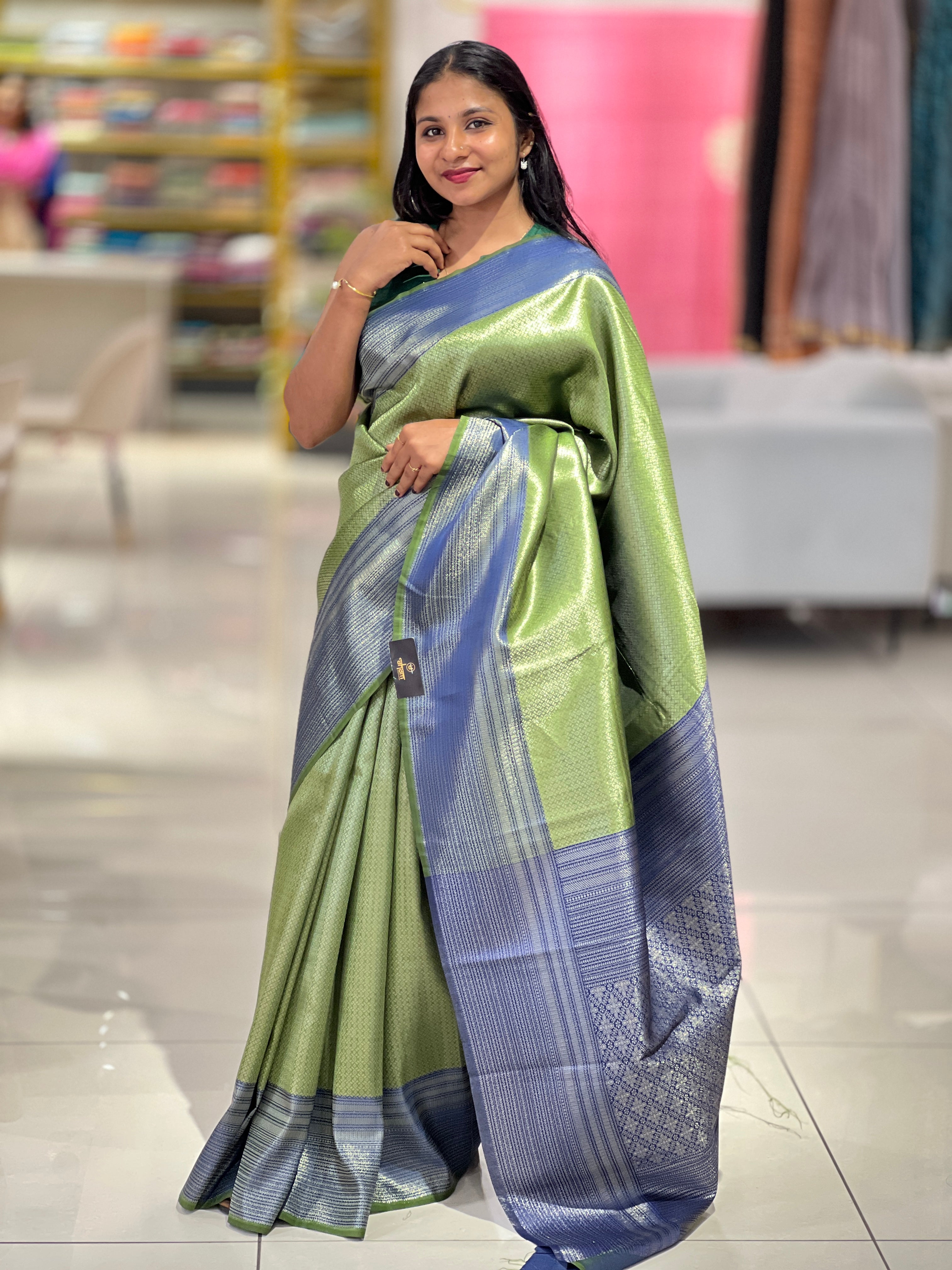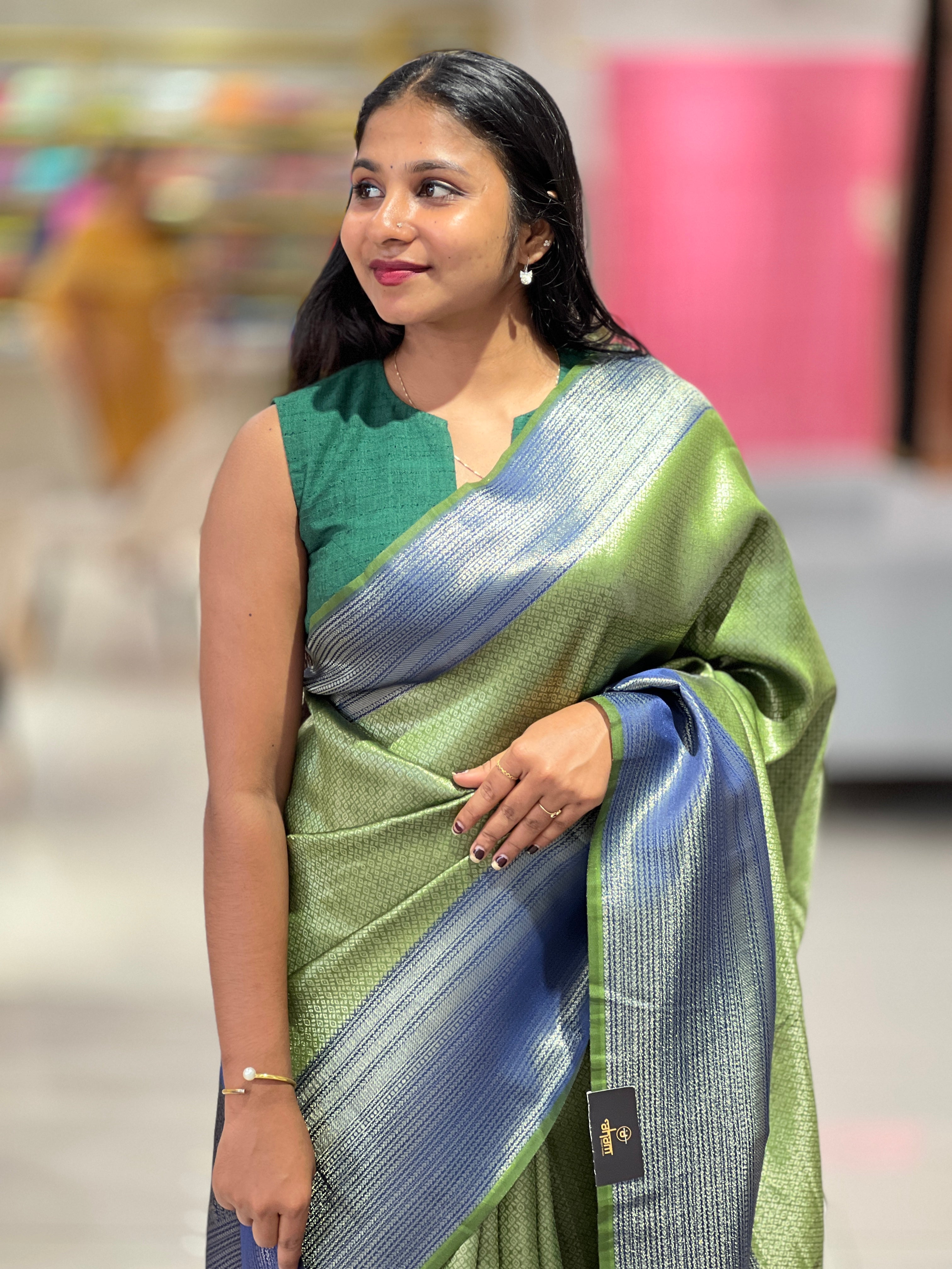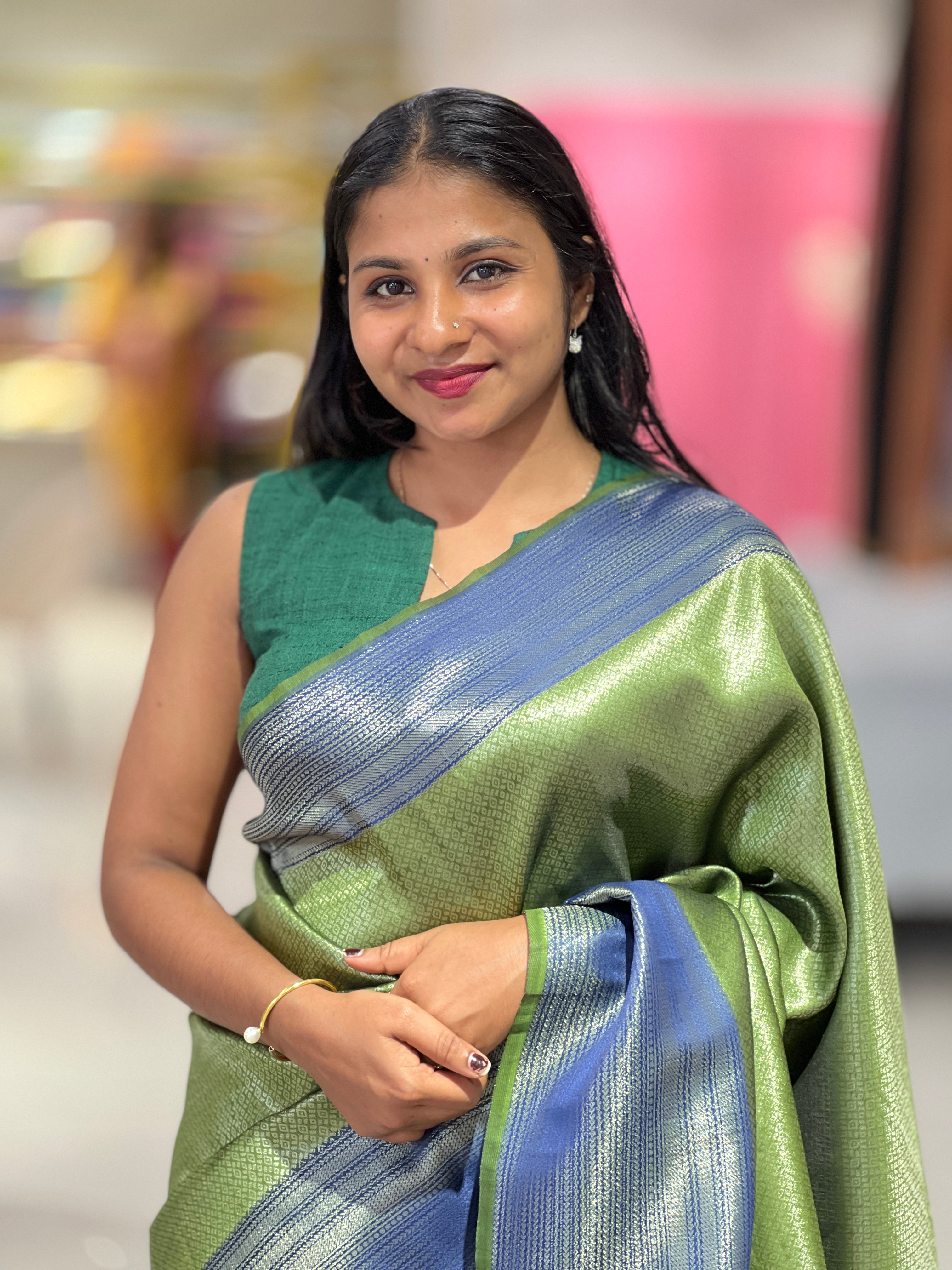 - Style: Zari Weaved, Geometric Brocade Patterned Body, Contrast Traditional Patterned Pallu & Borders