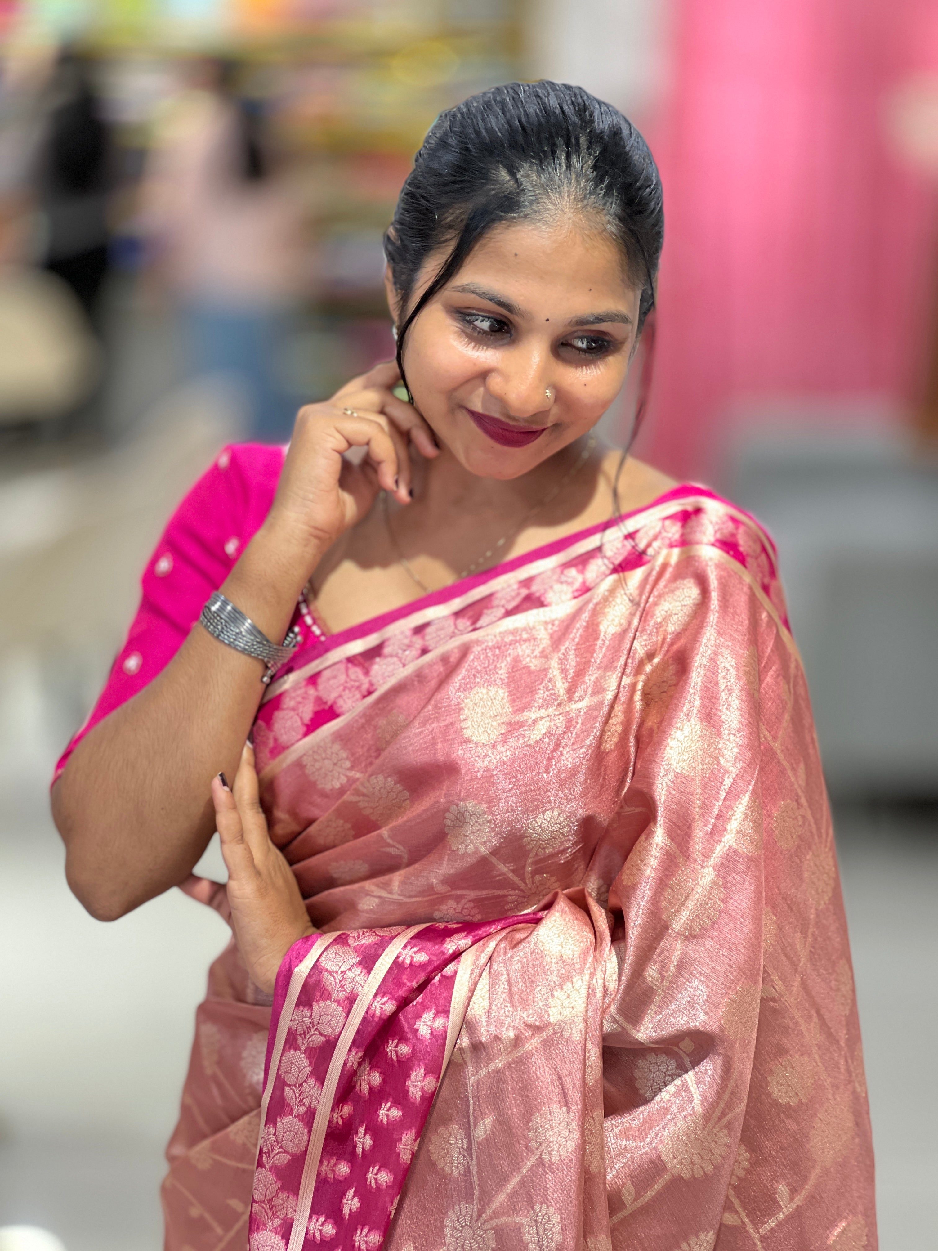 - Style: Banarasi Weaved, Organza Detailed Borders & Pallu, Zari Weaved Floral Pattern, Short Brocade Pallu