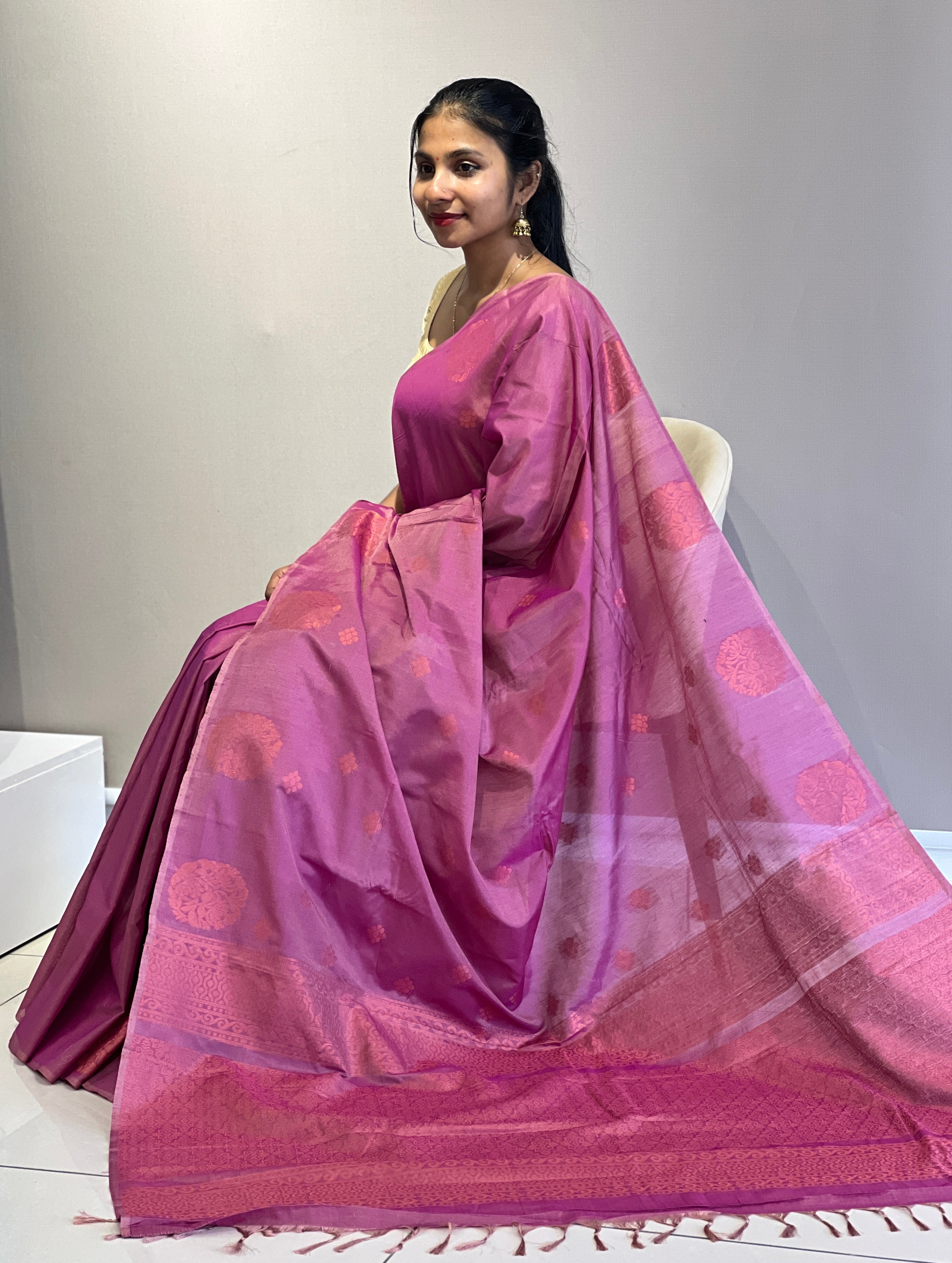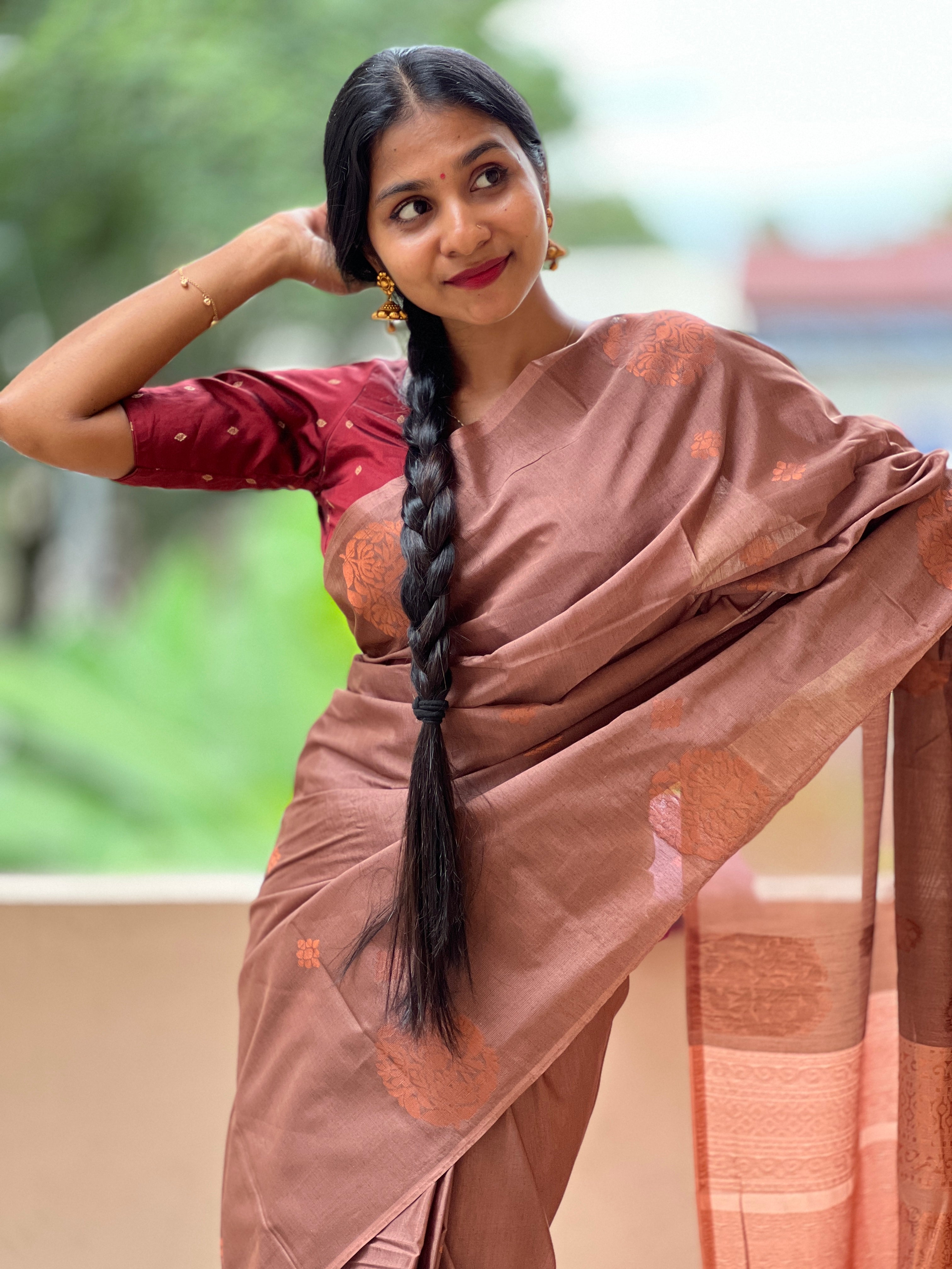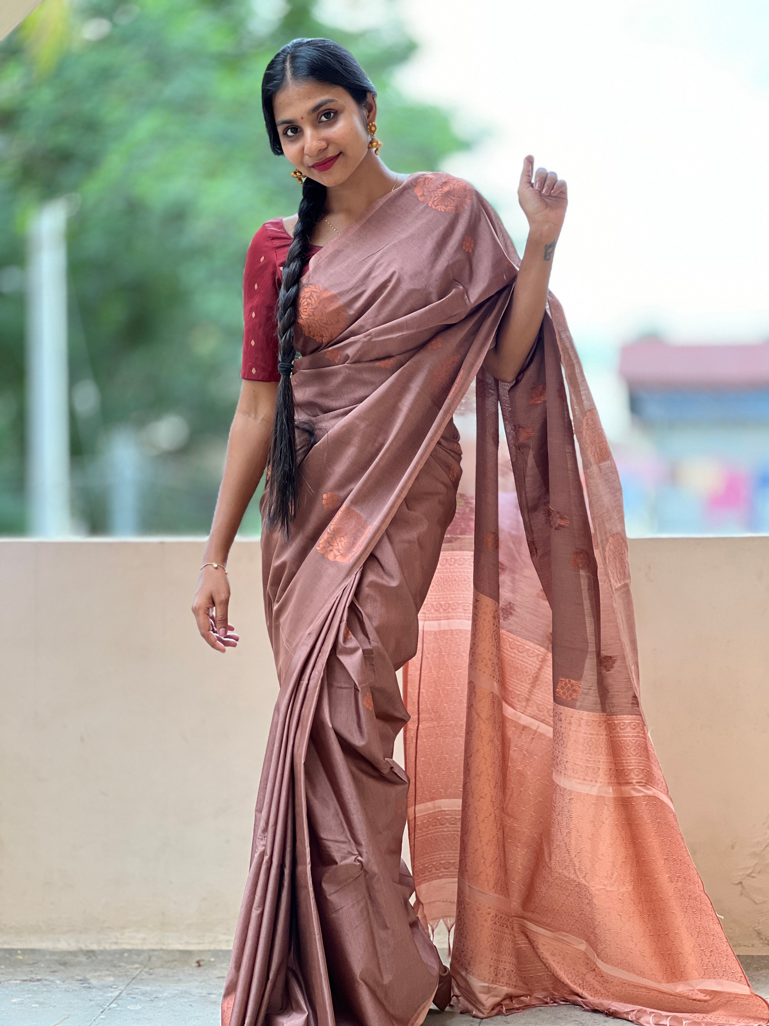 - Style: Copper Zari Weaved Pattern, Traditional Floral Motif