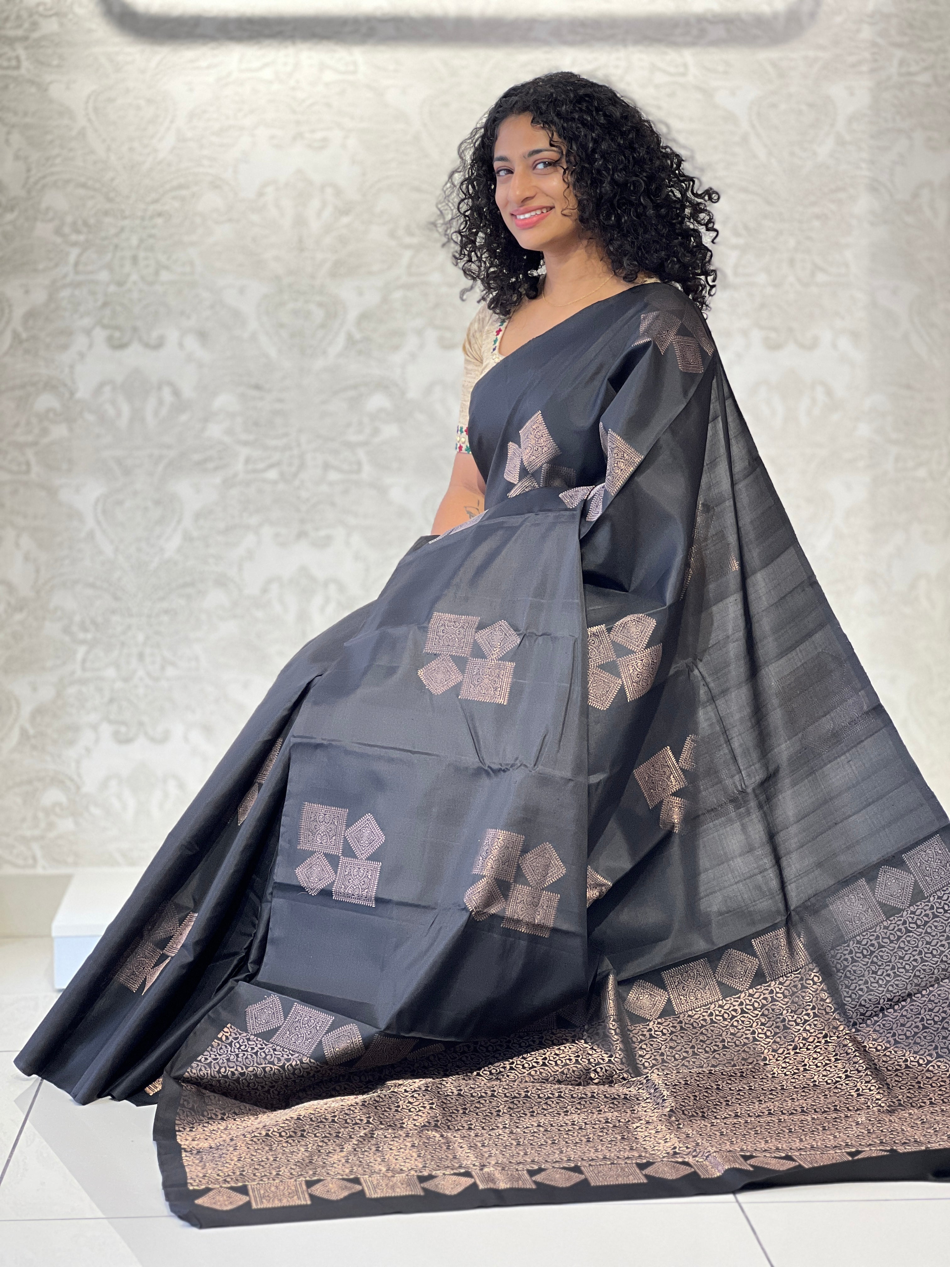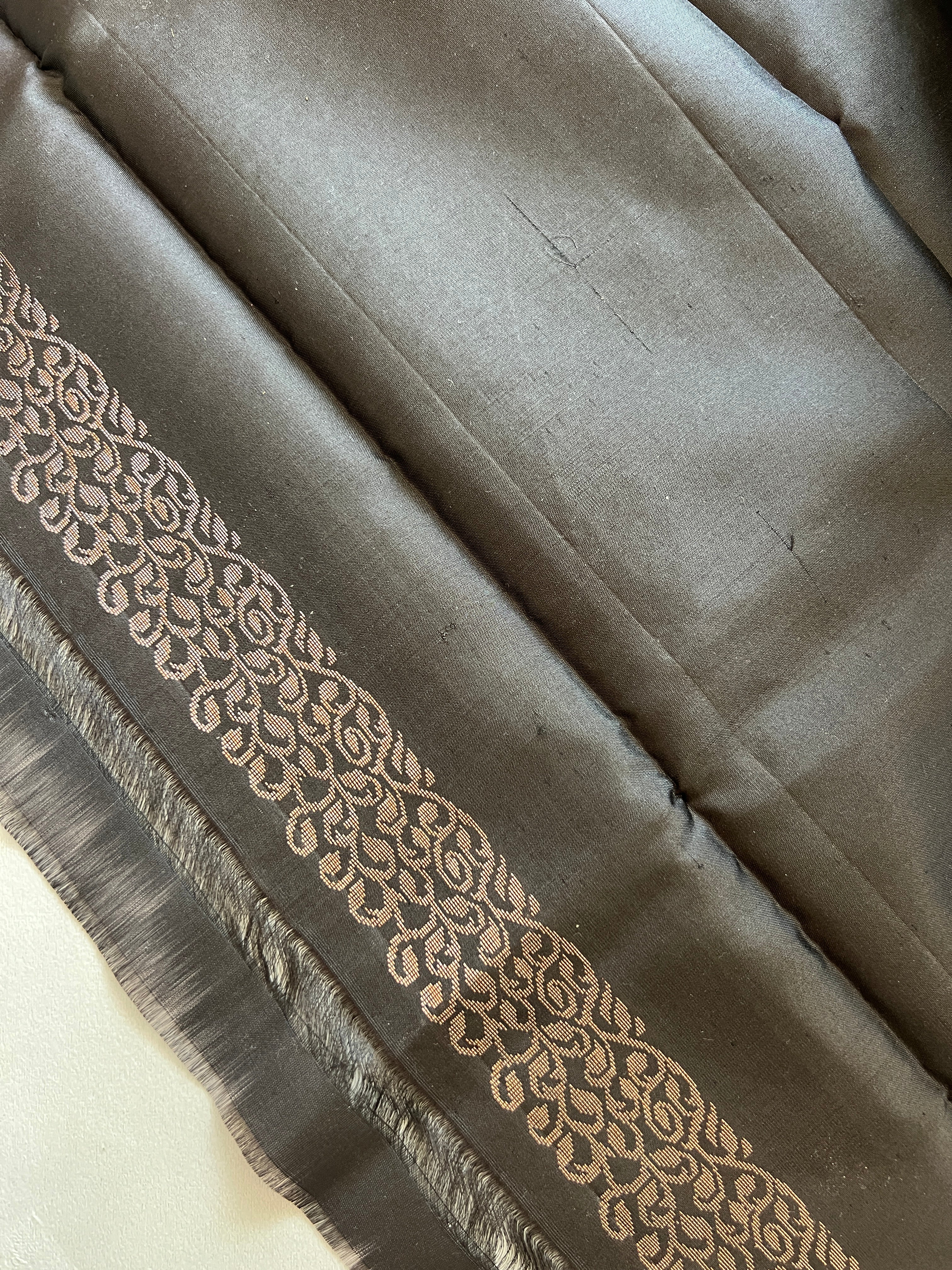 - Style: Silver & Copper Zari Weaved Geometric Pattern, Borderless, Leaf Patterned Pallu