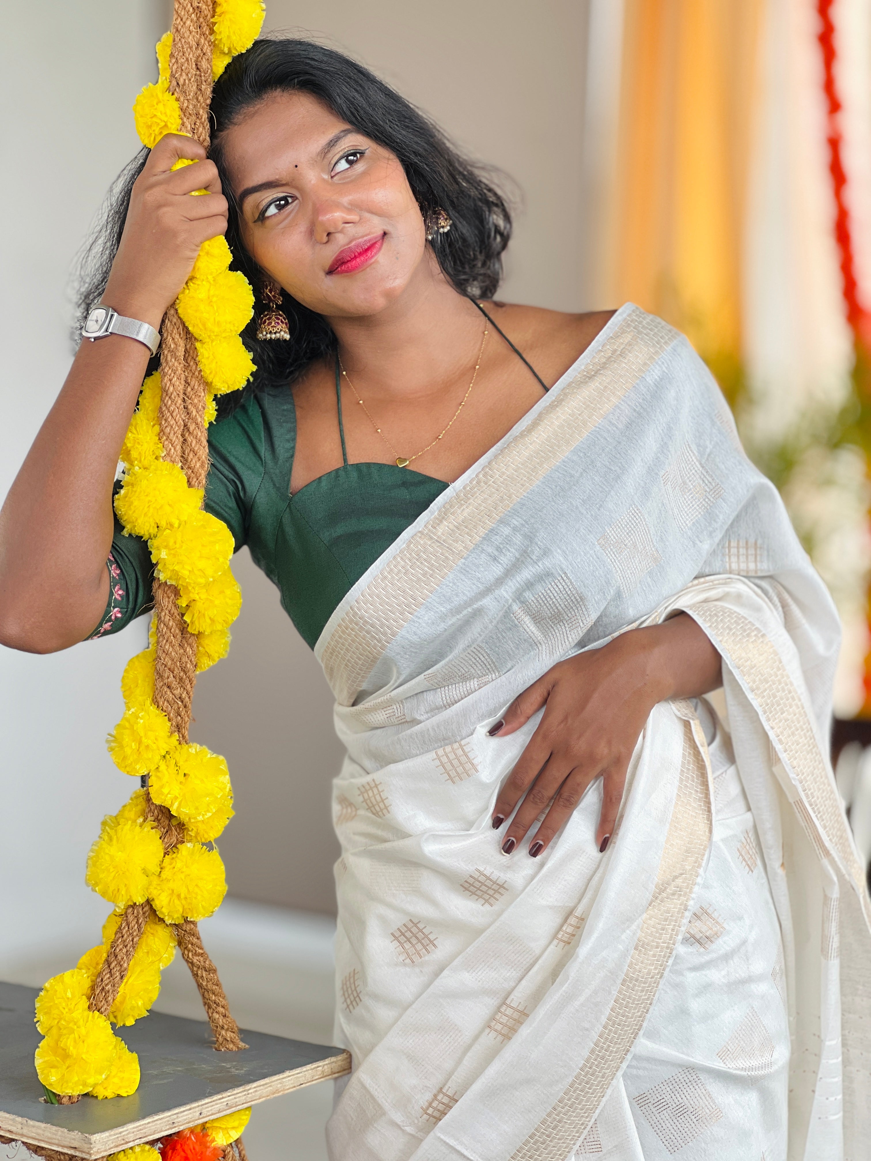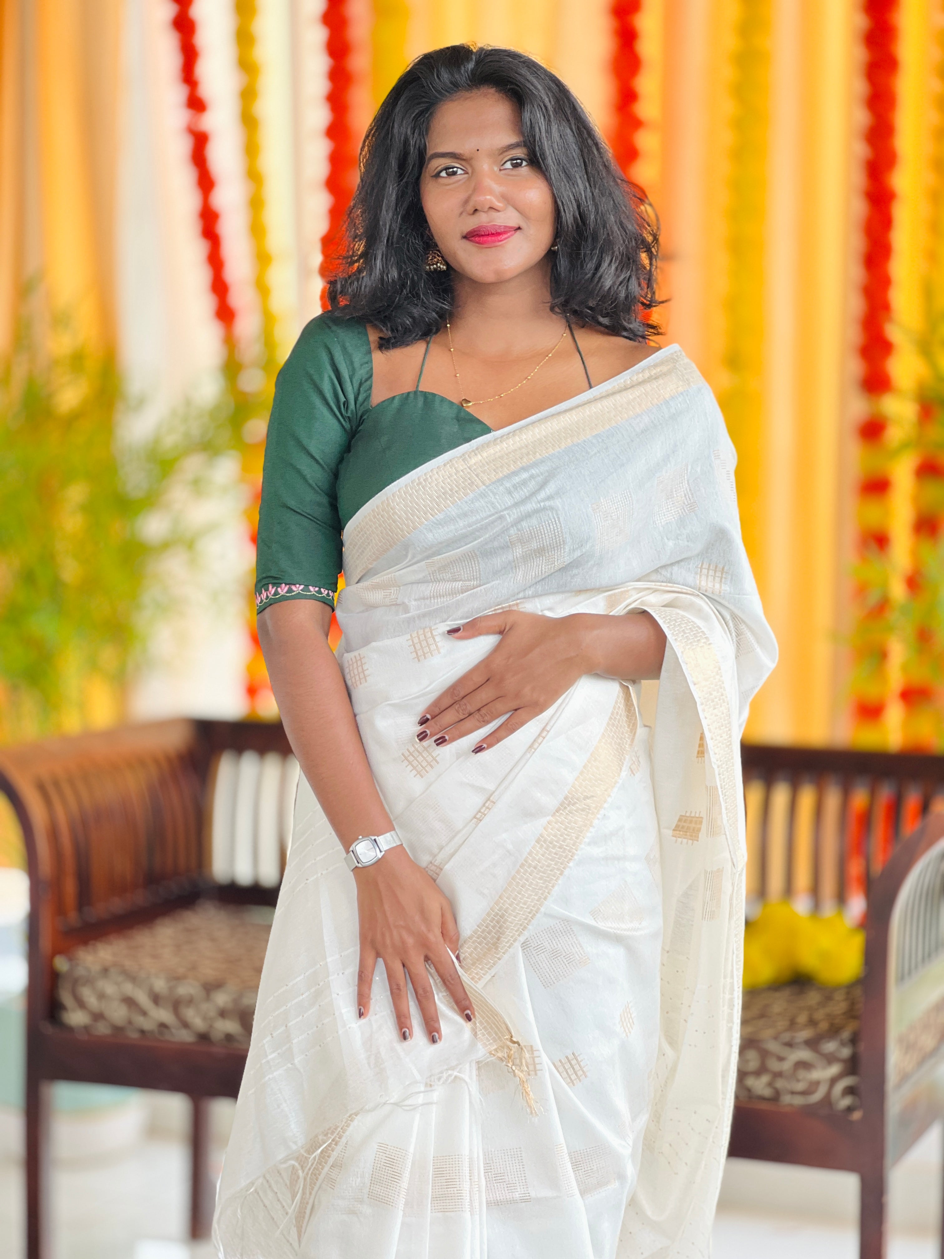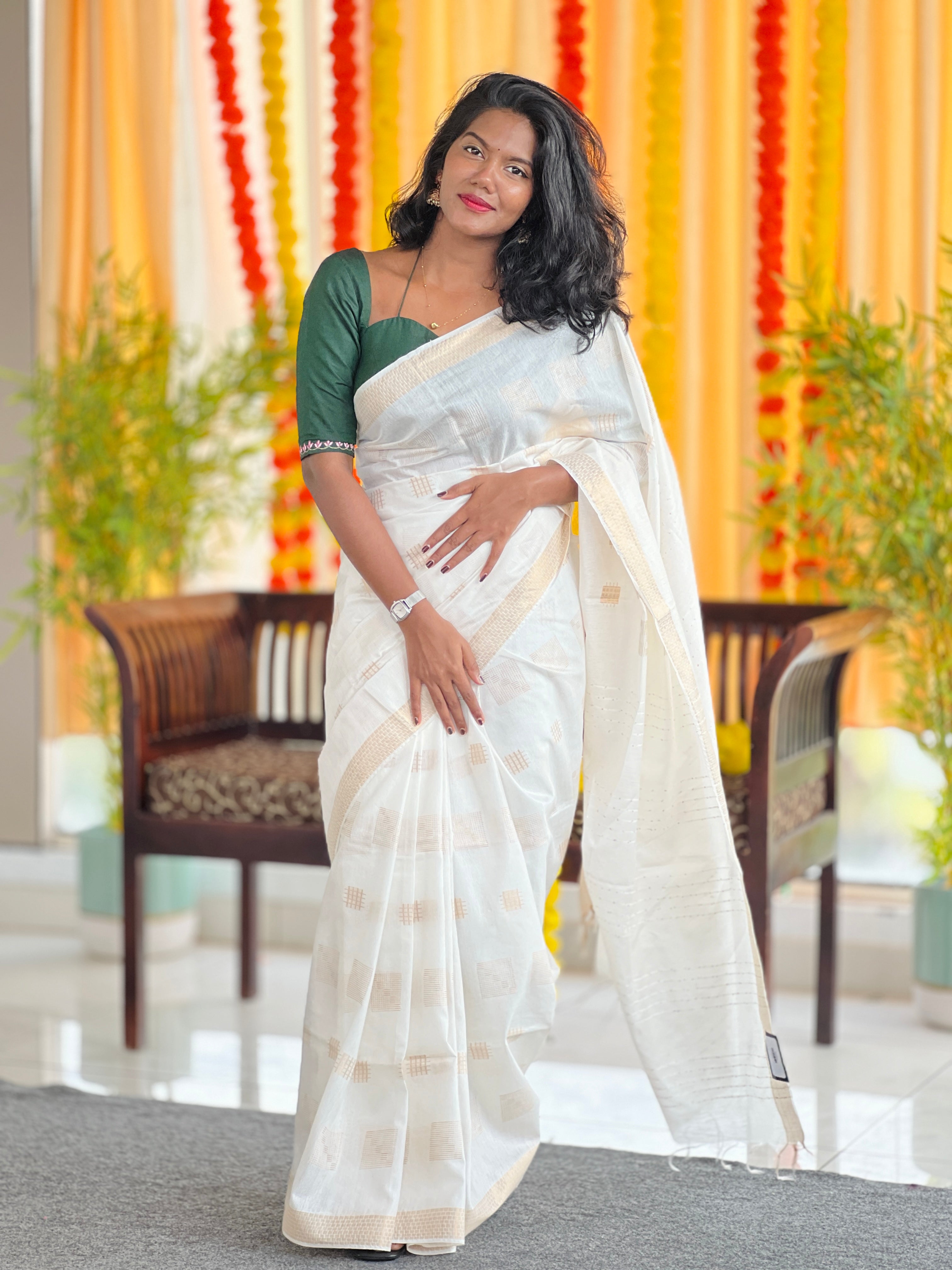 - Style: Zari Weaving , Scattered Square Weaving Pattern, Jacquard Weaved Pallu with Sequence Highlighted, Border Detailing, Self Tassels Attached
