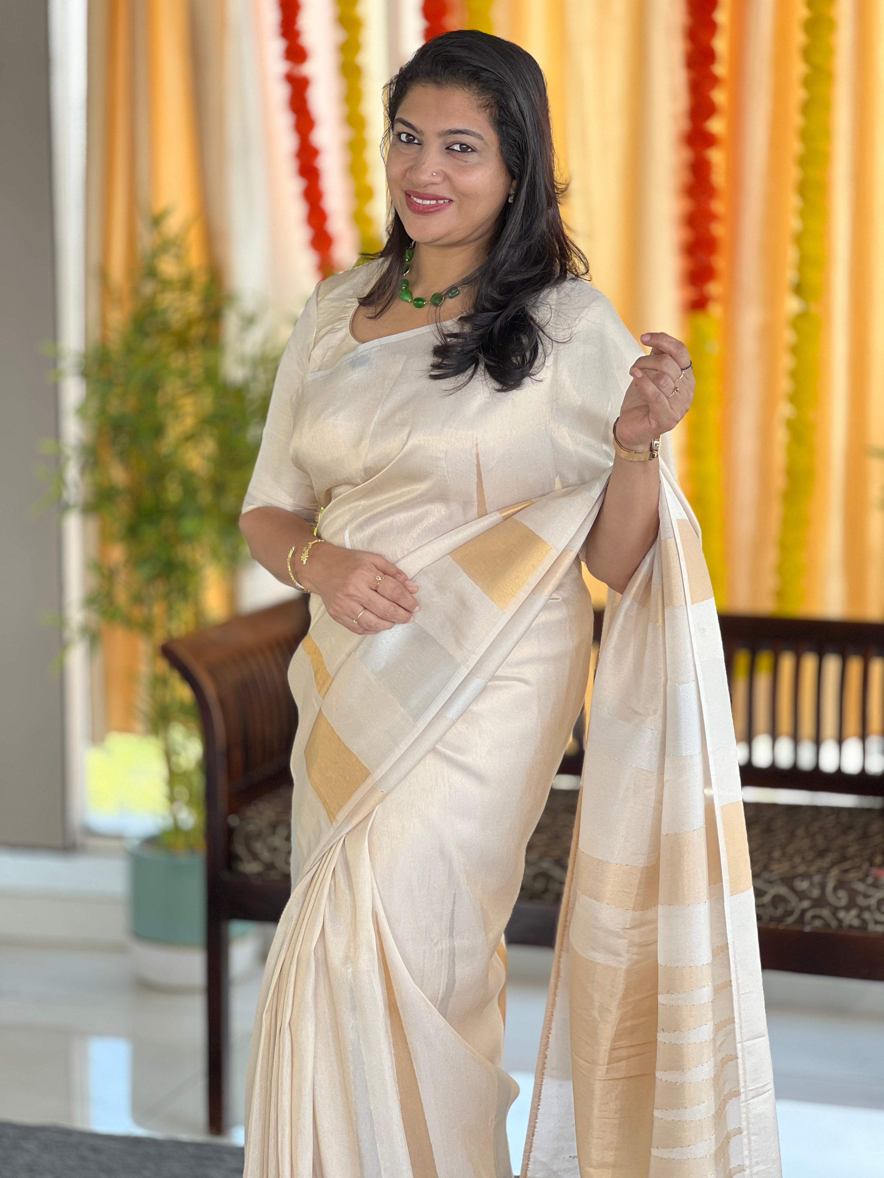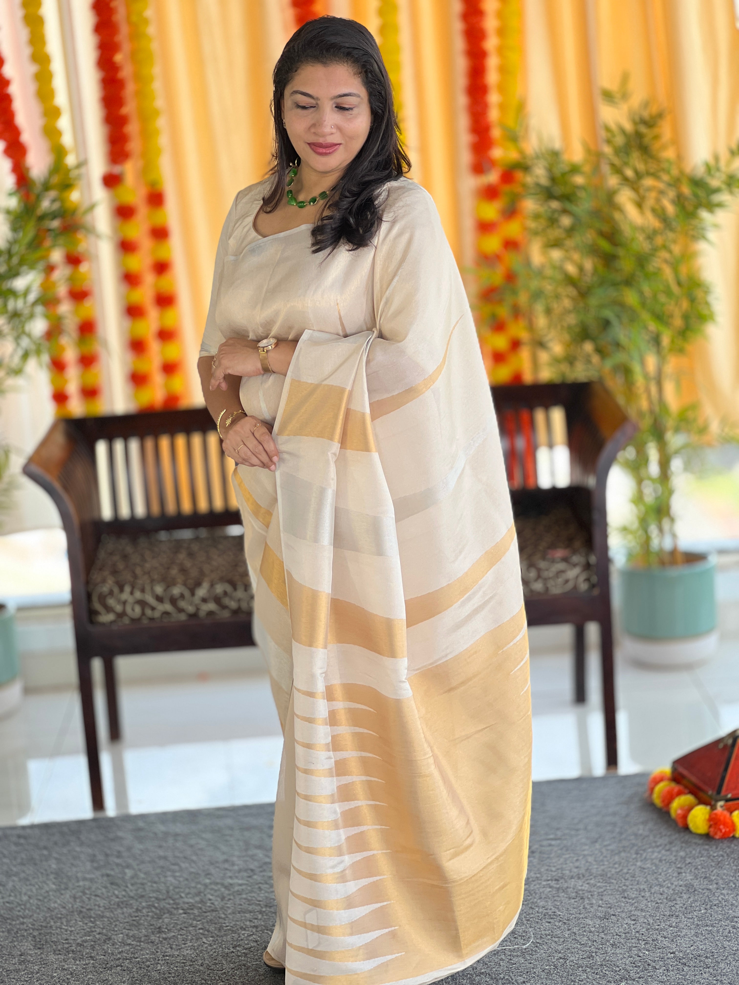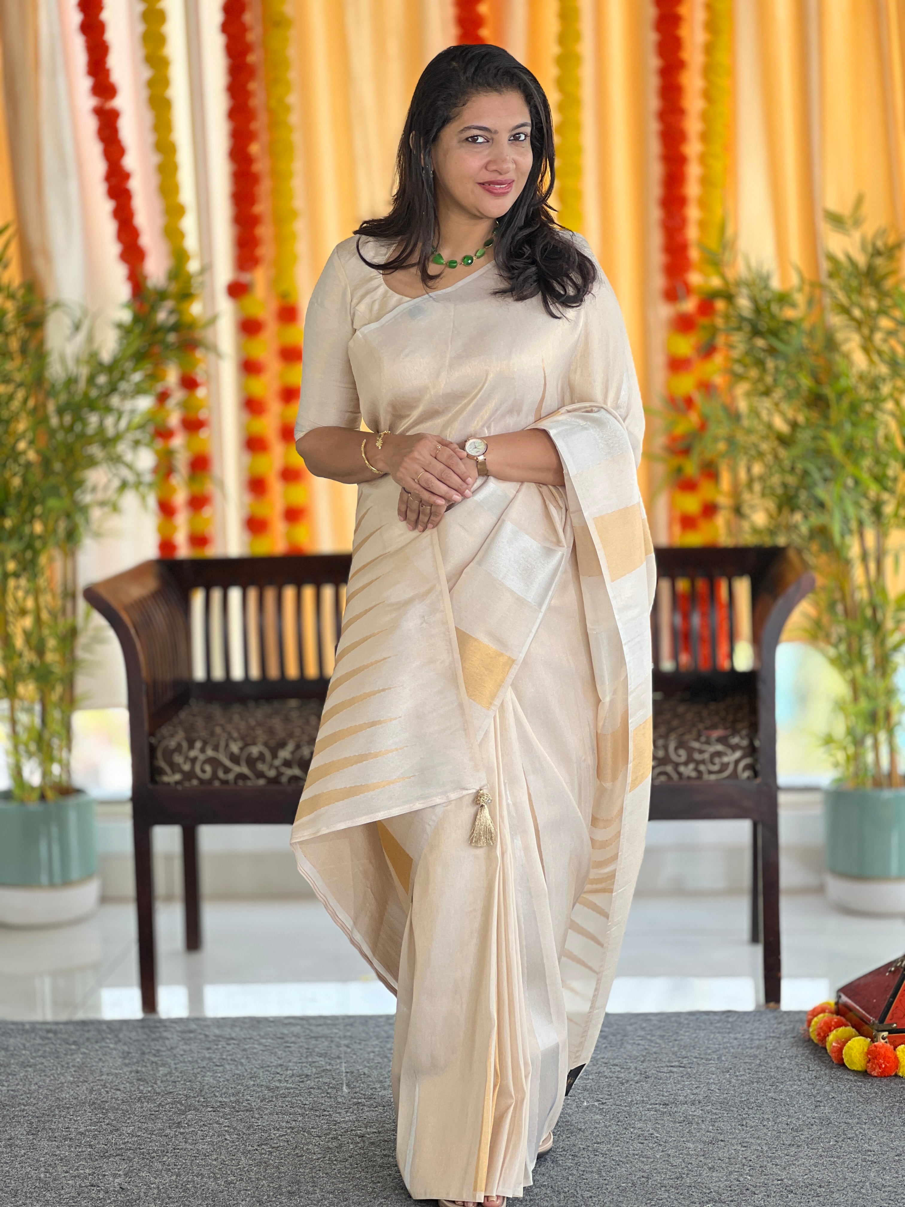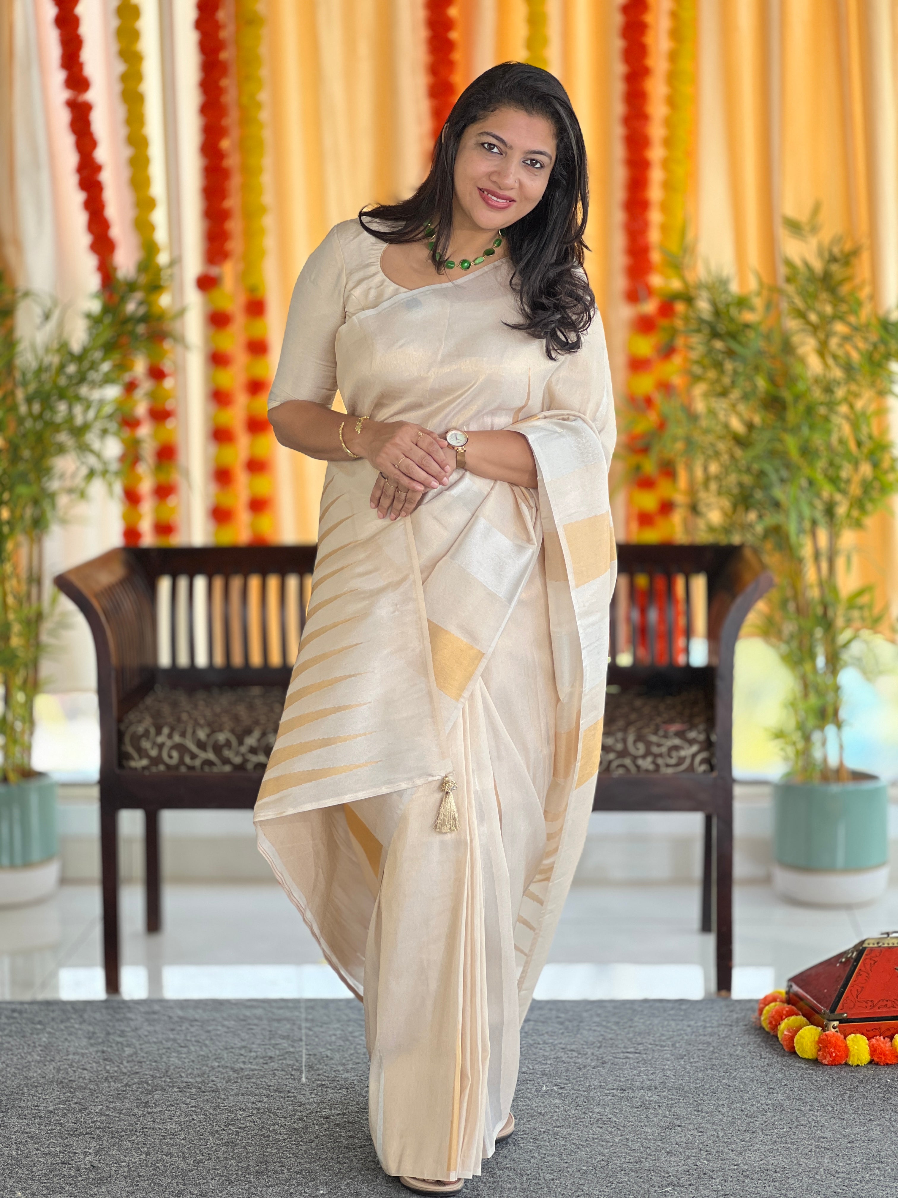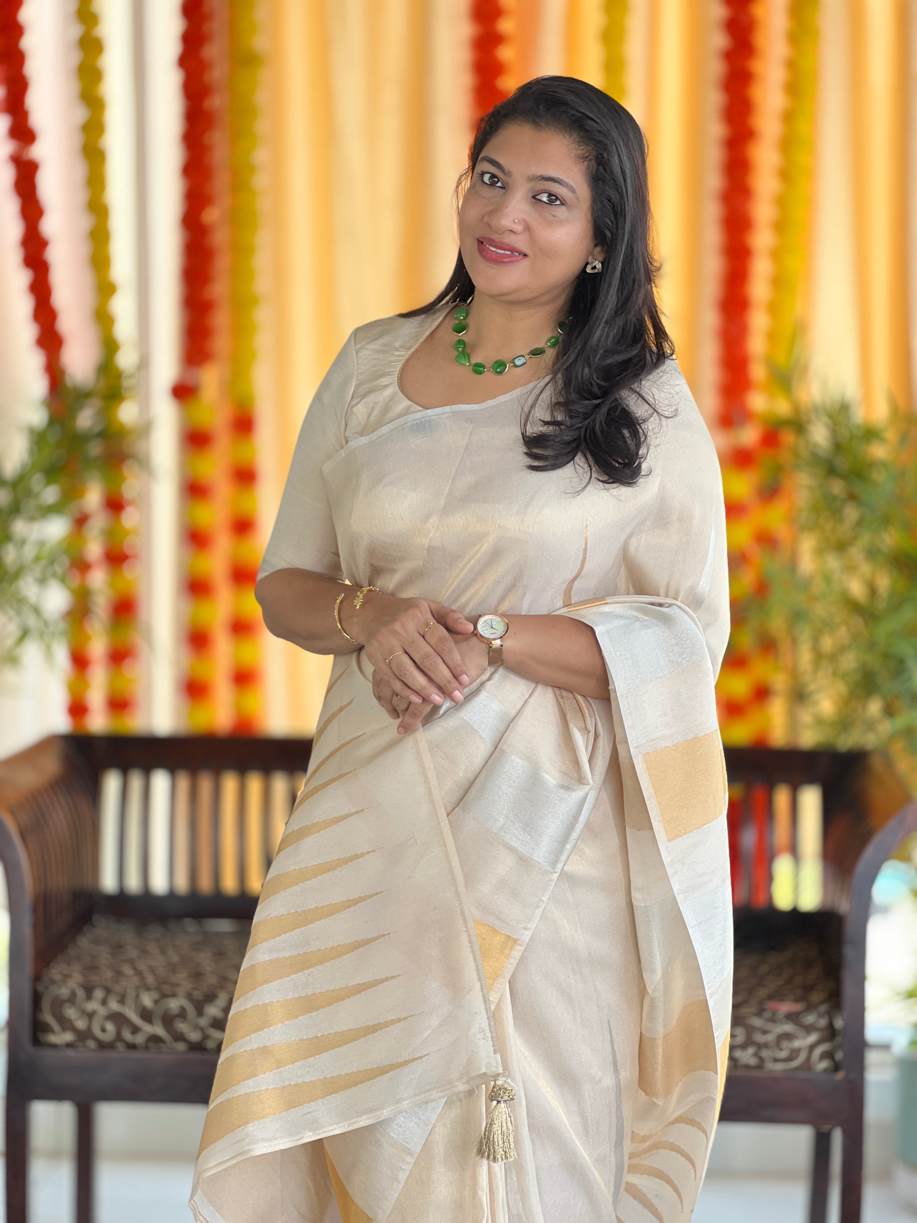 - Style: Tissue Weaved, Silver & Golden Zari Weaving Temple Border Detailing, Zari Weaved Pallu, Jhumka Tassels Detailing