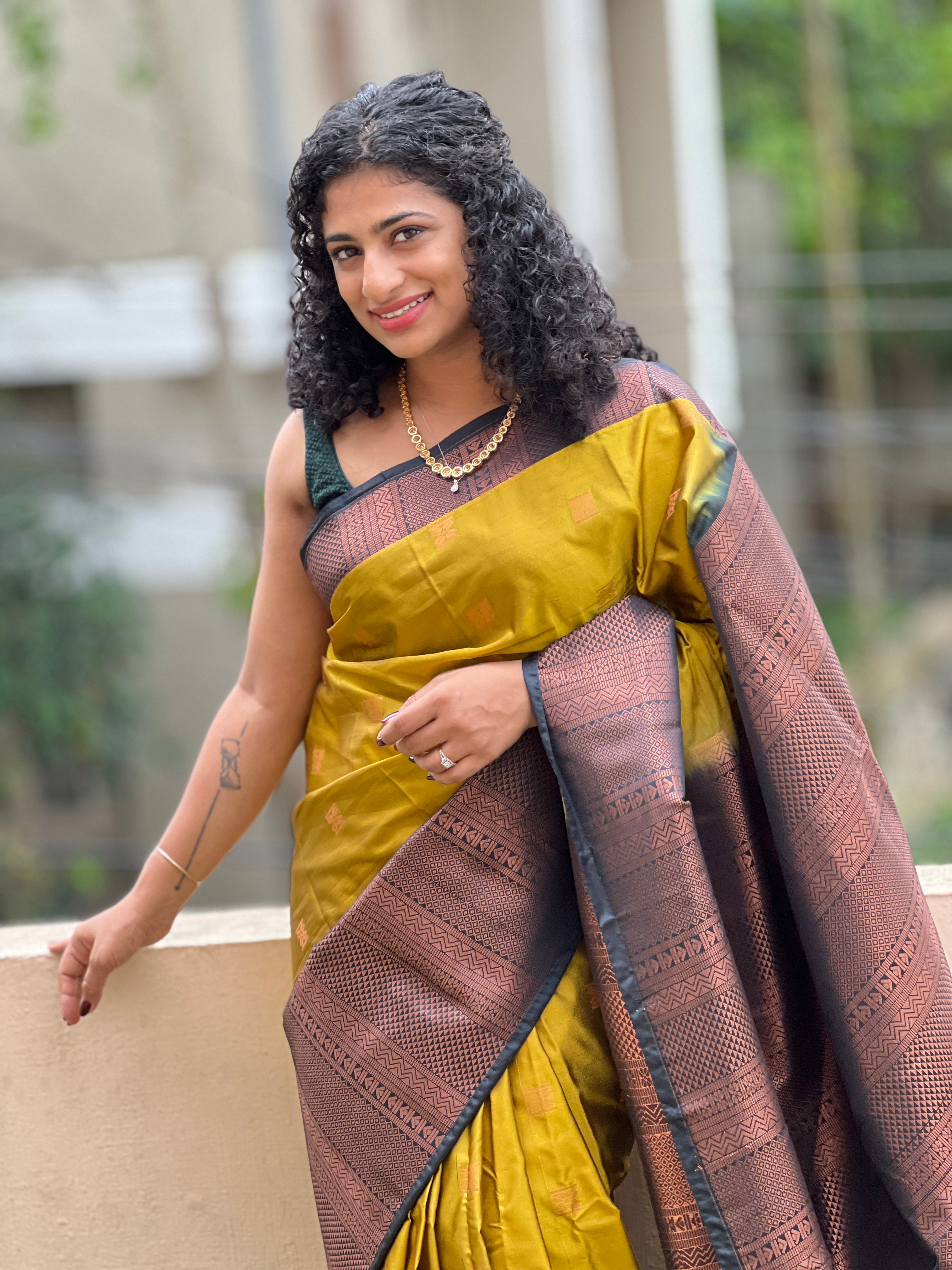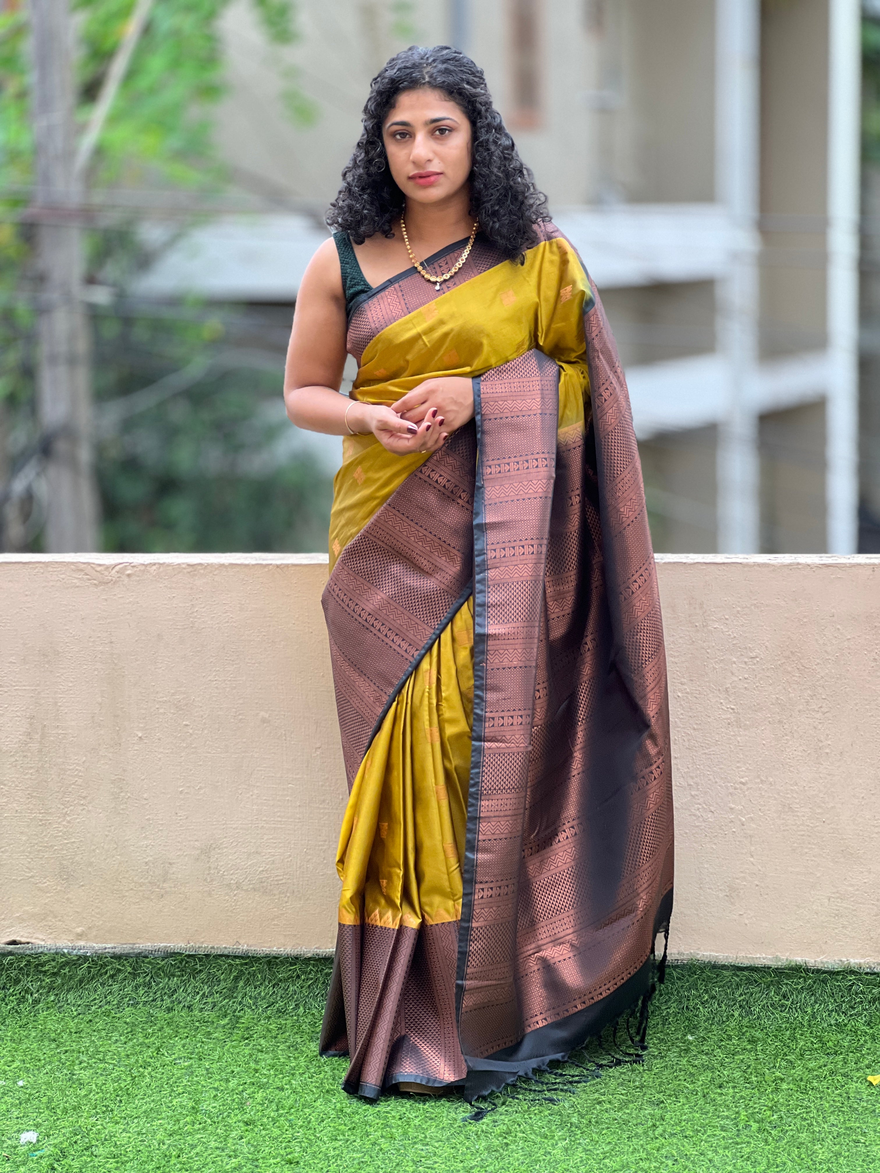 - Style: Zari Weaving Pattern, Contrast Border & Pallu, Geometrical Weaving Border Pattern