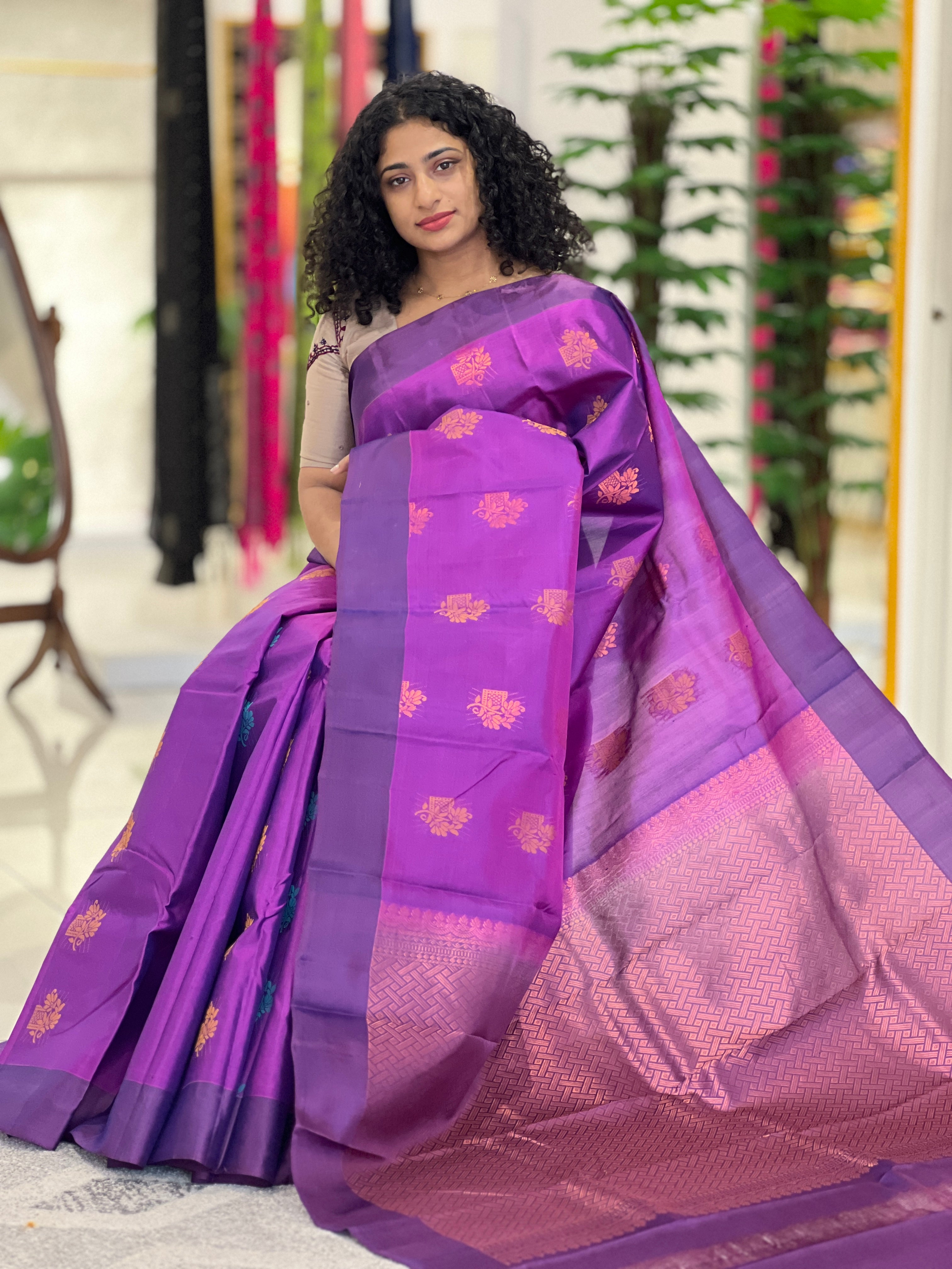 - Style: Zari Weaving Buta Design, Contrast Border & Pallu