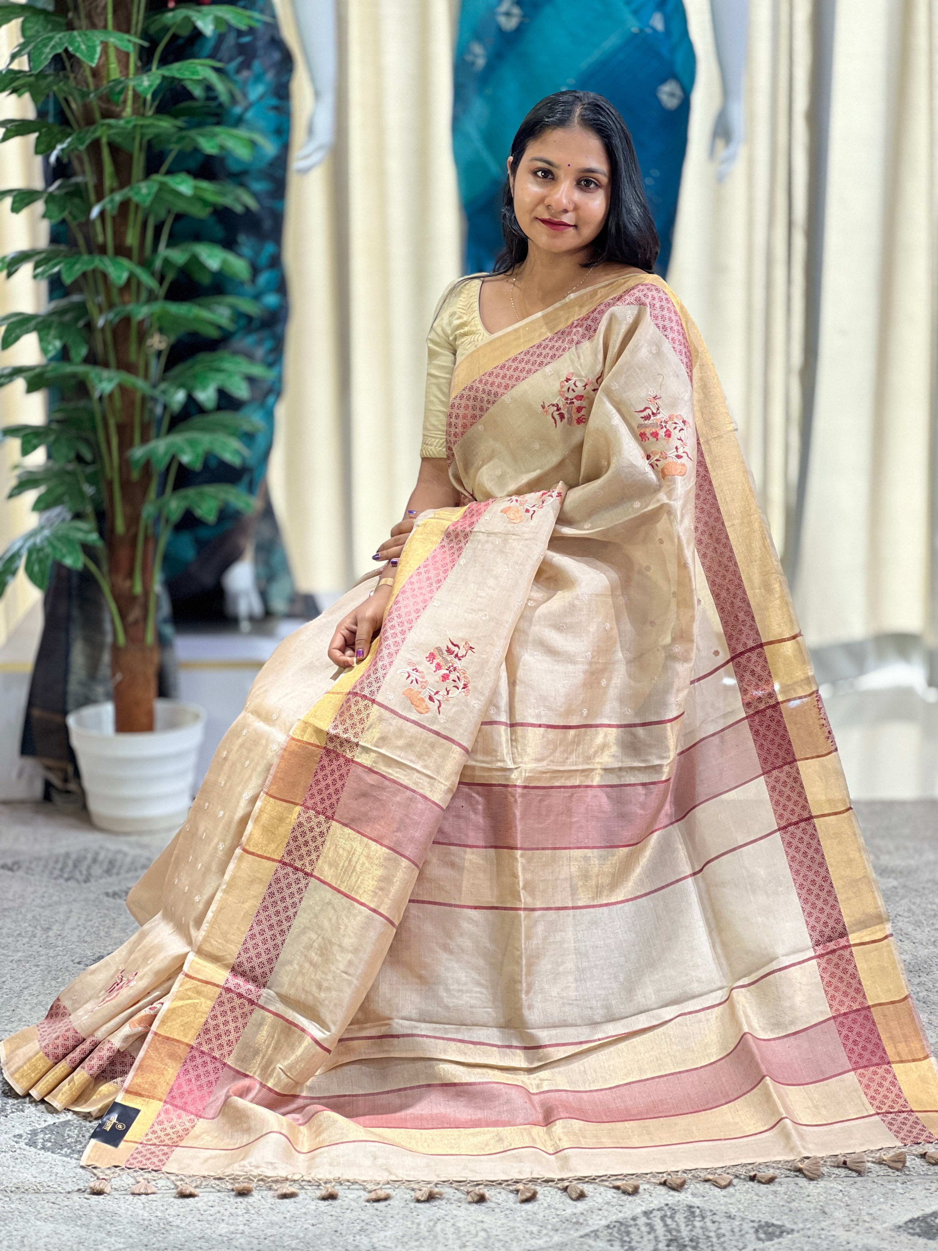- Style: Golden Zari Weaving Border, Thred Embroidery Detailing, Scattered Buttas and Floral Embroidery Pattern, Stripes Patterned Pallu, Tassels Attaching
