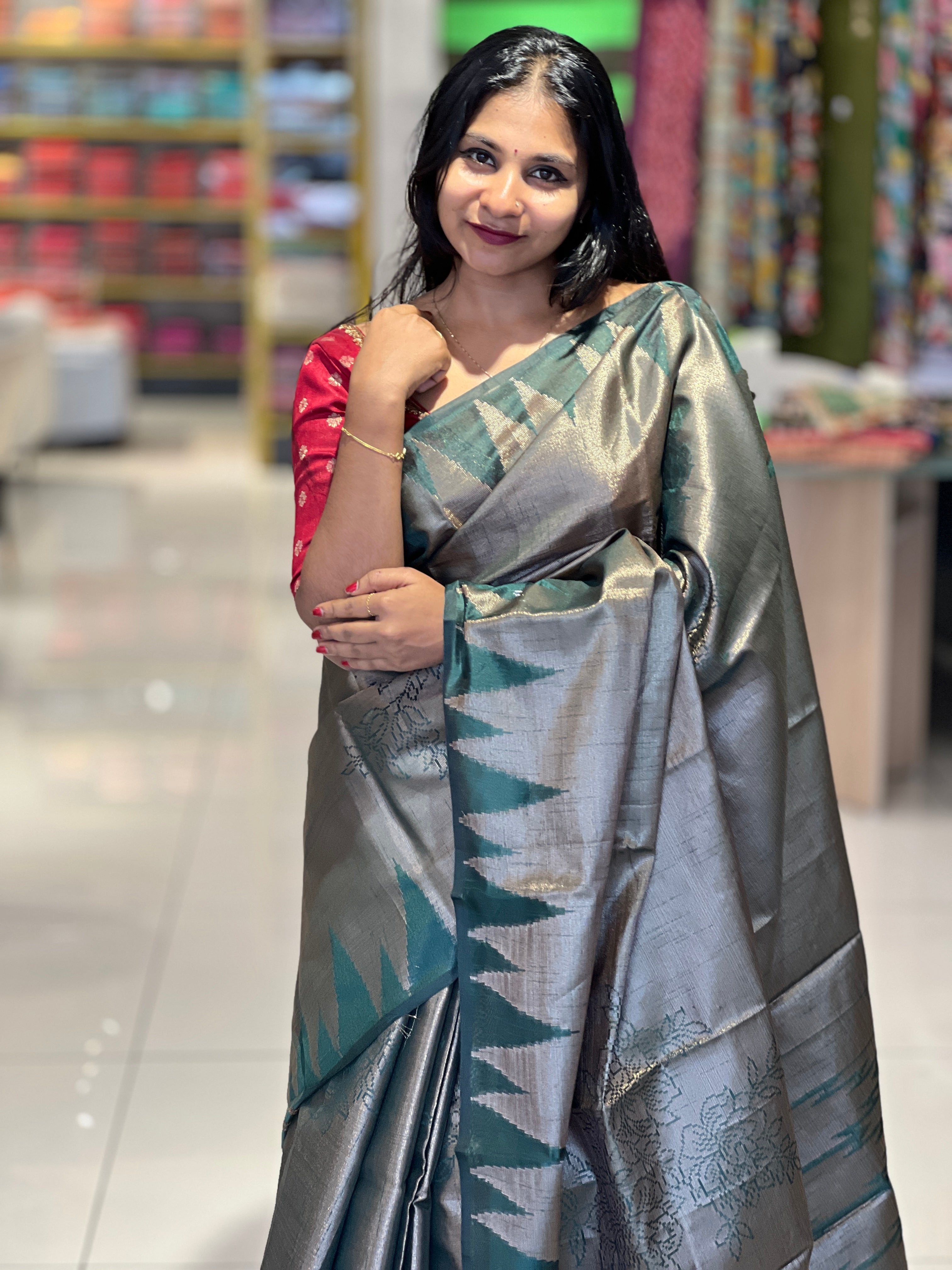 • Style: Zari Woven,  Floral Weaving Pattern Temple Borders, Brocade Pattern, Tassels Attached