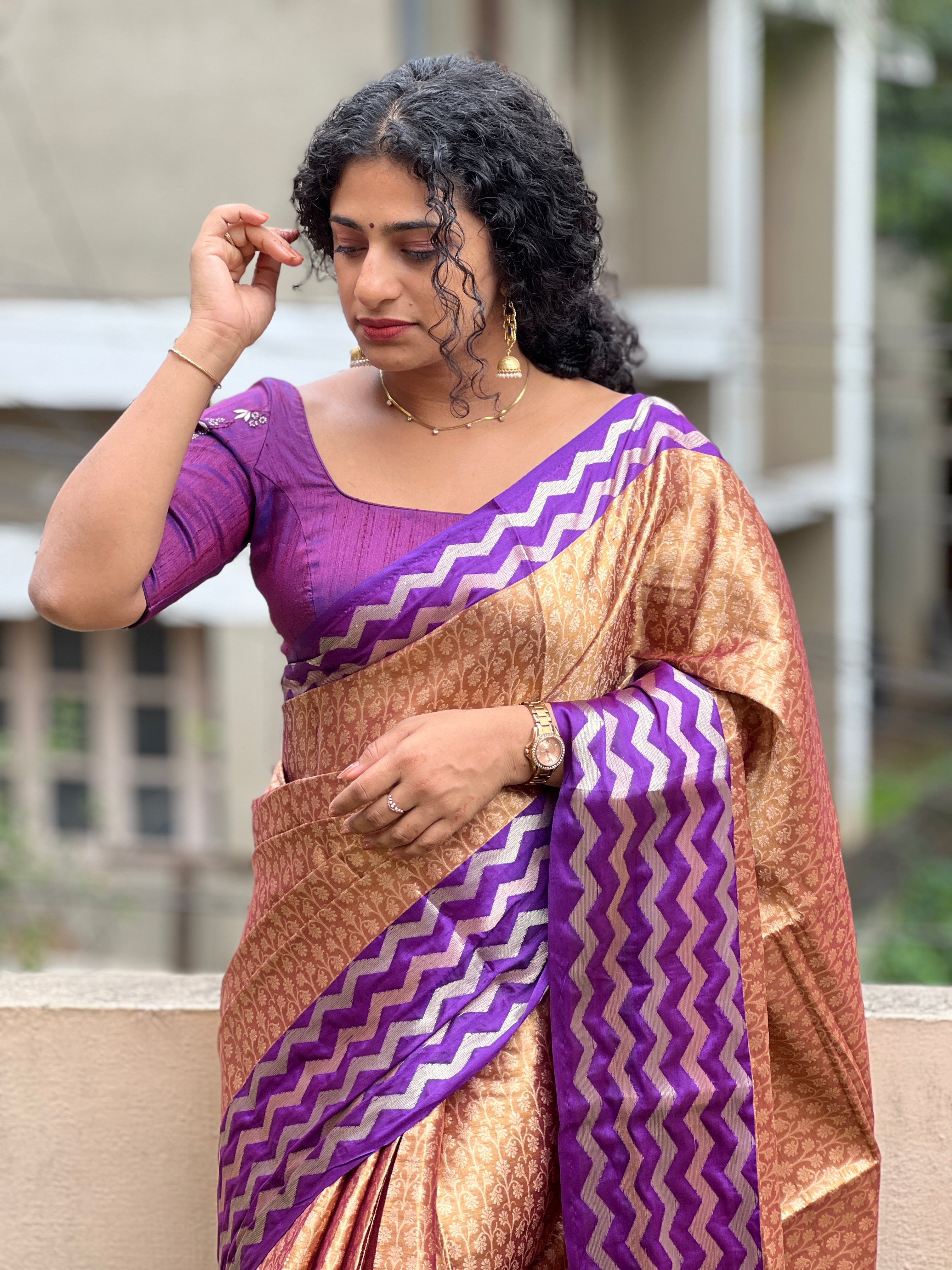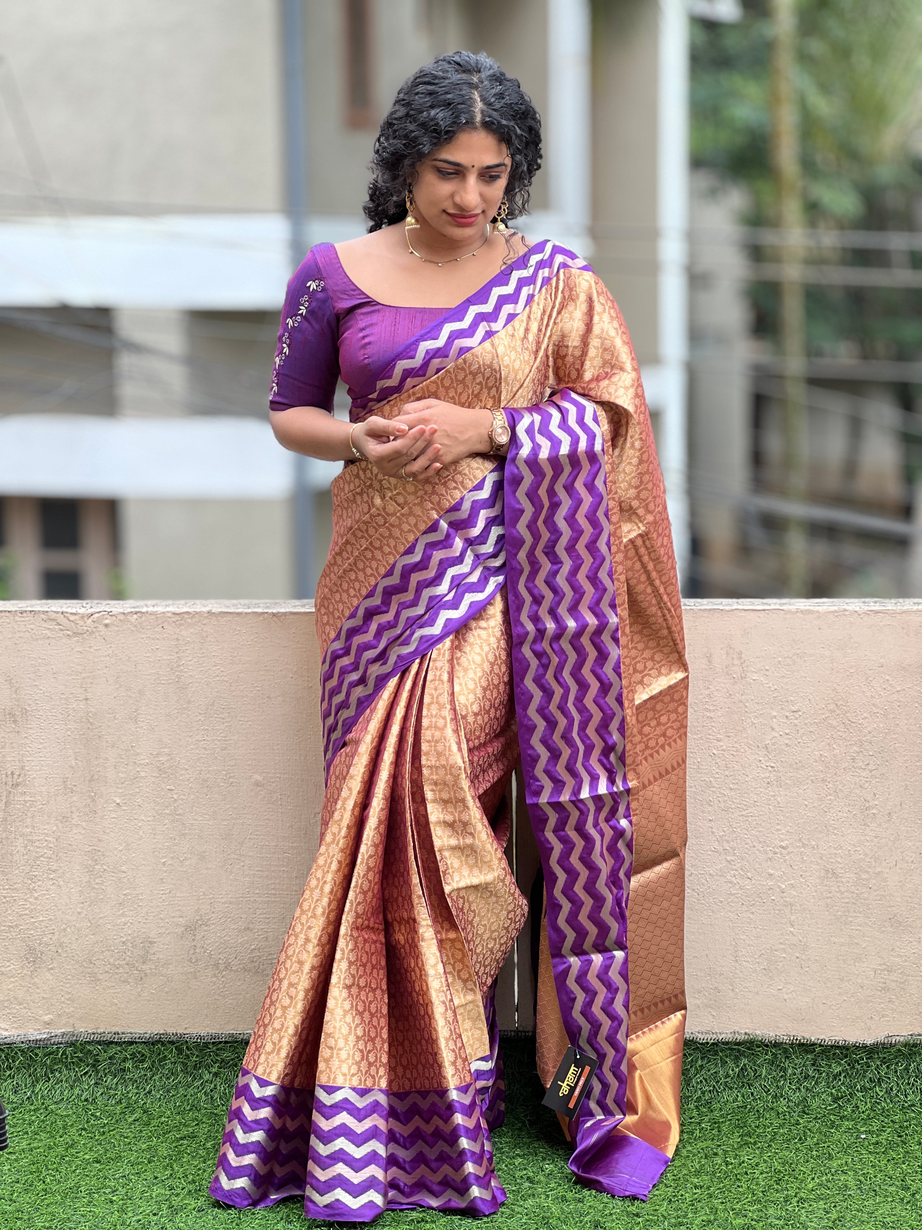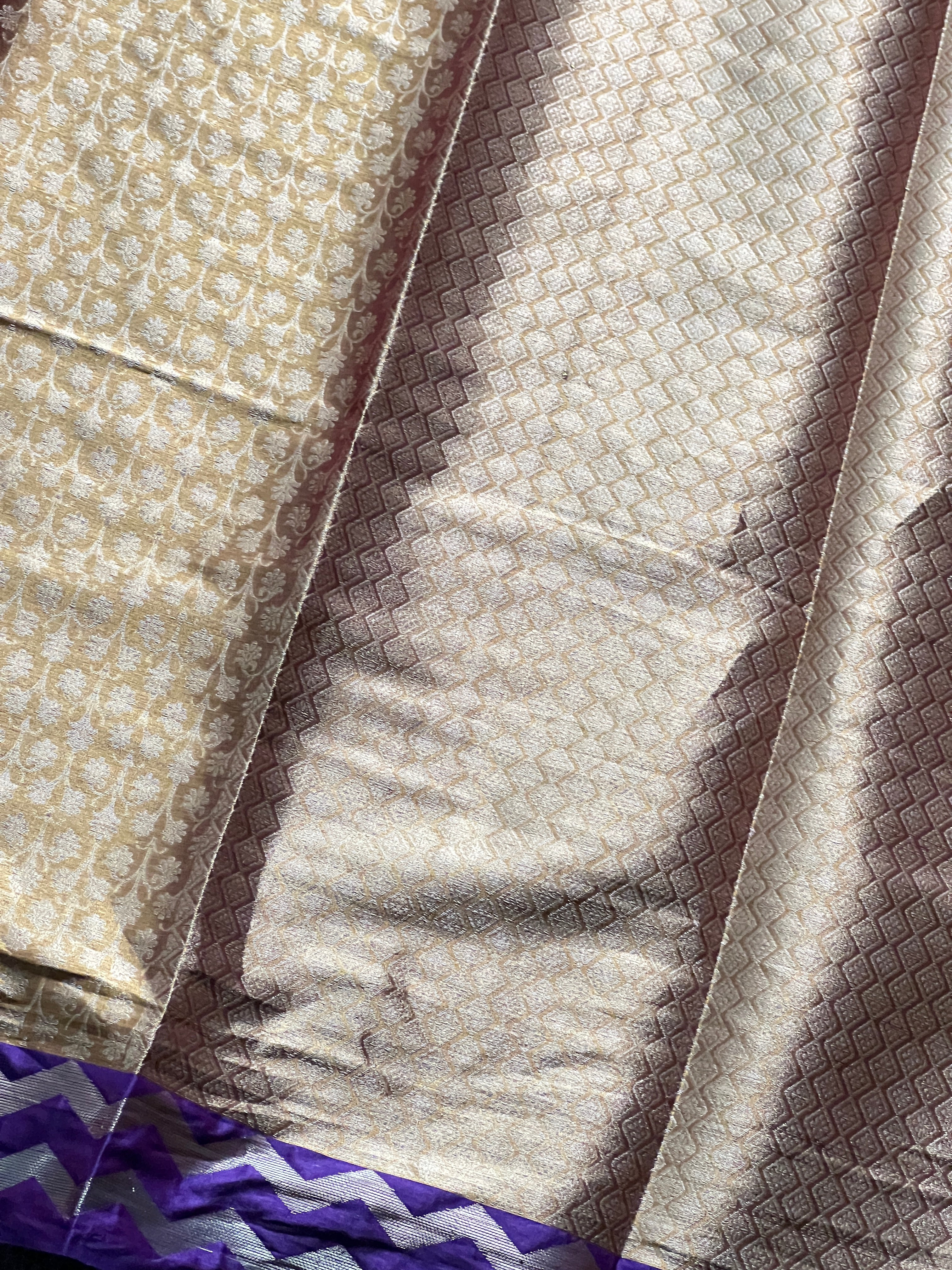 - Style: Antique Golden & Light Golden Floral Design, Multi-Tone Zig Zag Borders, Diamond Patterned Pallu