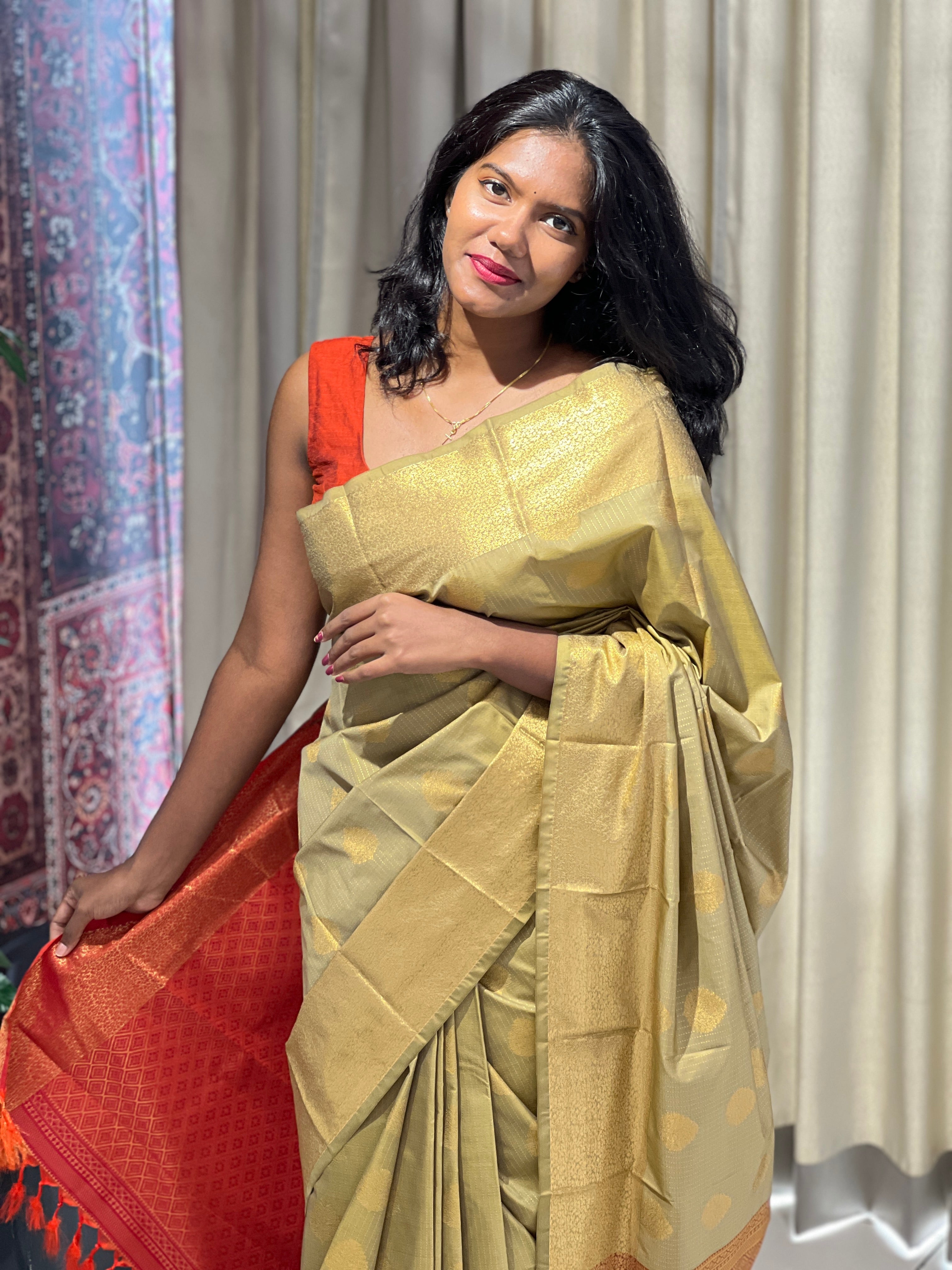 - Style: Zari Weaved, Scattered Butta Placement, Contrast Pallu, Jaal Patterned Border Detailing, Self Tassels Attached