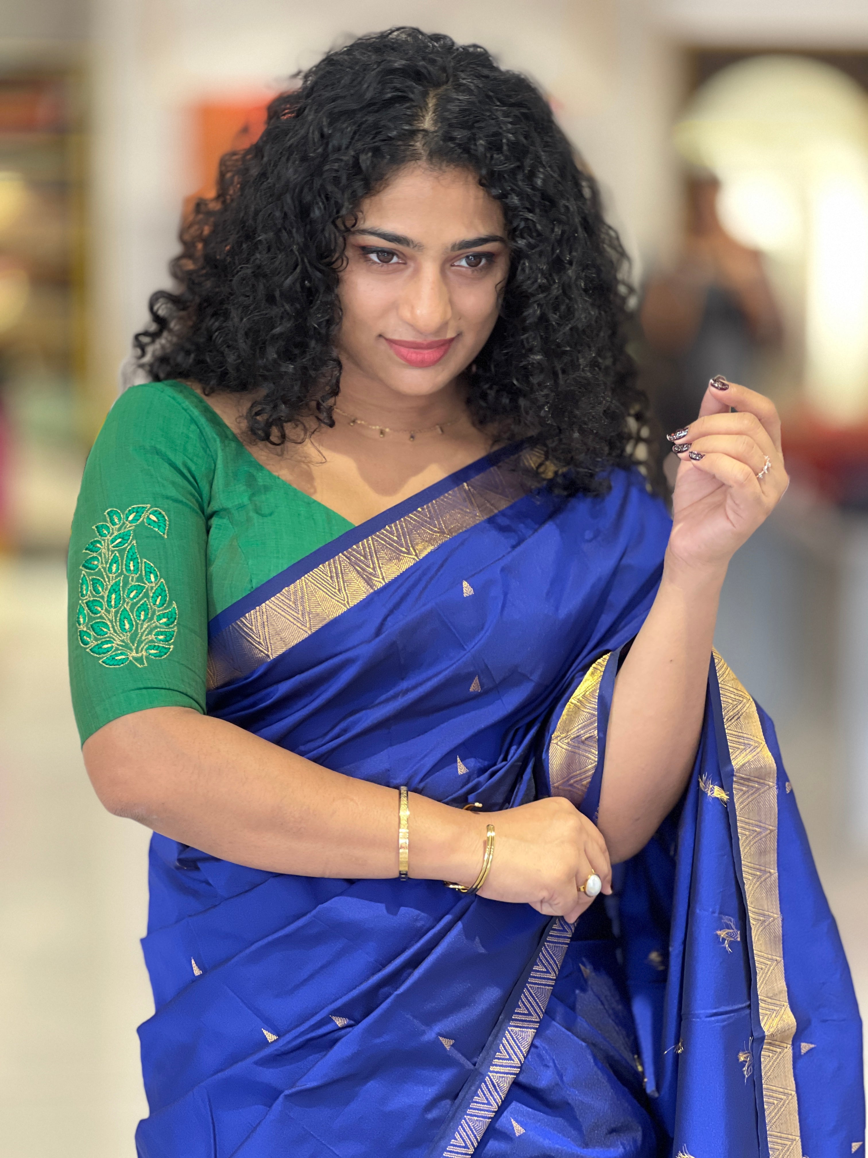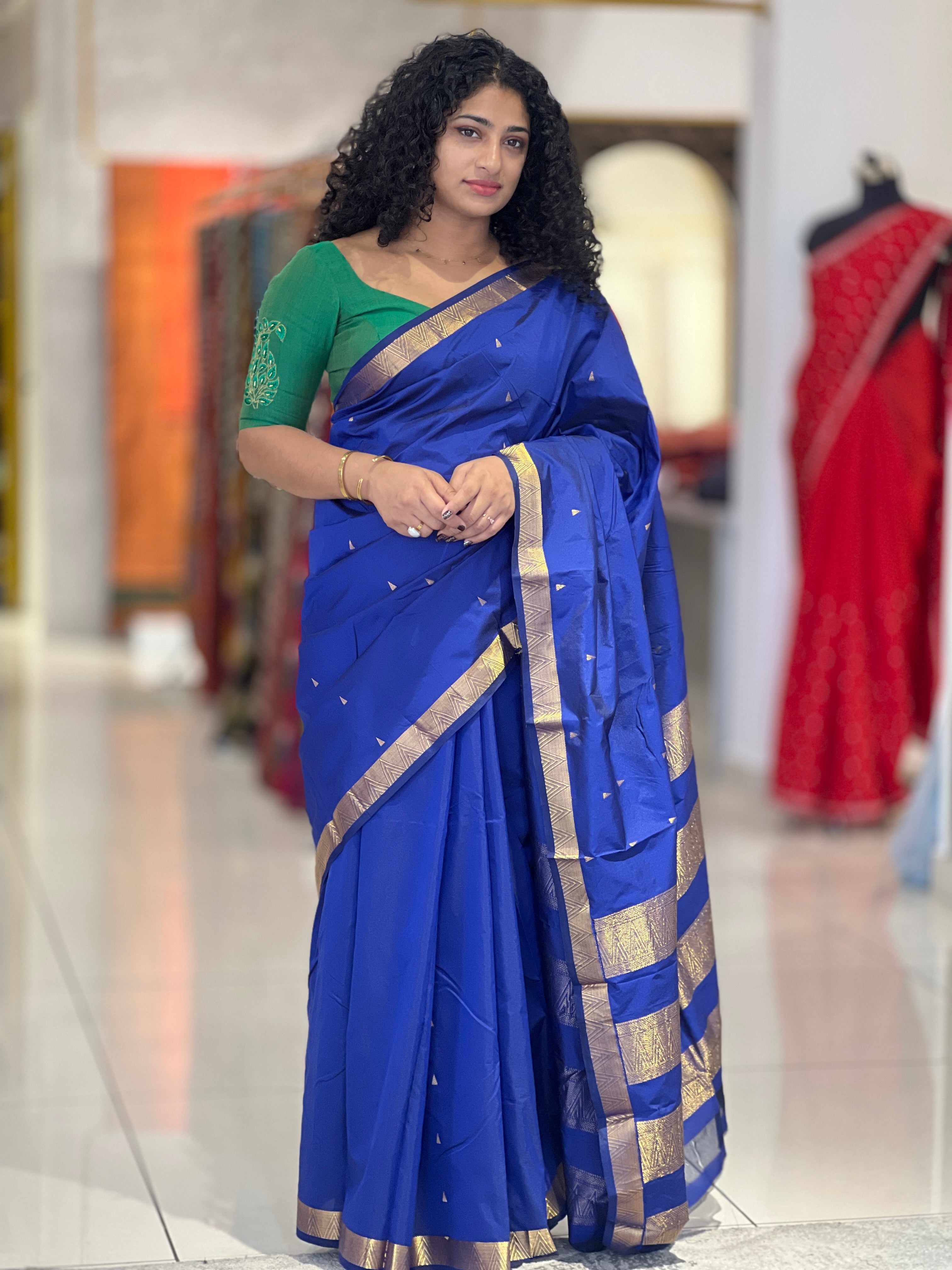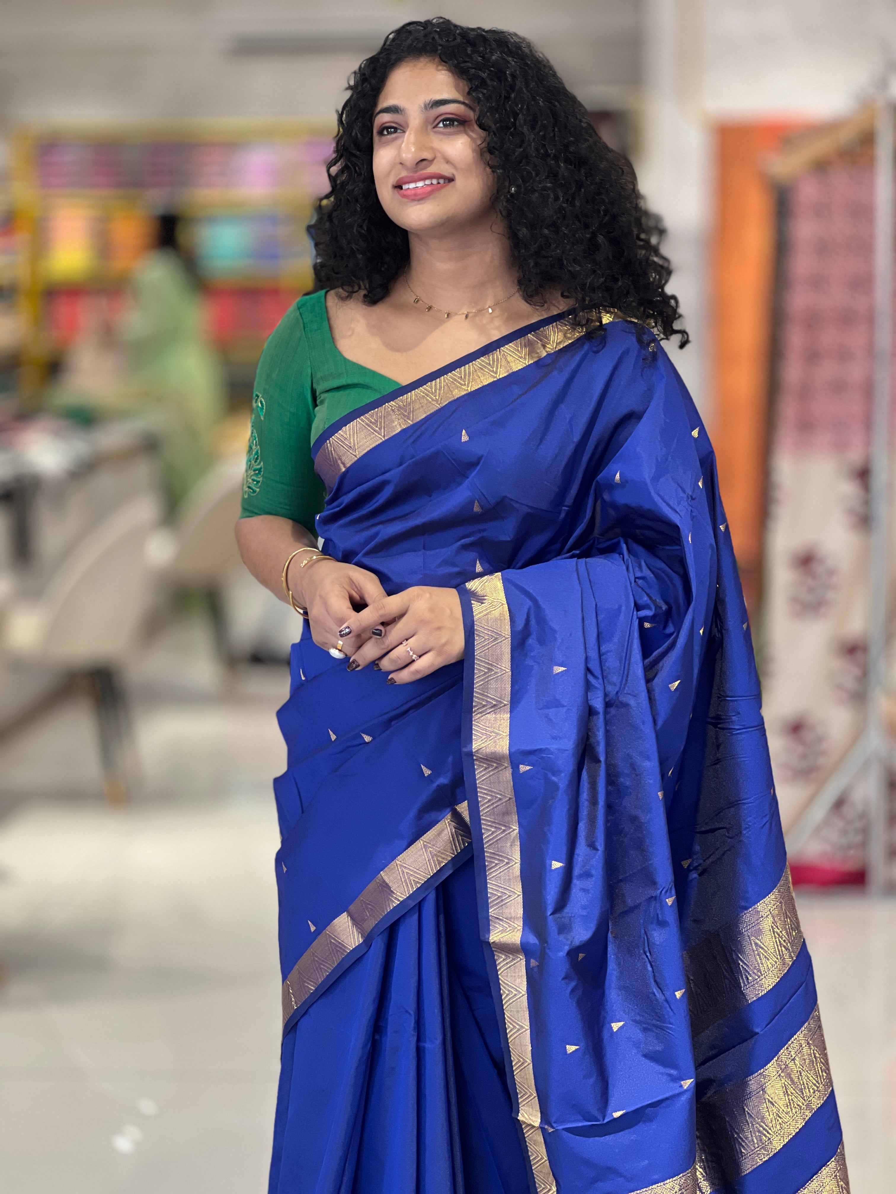 - Style: Zari Woven, Scattered Triangular Motifs, Zari Borders, Zari Stripe Patterned Pallu
