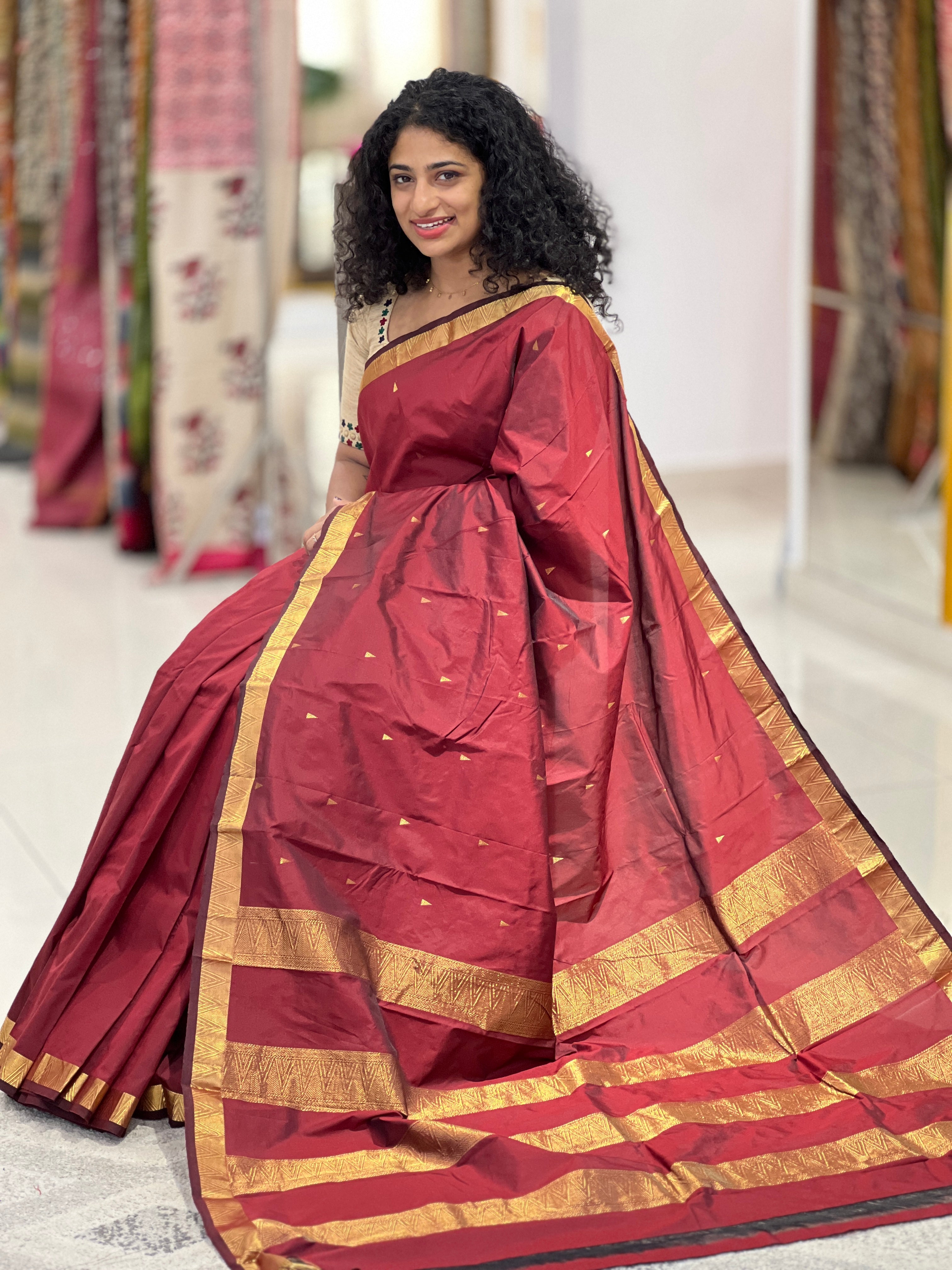 • Style: Zari Woven, Scattered Triangular Motifs, Zari Borders, Zari Stripe Patterned Pallu