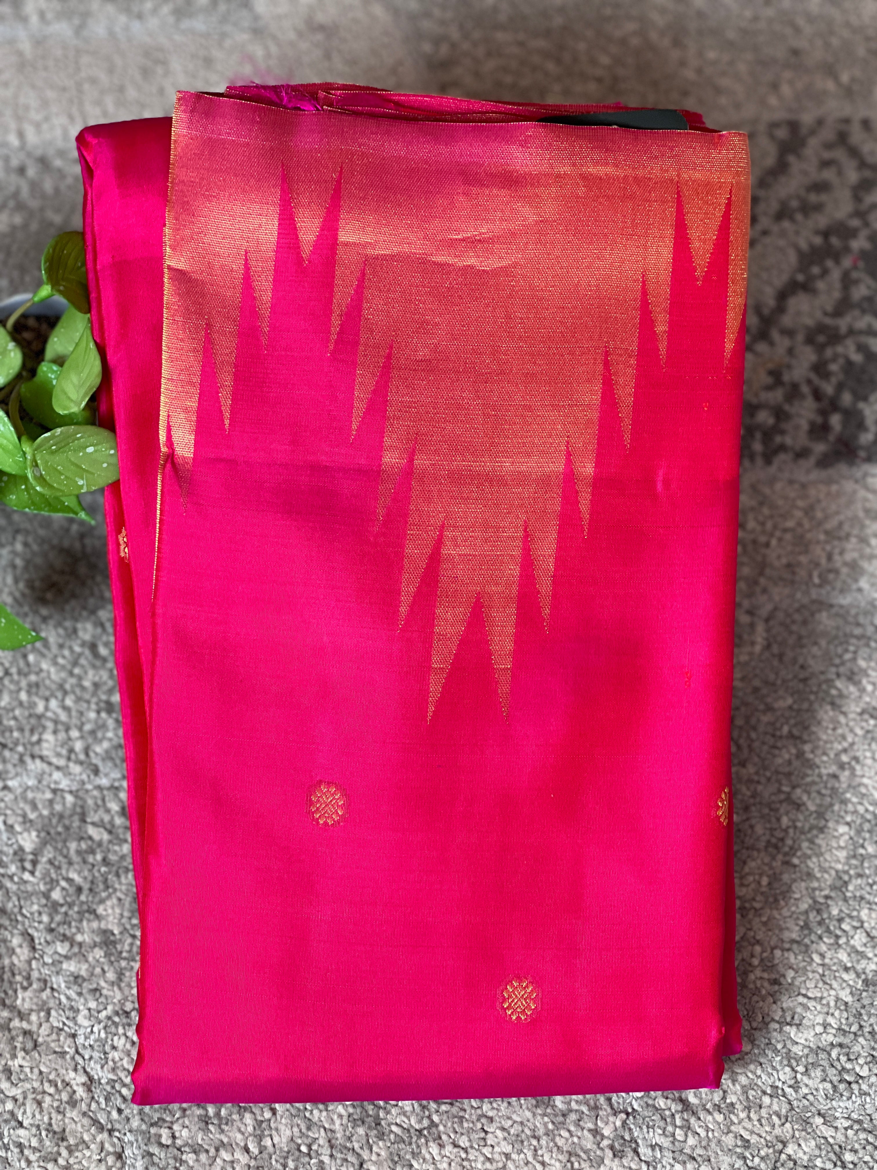 - Style: Zari Woven Temple Border Detailing, Scattered Zari Woven Butas, Box Patterned Pallu With Zig Zag Pattern