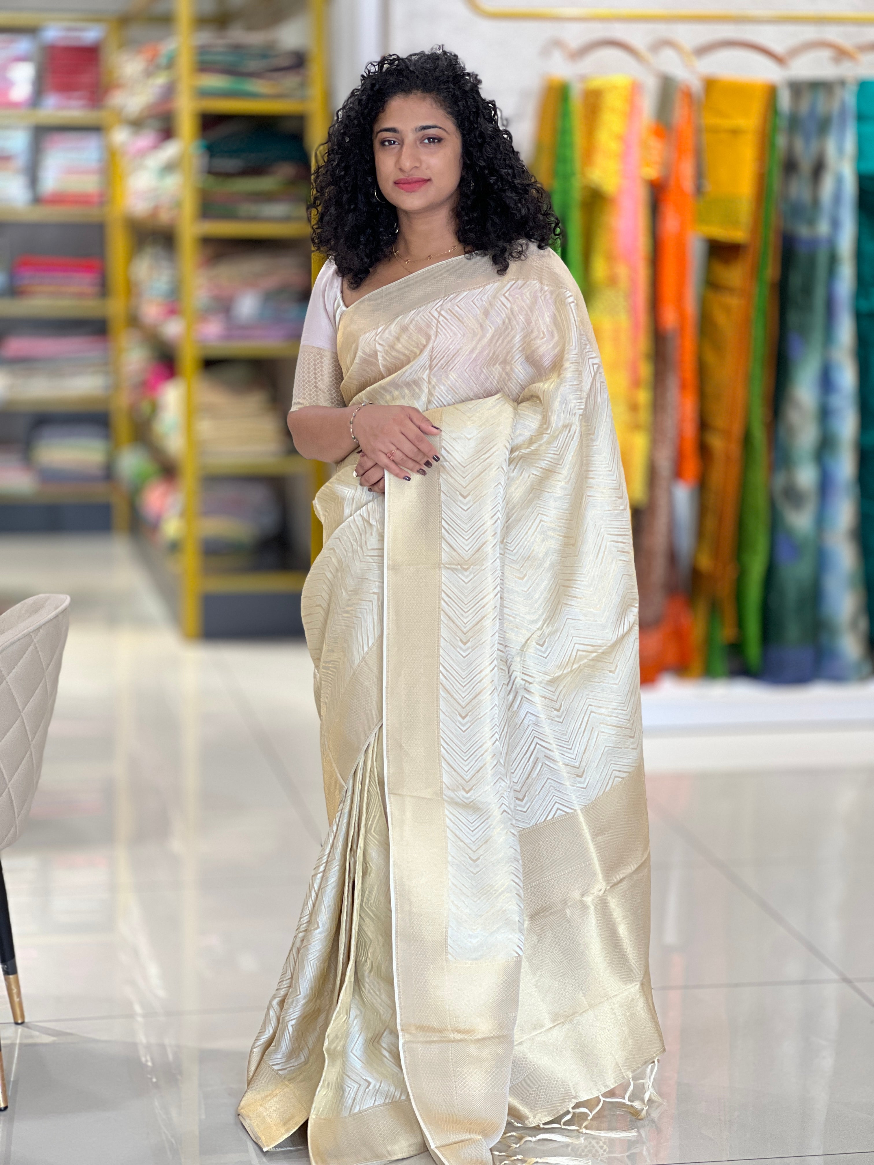 - Style: Zig Zag Pattern, Satin Finished, Lurex Yarns With Zari Weaved Pattern, Geometric Patterned Borders & Pallu, Powerloom, Tassels Attached