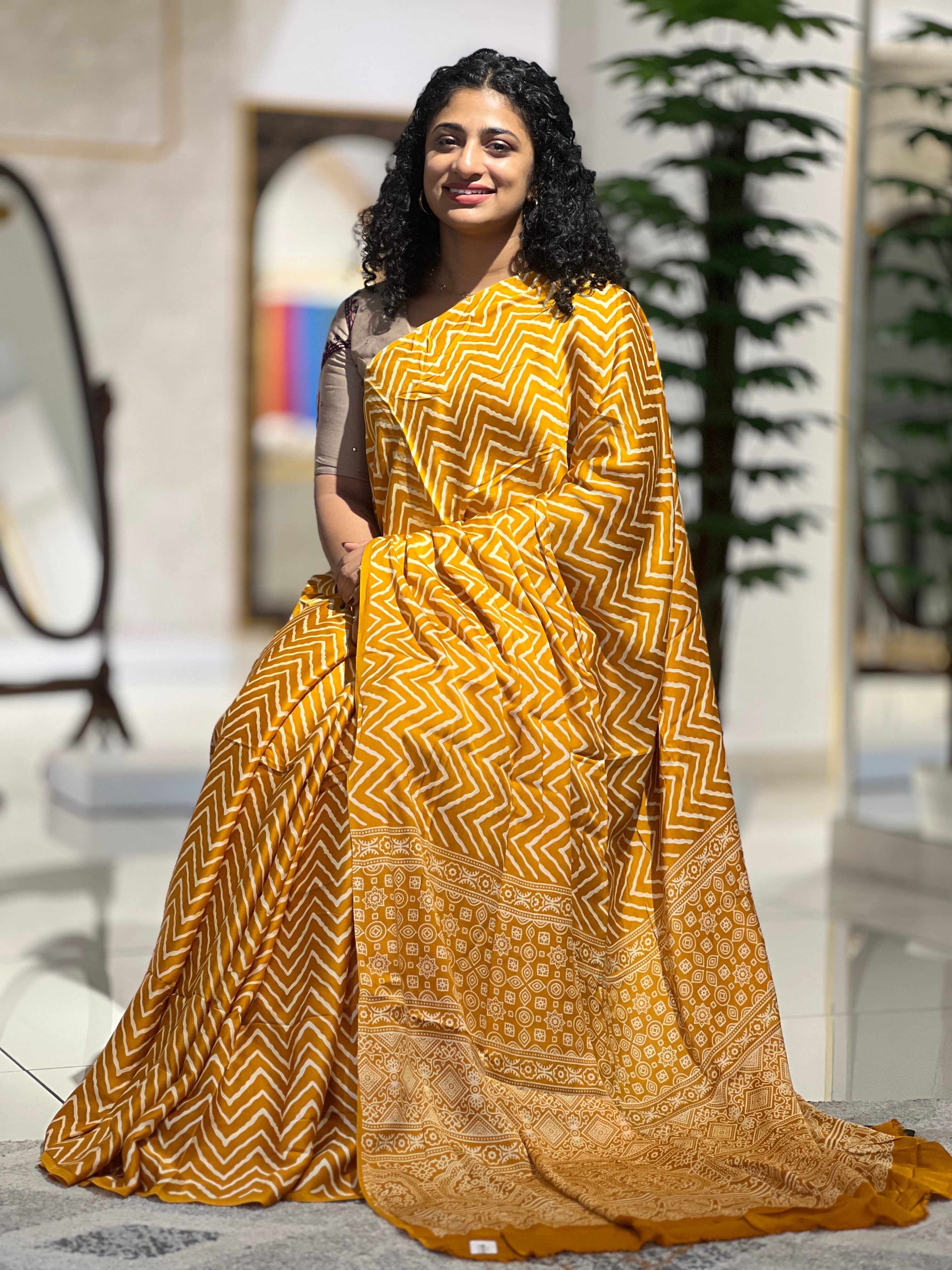 - Style: Zig Zag Printed, Pallu Ajrak Pattern